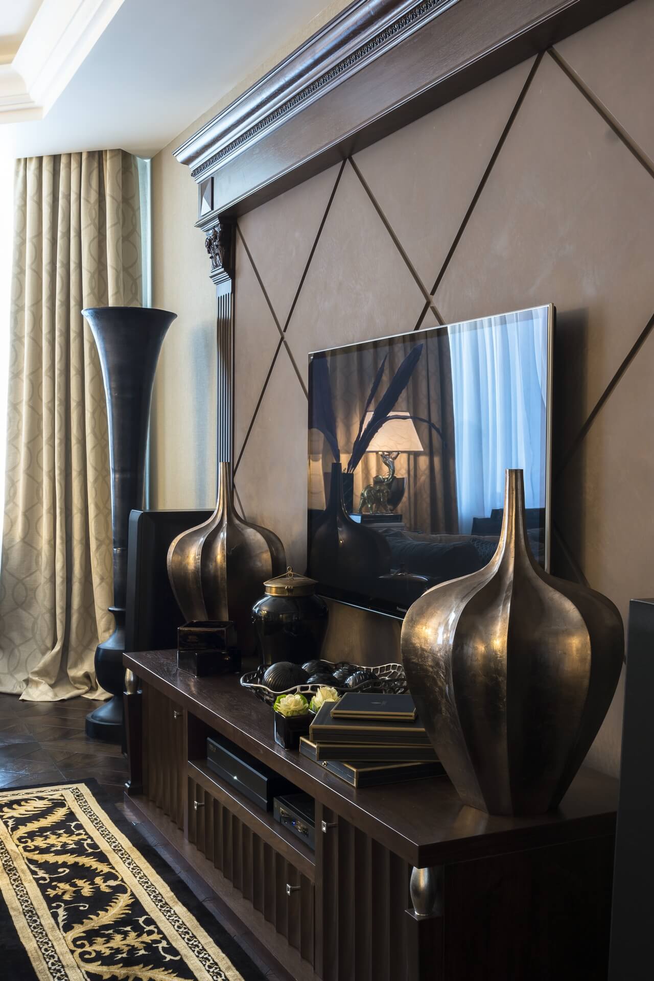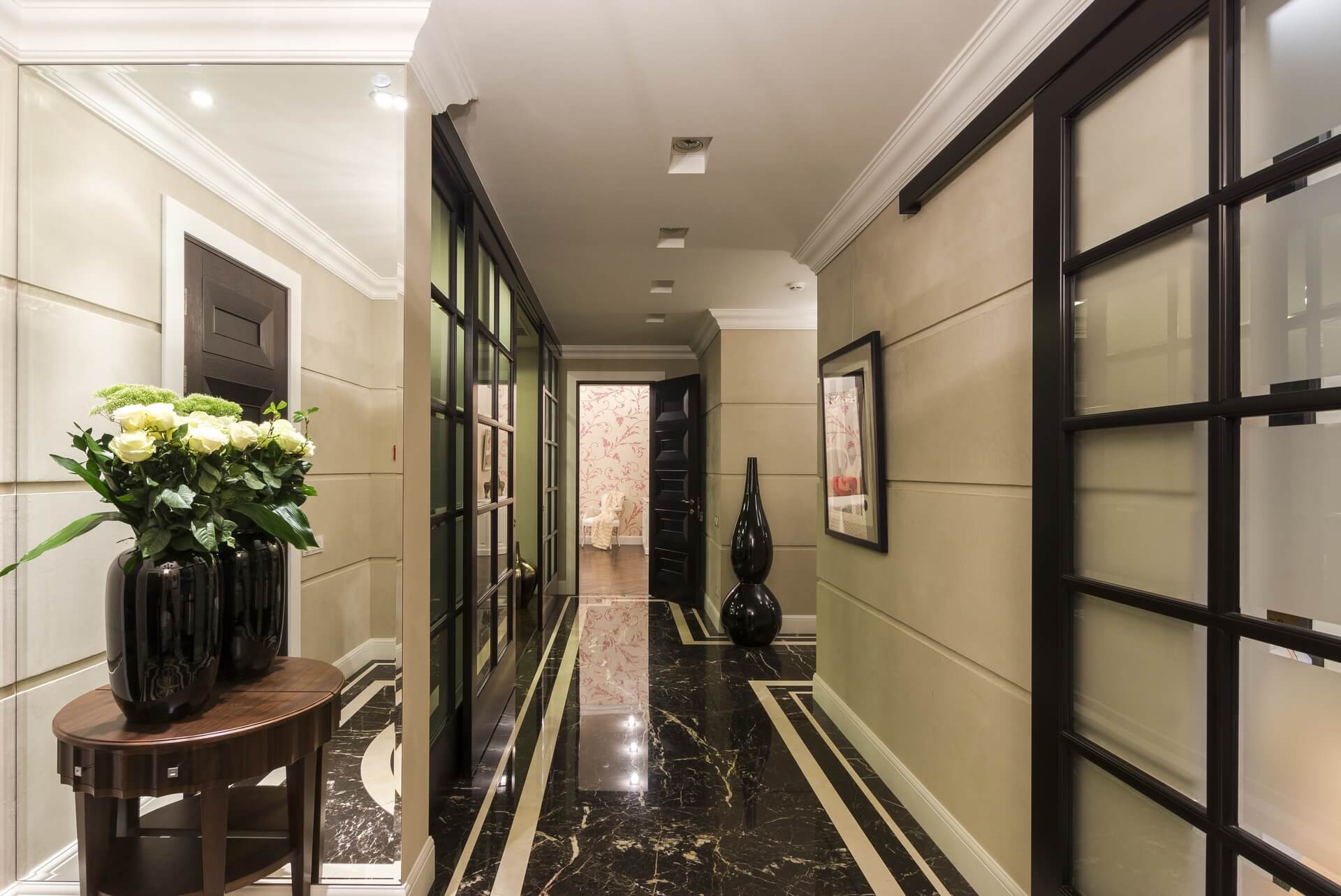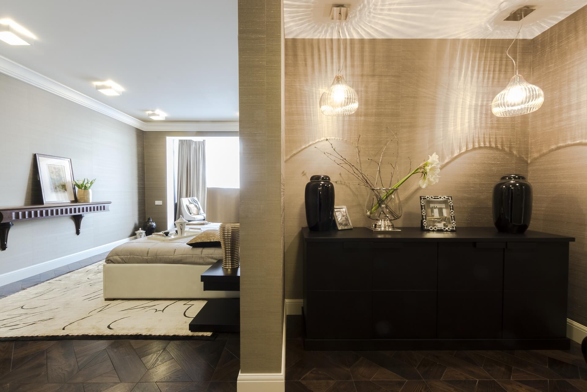 Изначально клиентам понравился дизайн квартиры в стиле современная классика. Исходя из этой концепции, мы начали работу проектом. Но чем дальше мы проектировали, тем больше проект приобретал элементы ар деко, материалы менялись в сторону более изысканных сочетаний.
