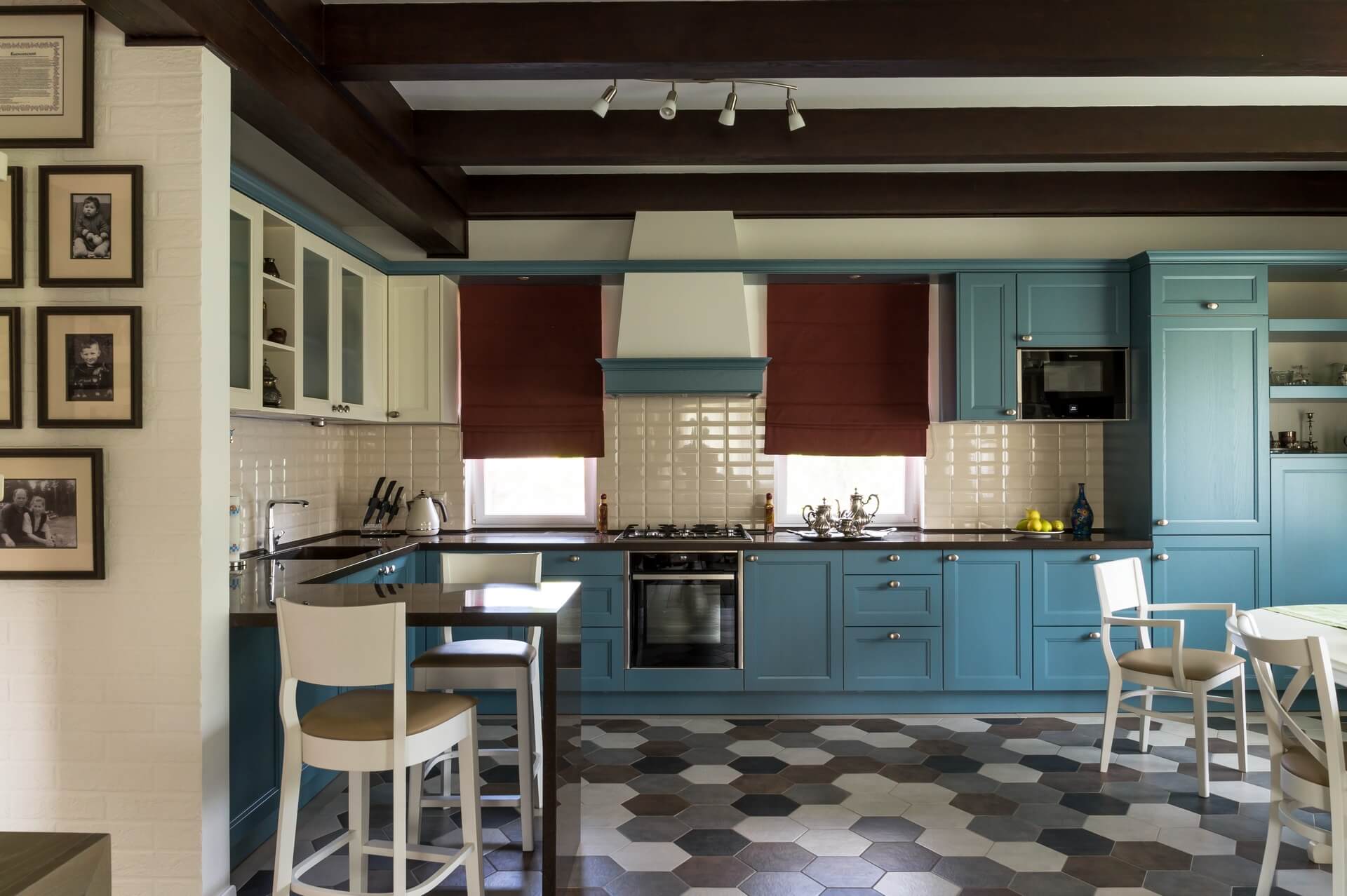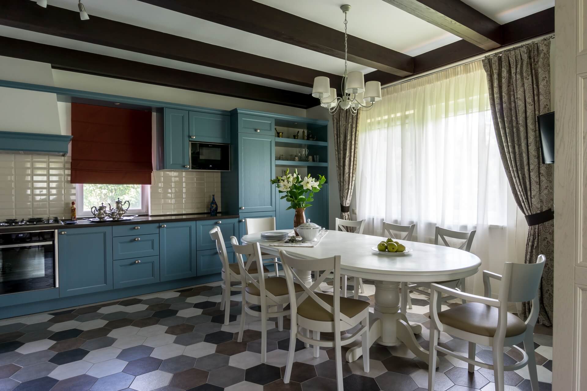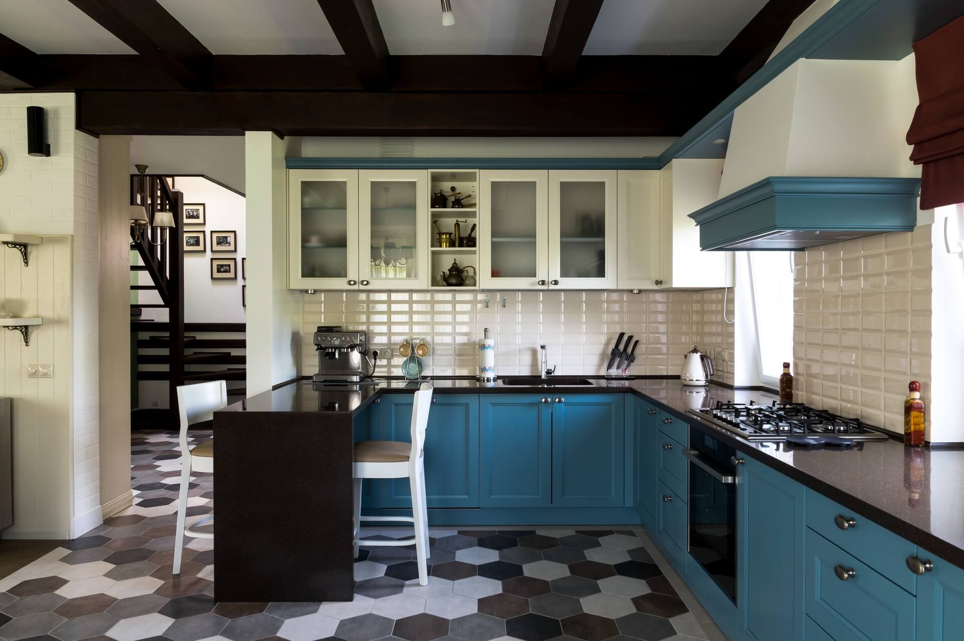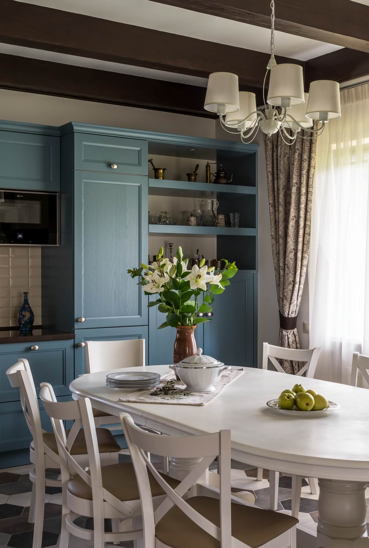 Сад был, дом тоже, но прошло время, и первый этаж пора было обновлять. Редизайн первого этажа дома дарит новую жизнь стилю современного Прованса. Потолочные балки мы сохранили — они задали тему «Прованса» и хороший ритм. Поменяли цветовую гамму на более светлую, выбрав голубую палитру, спроектировали и заказали новую мебель, поменяли текстиль . Графичная плитка на полу не позволила скатиться в совсем уж буржуазную историю, графичной получилась и зона лестничного холла и прихожей.