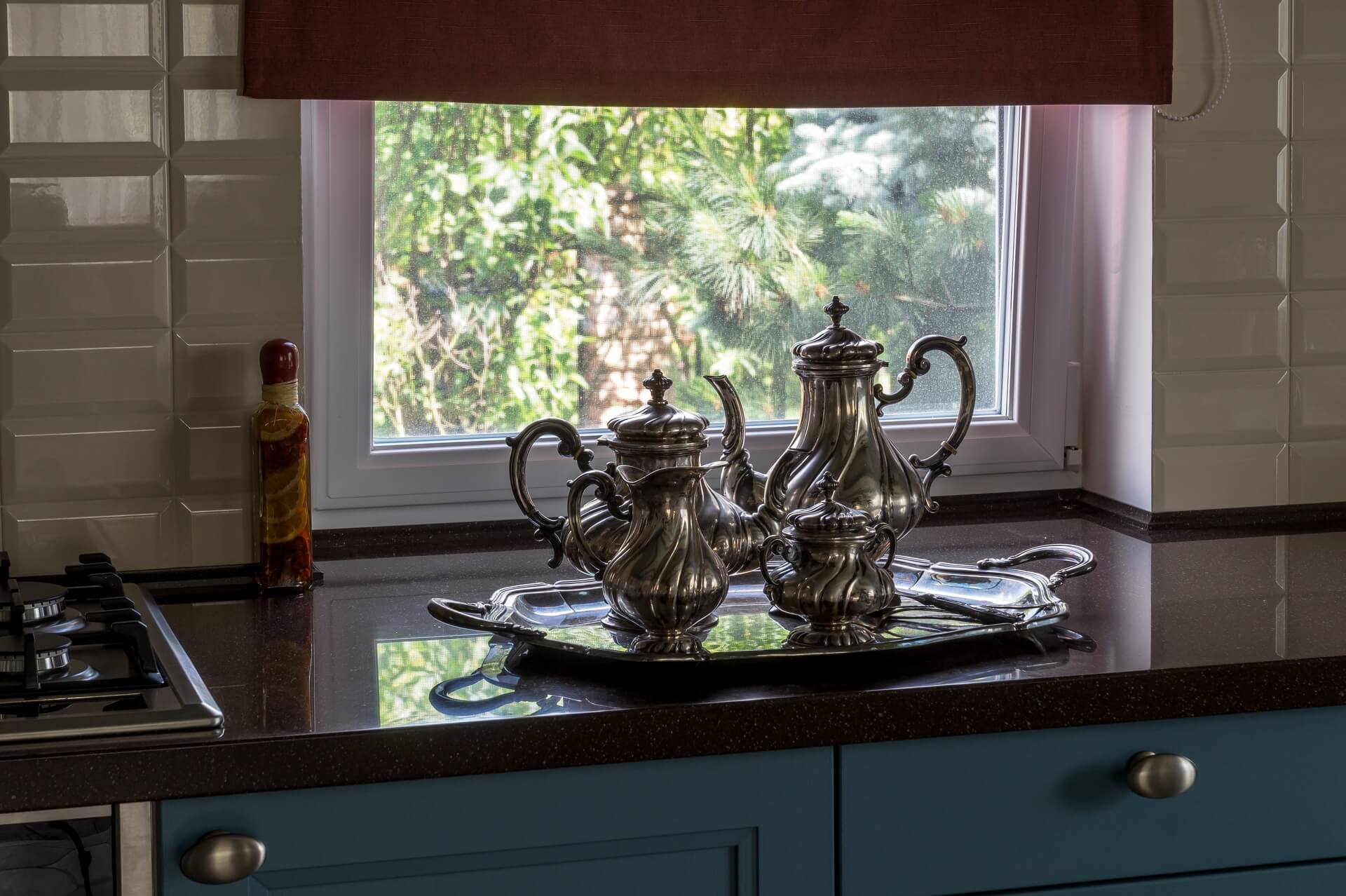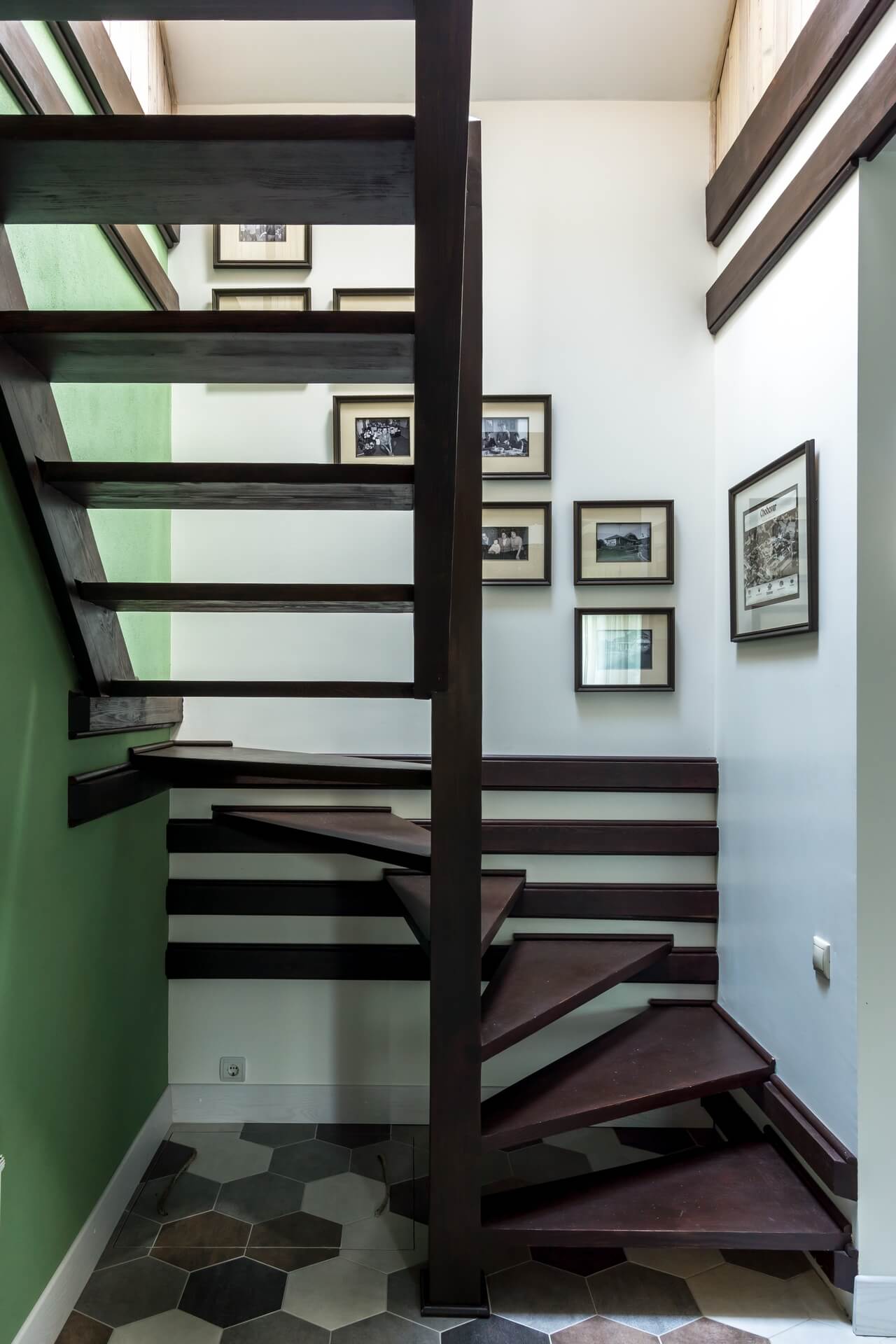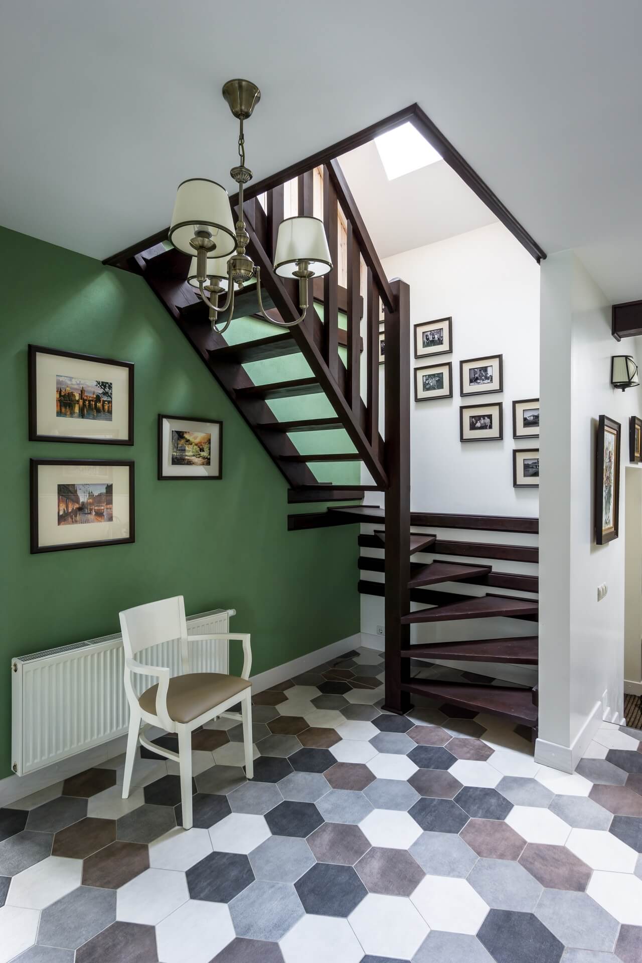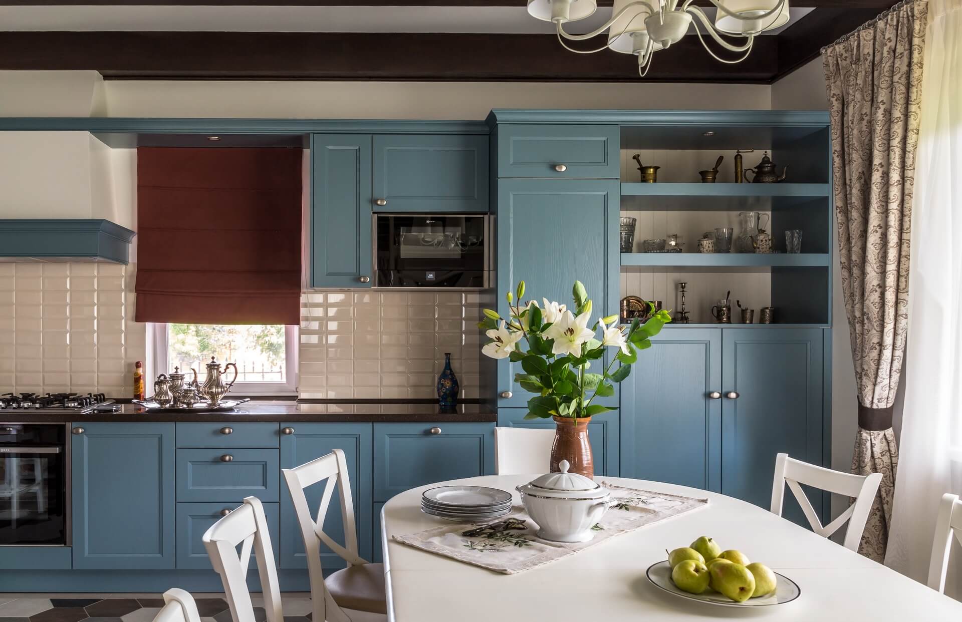 Сад был, дом тоже, но прошло время, и первый этаж пора было обновлять. Редизайн первого этажа дома дарит новую жизнь стилю современного Прованса. Потолочные балки мы сохранили — они задали тему «Прованса» и хороший ритм. Поменяли цветовую гамму на более светлую, выбрав голубую палитру, спроектировали и заказали новую мебель, поменяли текстиль . Графичная плитка на полу не позволила скатиться в совсем уж буржуазную историю, графичной получилась и зона лестничного холла и прихожей.