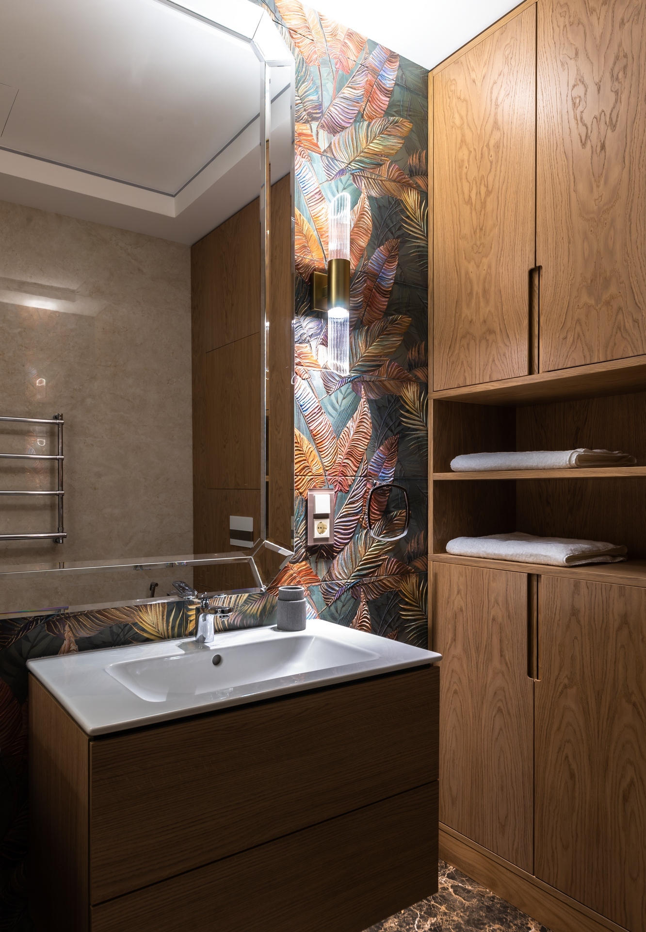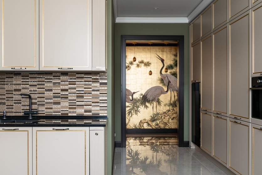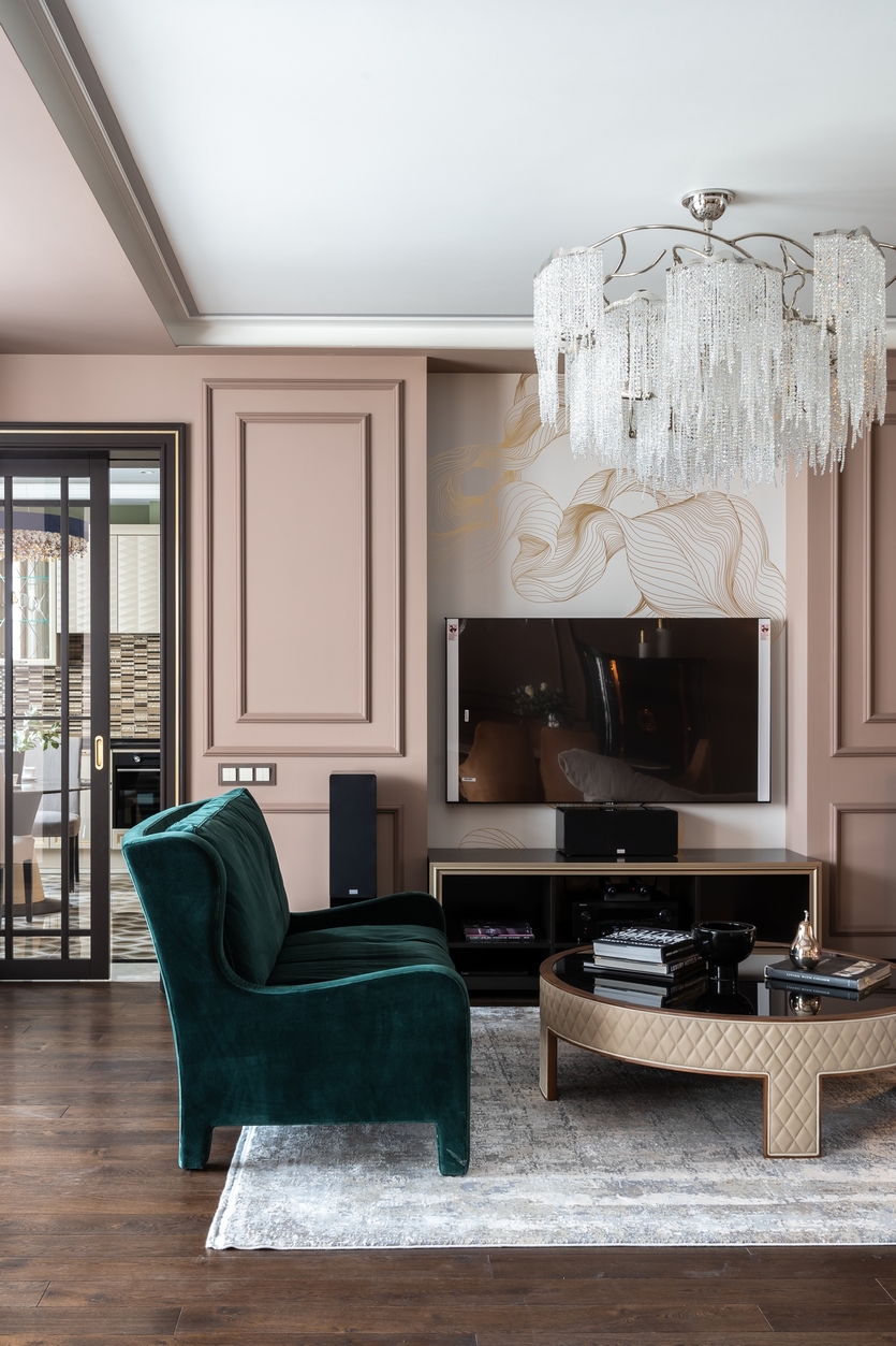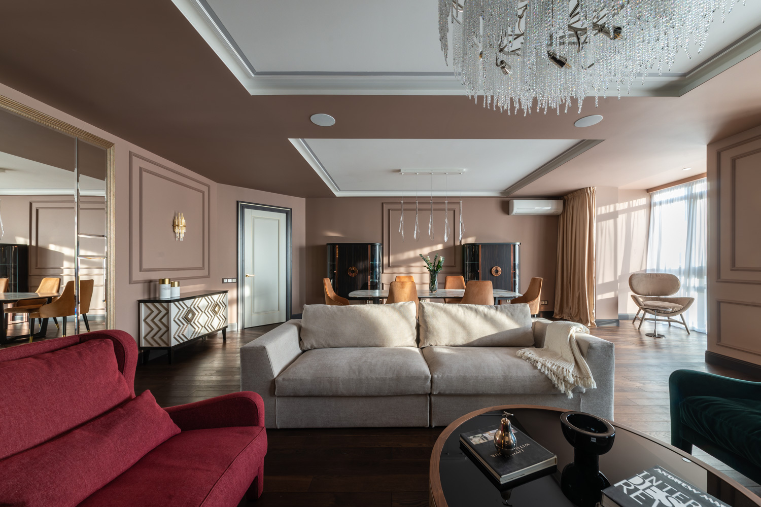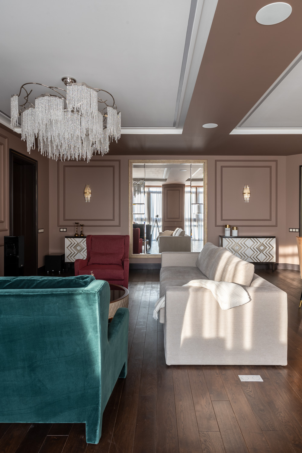Палитра интерьера получалась достаточно насыщенной и яркой. Ее основу составили оливковые и терракотовые тона, которые особенно нравятся хозяевам. Но чтобы домочадцы не сильно уставали от слишком ярких цветов, в жилых помещениях использовали нежную пастельную гамму, а в интерьерах кухни и кабинета — более плотные и темные тона.Стены кухни окрасили в сложный зеленый цвет Sage Green из палитры Little Green. При этом он не доминирует, так как в массе своей здесь больше светлых оттенков. Долгое время подбирали оттенок для гостиной, дизайнерам хотелось, чтобы она была уютной, обволакивающей. Поэтому остановились на цвете Ombre из палитры фабрики Argilie. На его фоне особенно выразительно смотрятся элементы декора и мебели. Кабинет — самое темное помещение во всей квартире. Для него выбрали сложный шоколадный оттенок. В такой камерной атмосфере проще сосредоточиться, нет никаких ярких деталей, ничто не отвлекает от работы.