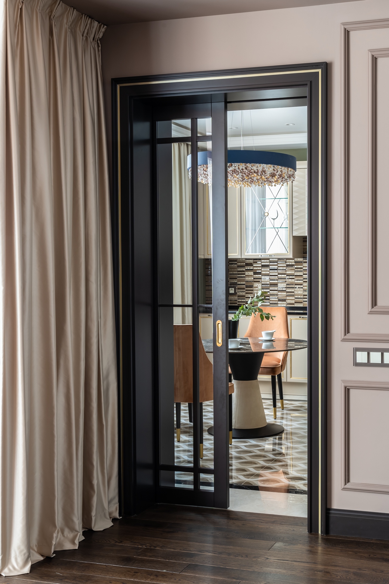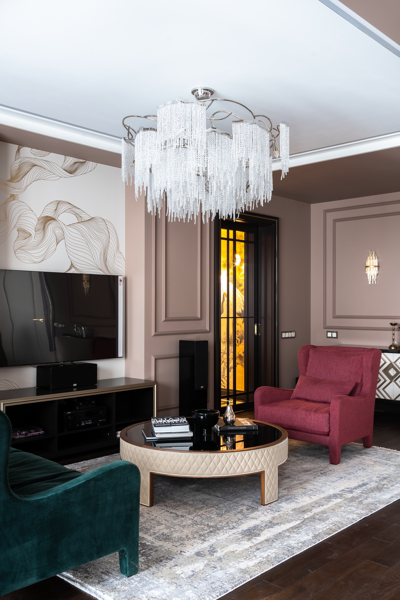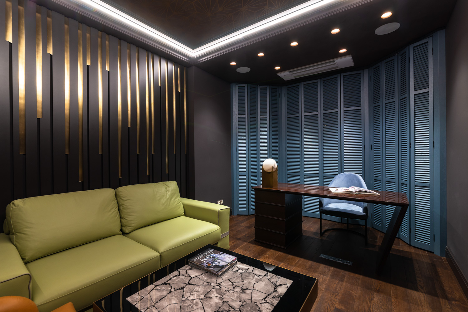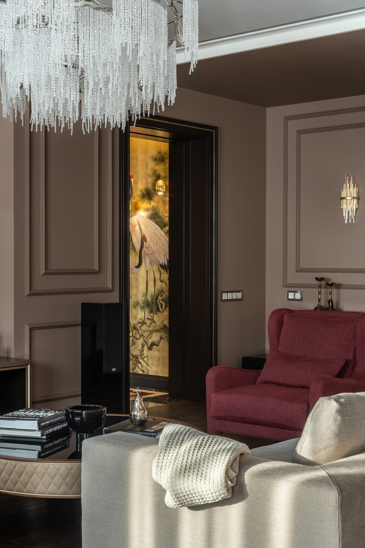 Палитра интерьера получалась достаточно насыщенной и яркой. Ее основу составили оливковые и терракотовые тона, которые особенно нравятся хозяевам. Но чтобы домочадцы не сильно уставали от слишком ярких цветов, в жилых помещениях использовали нежную пастельную гамму, а в интерьерах кухни и кабинета — более плотные и темные тона.Стены кухни окрасили в сложный зеленый цвет Sage Green из палитры Little Green. При этом он не доминирует, так как в массе своей здесь больше светлых оттенков. Долгое время подбирали оттенок для гостиной, дизайнерам хотелось, чтобы она была уютной, обволакивающей. Поэтому остановились на цвете Ombre из палитры фабрики Argilie. На его фоне особенно выразительно смотрятся элементы декора и мебели. Кабинет — самое темное помещение во всей квартире. Для него выбрали сложный шоколадный оттенок. В такой камерной атмосфере проще сосредоточиться, нет никаких ярких деталей, ничто не отвлекает от работы.