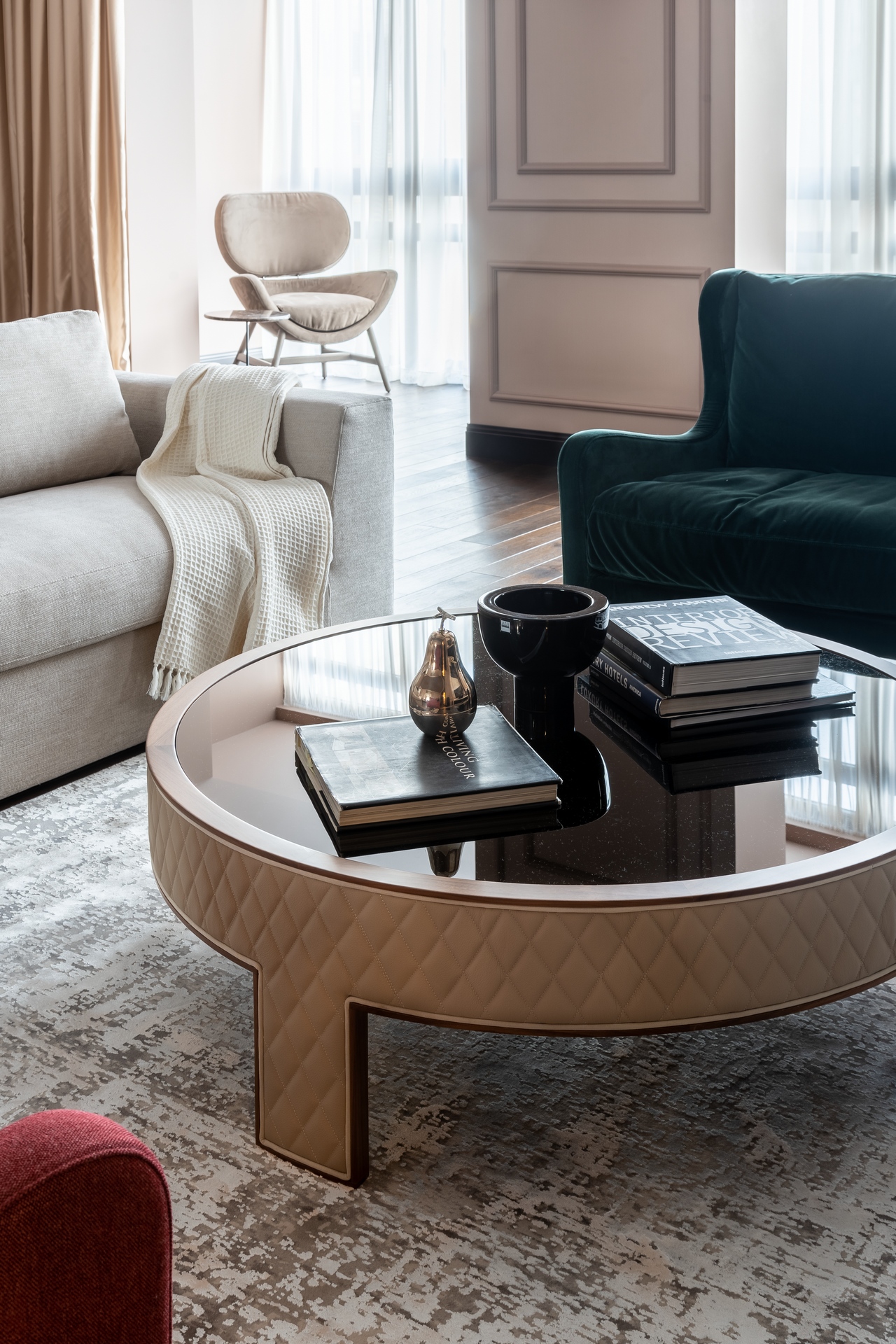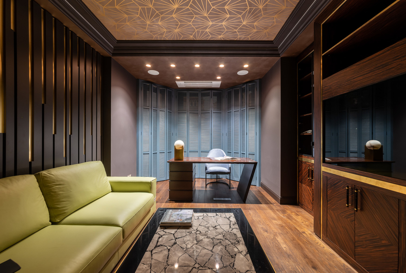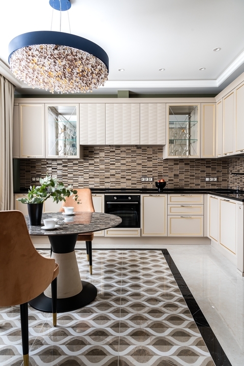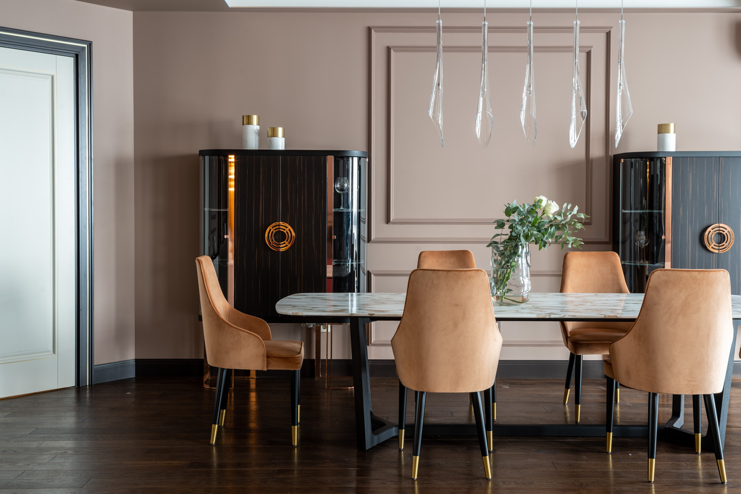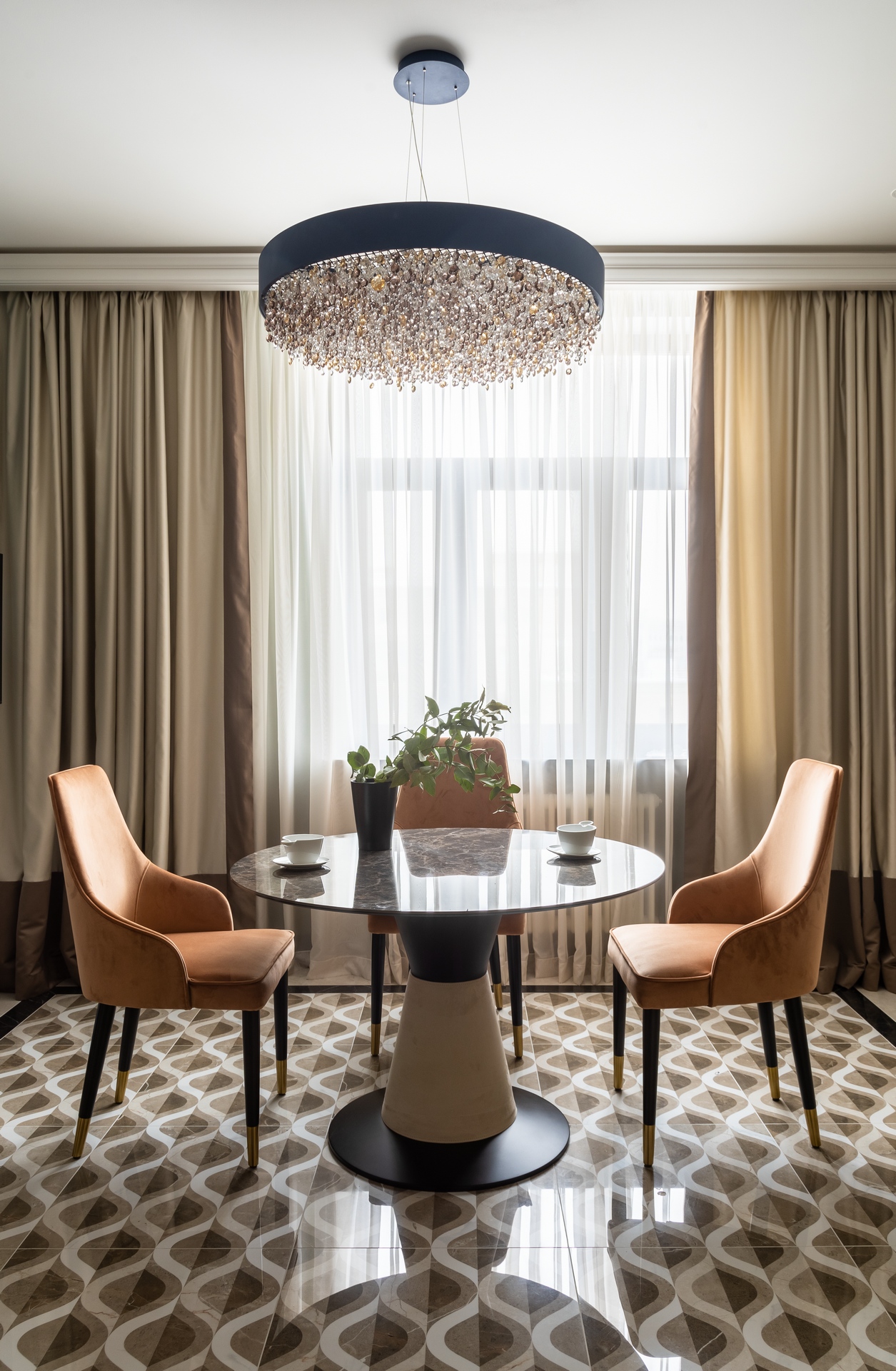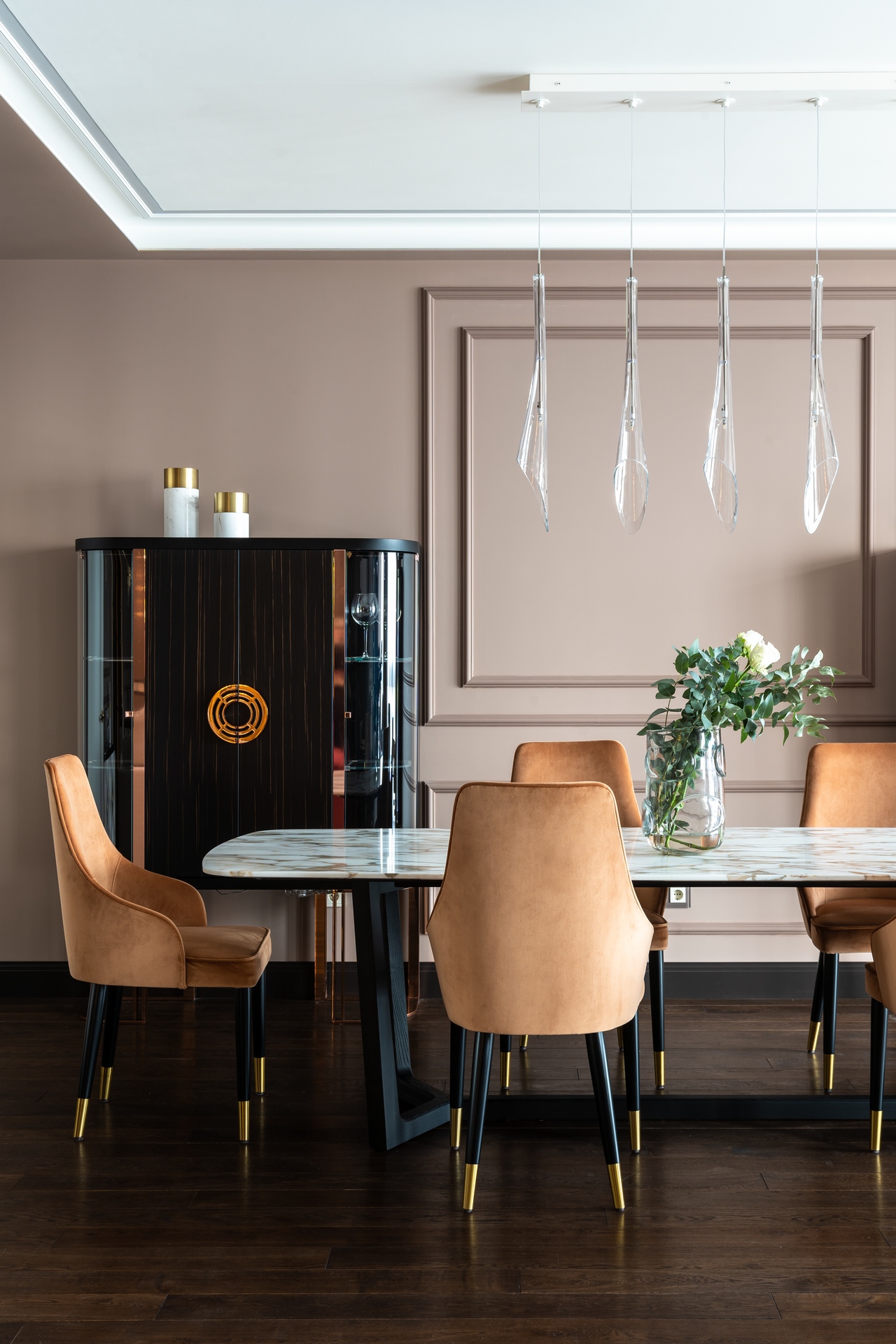 Палитра интерьера получалась достаточно насыщенной и яркой. Ее основу составили оливковые и терракотовые тона, которые особенно нравятся хозяевам. Но чтобы домочадцы не сильно уставали от слишком ярких цветов, в жилых помещениях использовали нежную пастельную гамму, а в интерьерах кухни и кабинета — более плотные и темные тона.Стены кухни окрасили в сложный зеленый цвет Sage Green из палитры Little Green. При этом он не доминирует, так как в массе своей здесь больше светлых оттенков. Долгое время подбирали оттенок для гостиной, дизайнерам хотелось, чтобы она была уютной, обволакивающей. Поэтому остановились на цвете Ombre из палитры фабрики Argilie. На его фоне особенно выразительно смотрятся элементы декора и мебели. Кабинет — самое темное помещение во всей квартире. Для него выбрали сложный шоколадный оттенок. В такой камерной атмосфере проще сосредоточиться, нет никаких ярких деталей, ничто не отвлекает от работы.