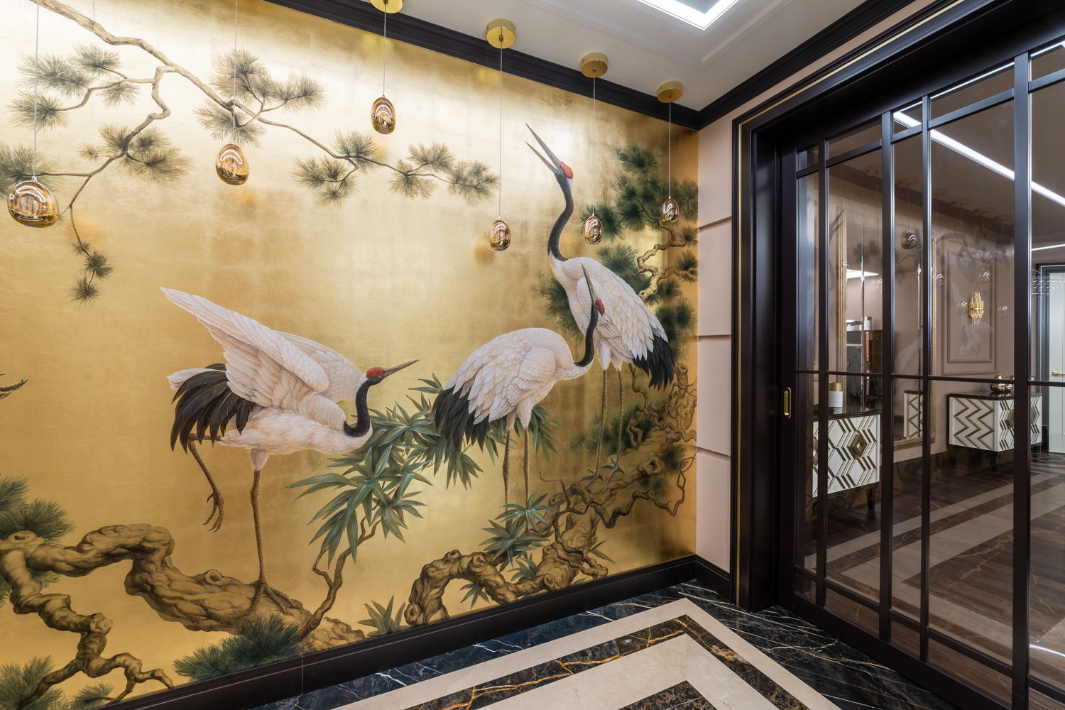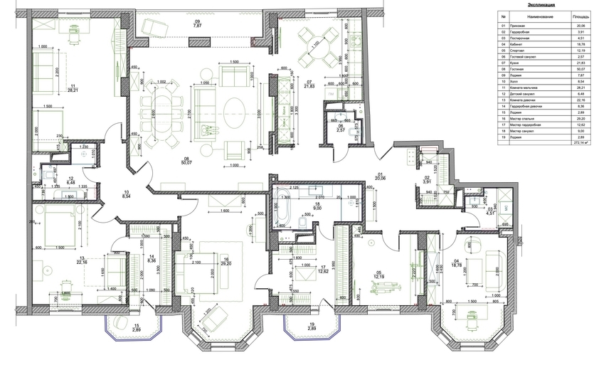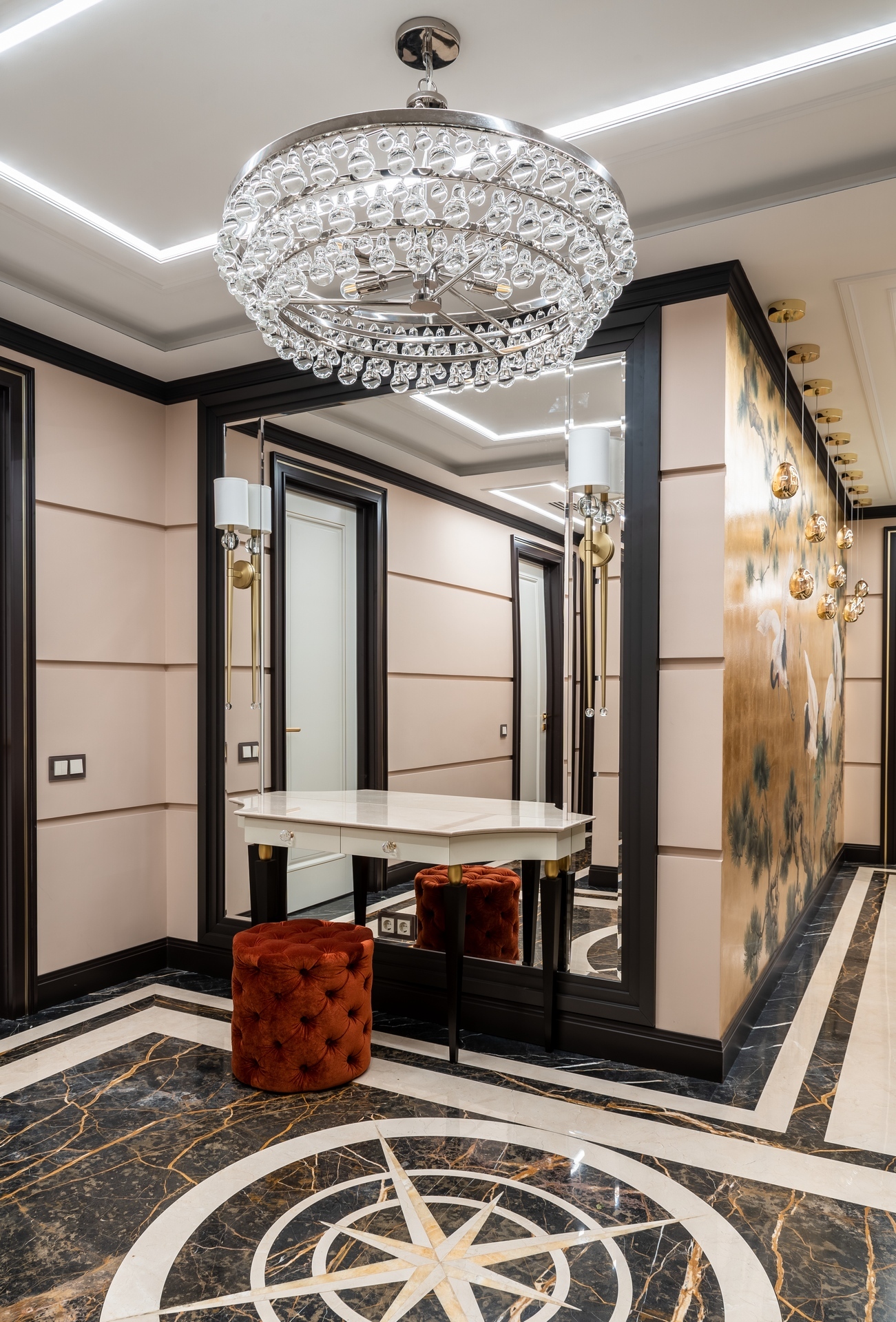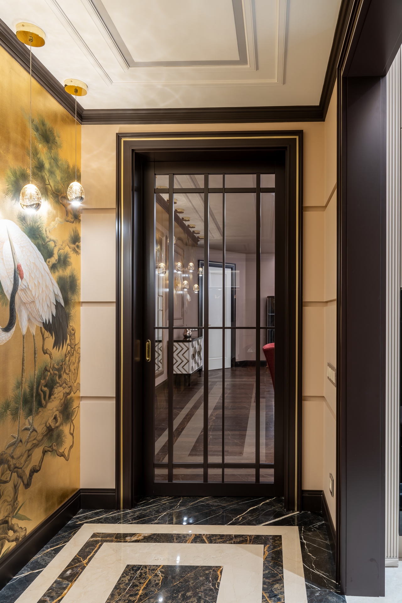 Палитра интерьера получалась достаточно насыщенной и яркой. Ее основу составили оливковые и терракотовые тона, которые особенно нравятся хозяевам. Но чтобы домочадцы не сильно уставали от слишком ярких цветов, в жилых помещениях использовали нежную пастельную гамму, а в интерьерах кухни и кабинета — более плотные и темные тона.Стены кухни окрасили в сложный зеленый цвет Sage Green из палитры Little Green. При этом он не доминирует, так как в массе своей здесь больше светлых оттенков. Долгое время подбирали оттенок для гостиной, дизайнерам хотелось, чтобы она была уютной, обволакивающей. Поэтому остановились на цвете Ombre из палитры фабрики Argilie. На его фоне особенно выразительно смотрятся элементы декора и мебели. Кабинет — самое темное помещение во всей квартире. Для него выбрали сложный шоколадный оттенок. В такой камерной атмосфере проще сосредоточиться, нет никаких ярких деталей, ничто не отвлекает от работы.