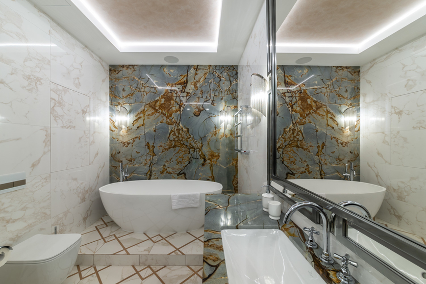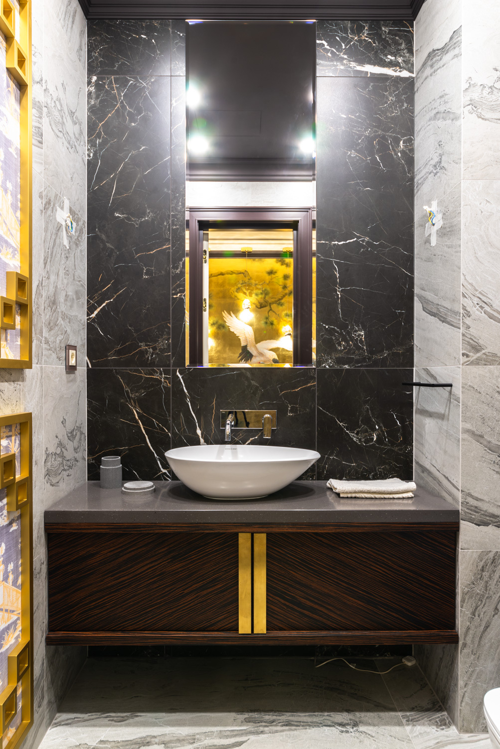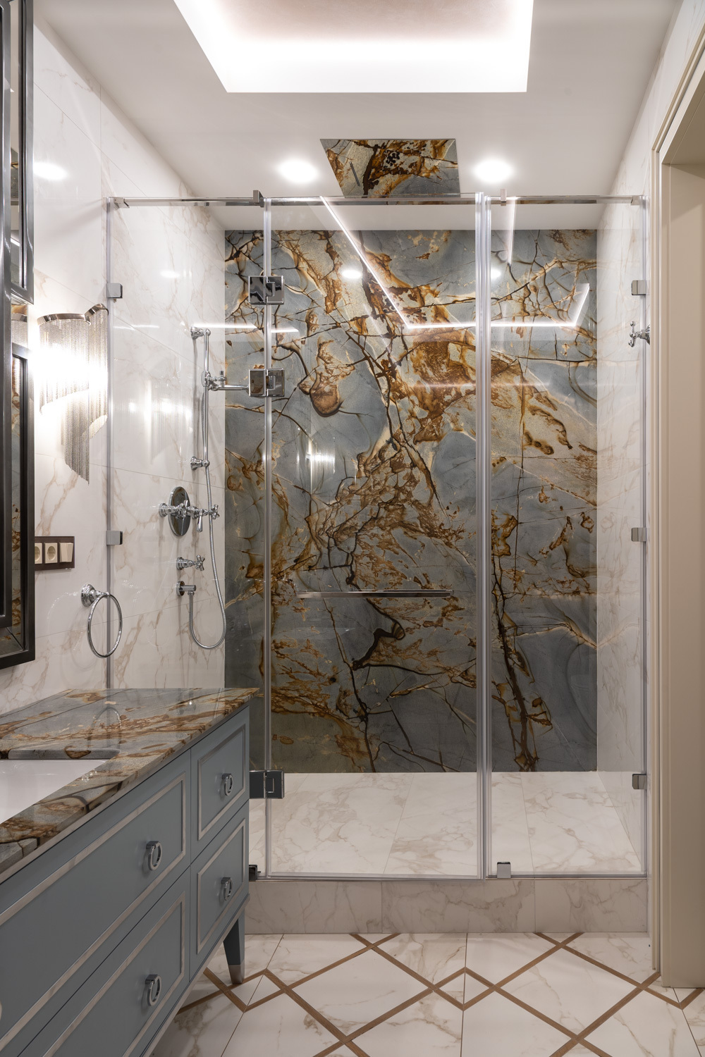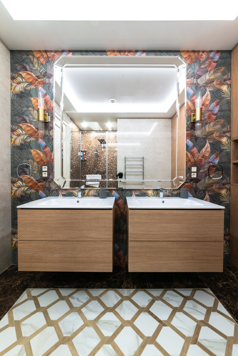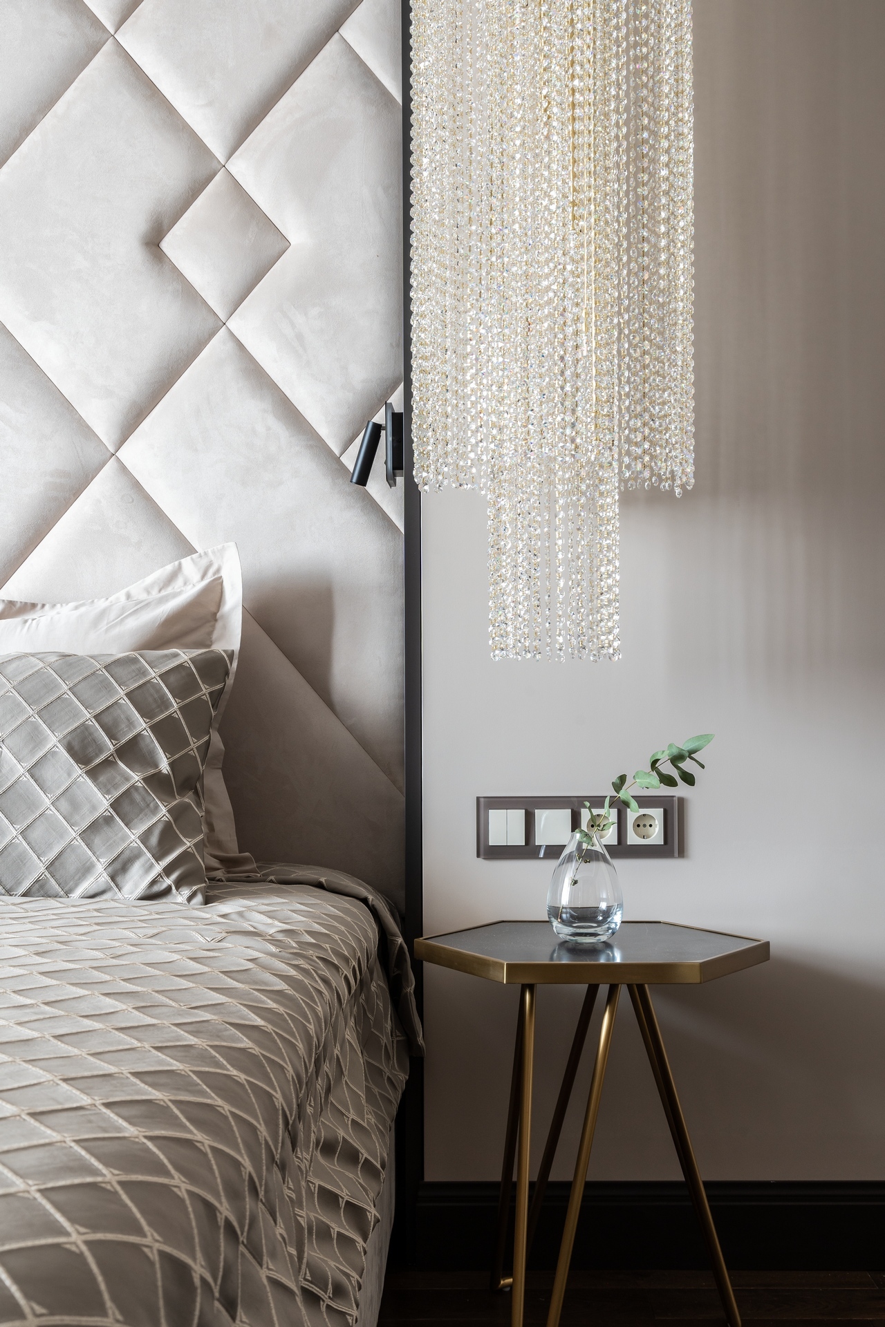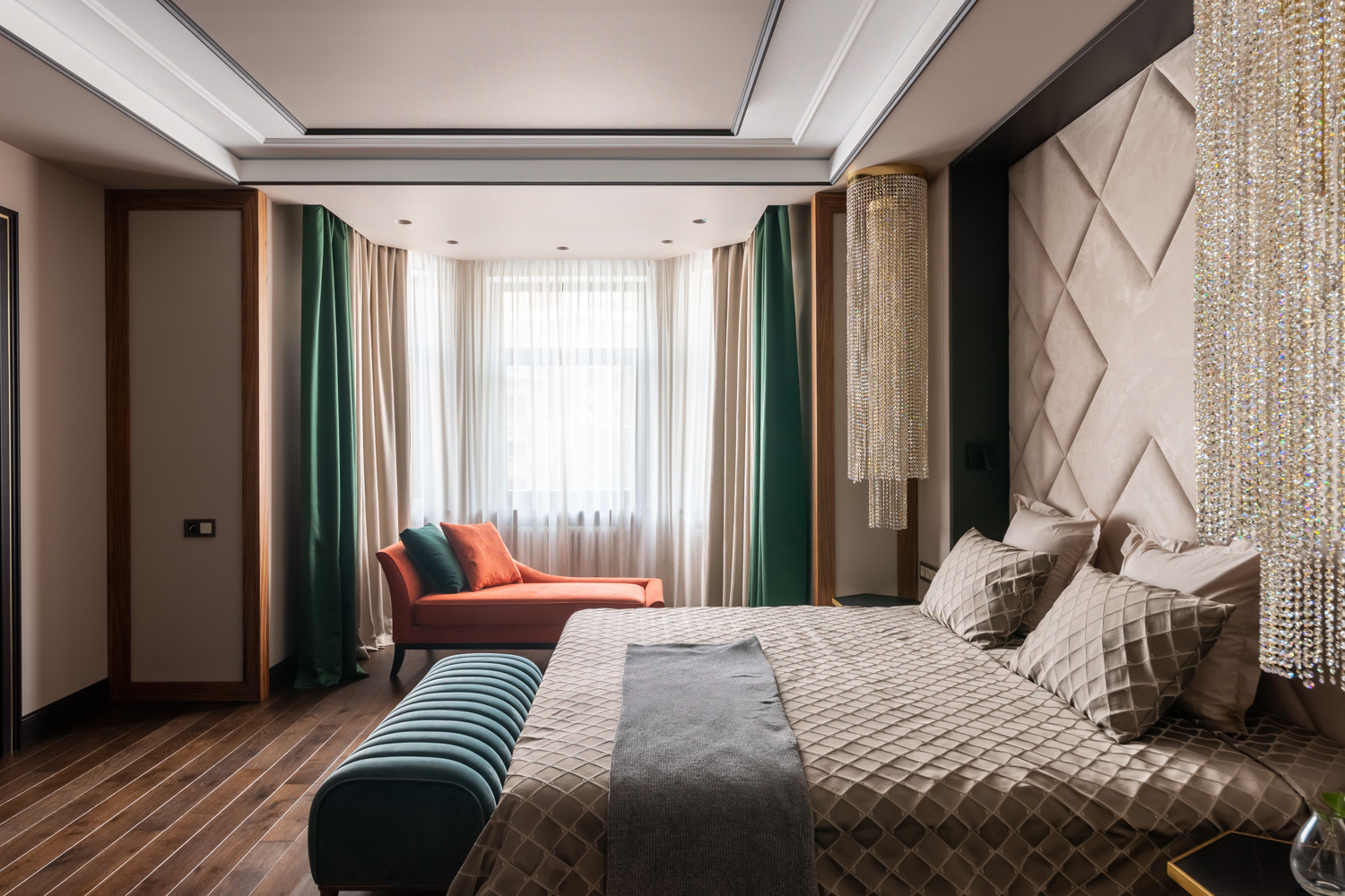 Палитра интерьера получалась достаточно насыщенной и яркой. Ее основу составили оливковые и терракотовые тона, которые особенно нравятся хозяевам. Но чтобы домочадцы не сильно уставали от слишком ярких цветов, в жилых помещениях использовали нежную пастельную гамму, а в интерьерах кухни и кабинета — более плотные и темные тона.Стены кухни окрасили в сложный зеленый цвет Sage Green из палитры Little Green. При этом он не доминирует, так как в массе своей здесь больше светлых оттенков. Долгое время подбирали оттенок для гостиной, дизайнерам хотелось, чтобы она была уютной, обволакивающей. Поэтому остановились на цвете Ombre из палитры фабрики Argilie. На его фоне особенно выразительно смотрятся элементы декора и мебели. Кабинет — самое темное помещение во всей квартире. Для него выбрали сложный шоколадный оттенок. В такой камерной атмосфере проще сосредоточиться, нет никаких ярких деталей, ничто не отвлекает от работы.