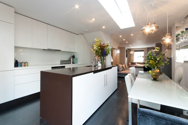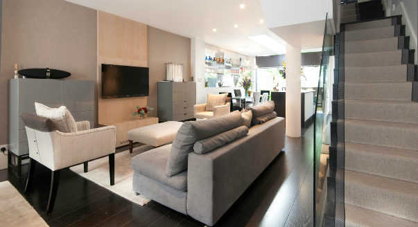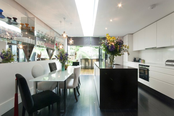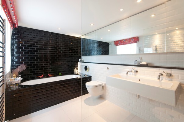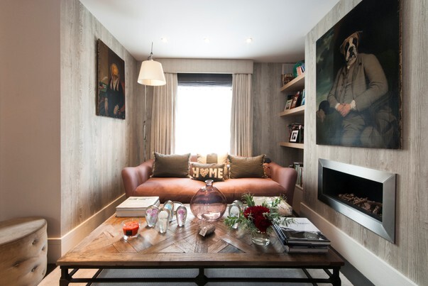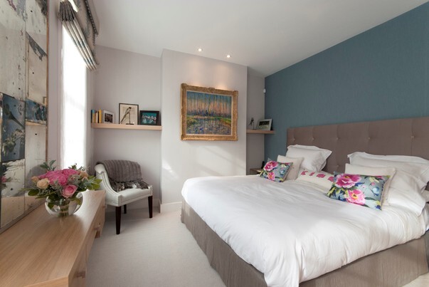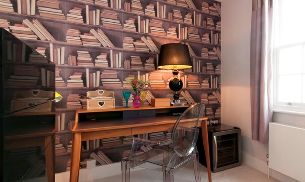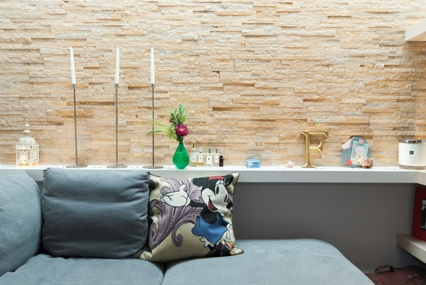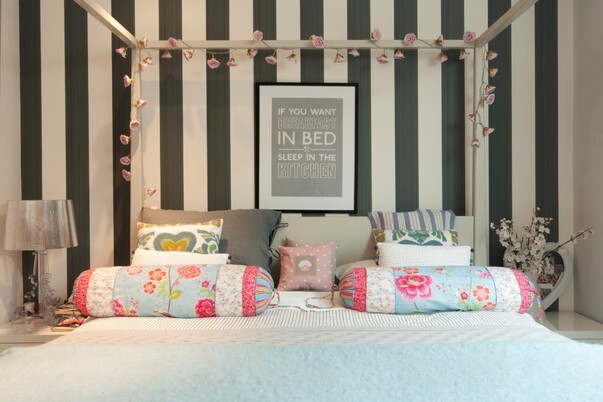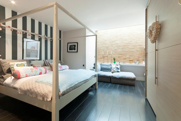 Спальня развивает сюрреалистичную тематику. Поэтому в ней появляется черно-белая стена в полоску (фактически, она является изголовьем). Интересно, что в пространстве спальни несколько зон. И помимо спальной, есть еще и будуарная с небольшой лежанкой и косметической зоной. ©