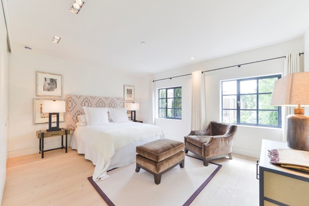 7. Гостевая спальня. А здесь есть место теплой атмосфере. Цвет пола, фактуры, мягкое изголовье... Кресло в стиле ар деко и белый высокий плинтус придают комнате легкий флер буржуазности.