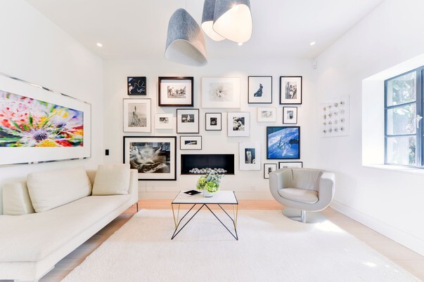 3. Гостевая комната — картинная галерея в миниатюре. Интересный прием: камин интегрирован в стену совсем незаметно. Как еще один предмет искусства.
