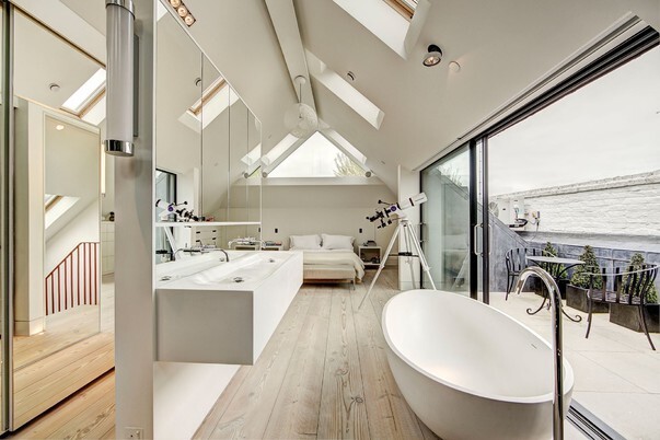 5. Мансарда. Нежнейшая, тонкая, воздушная спальня, объединенная с ванной! Минималистичная раковина, напольная ванна, светлый натуральный пол... Небольшая мечтательная веранда. Если интерьер гостиной требует внимания к себе, то здесь хочется расслабится и помечтать об Адриатическом море. Ну, и опять же: архитектура мансарды с двускатной крышей и треугольным окном в торце задает определенный тон всему интерьеру.