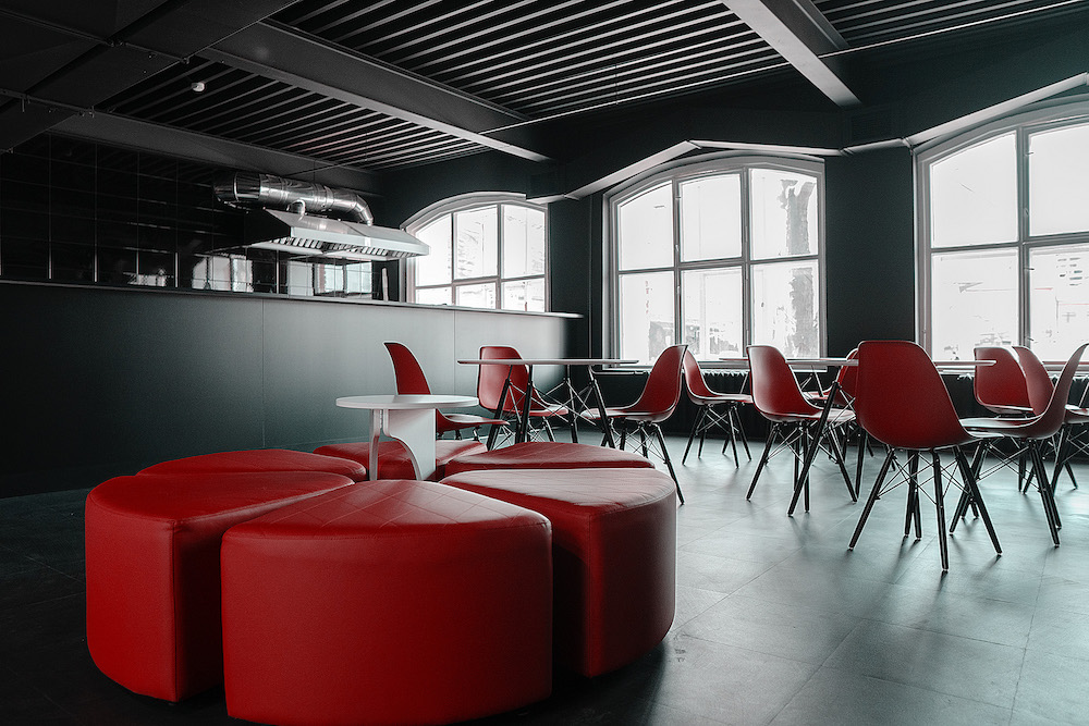 Концепция, разработанная для клуба, была полностью реализована на его главной площадке, которая находится на территории Трехгорной Мануфактуры. Грамотное планировочное решение игровых зон, организация рабочих мест для сотрудников, кафе и стойка ресепшн — все это было продумано до мельчайших деталей.