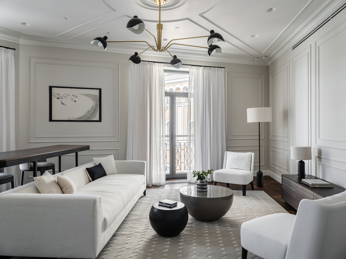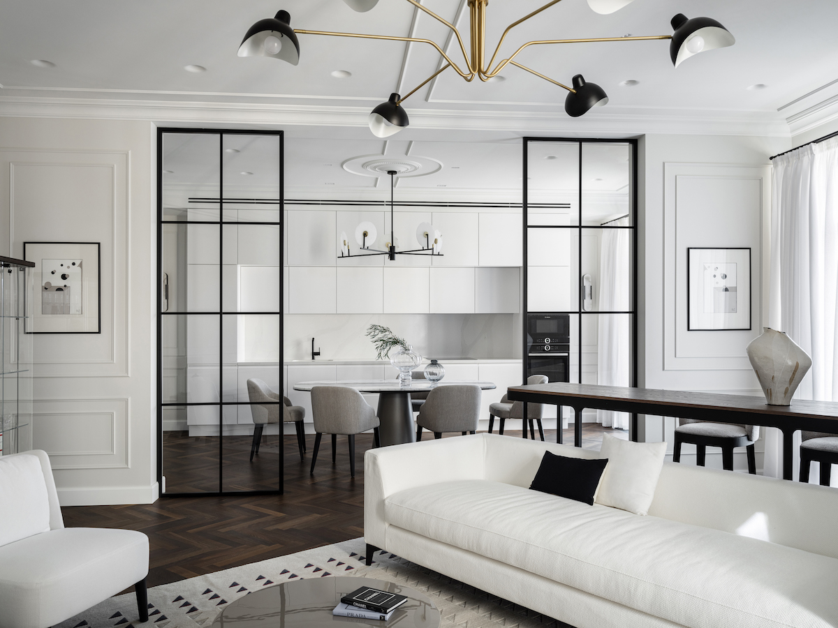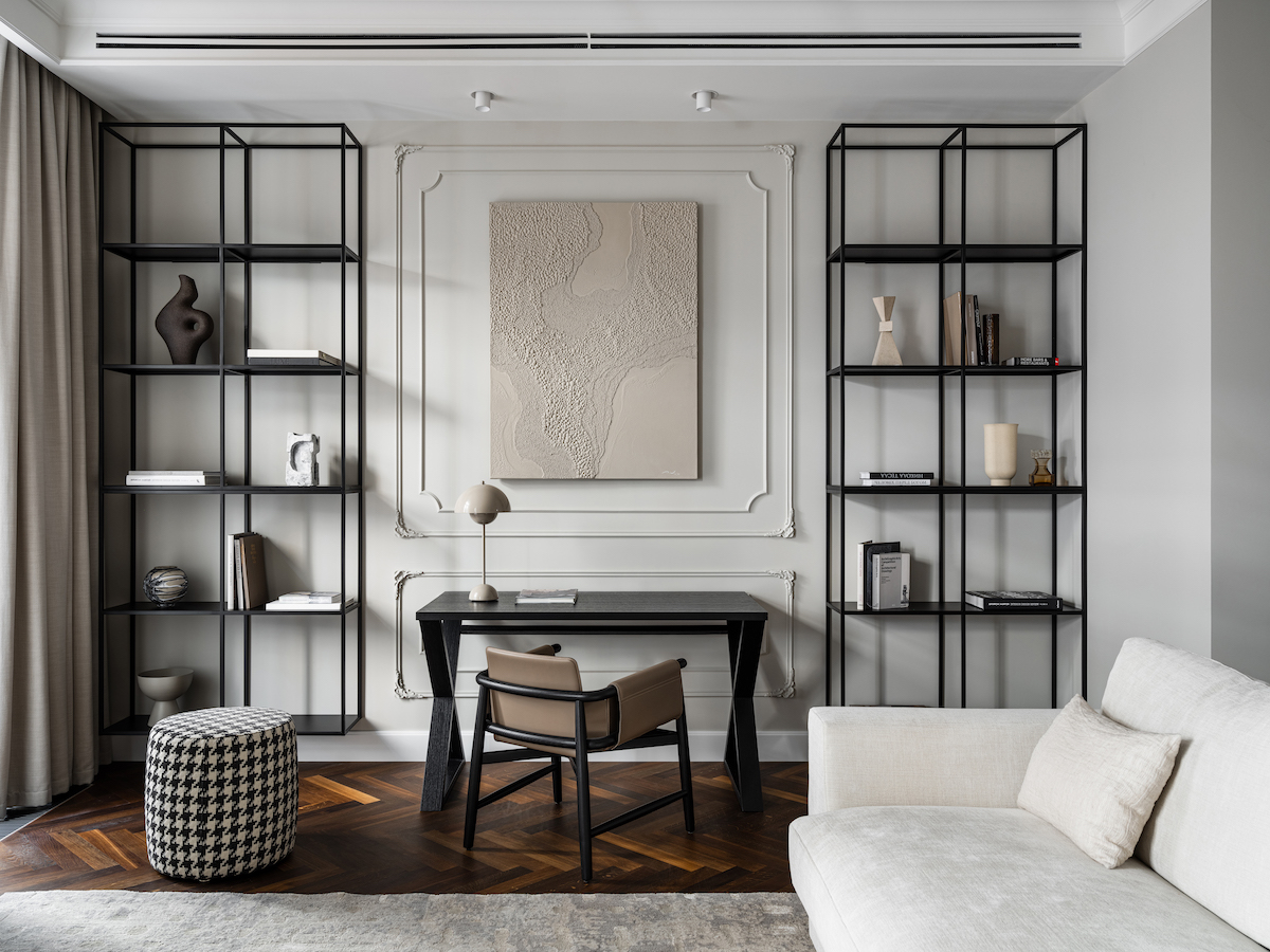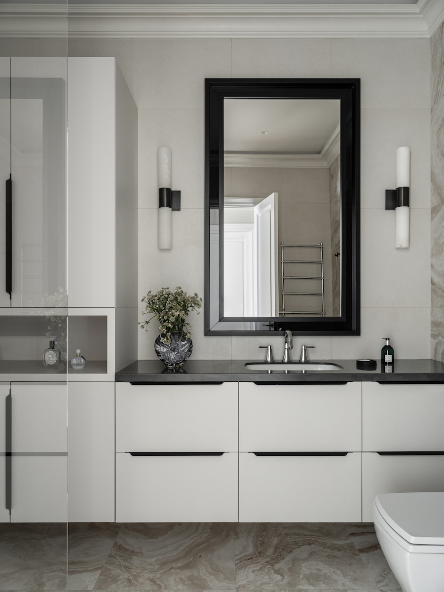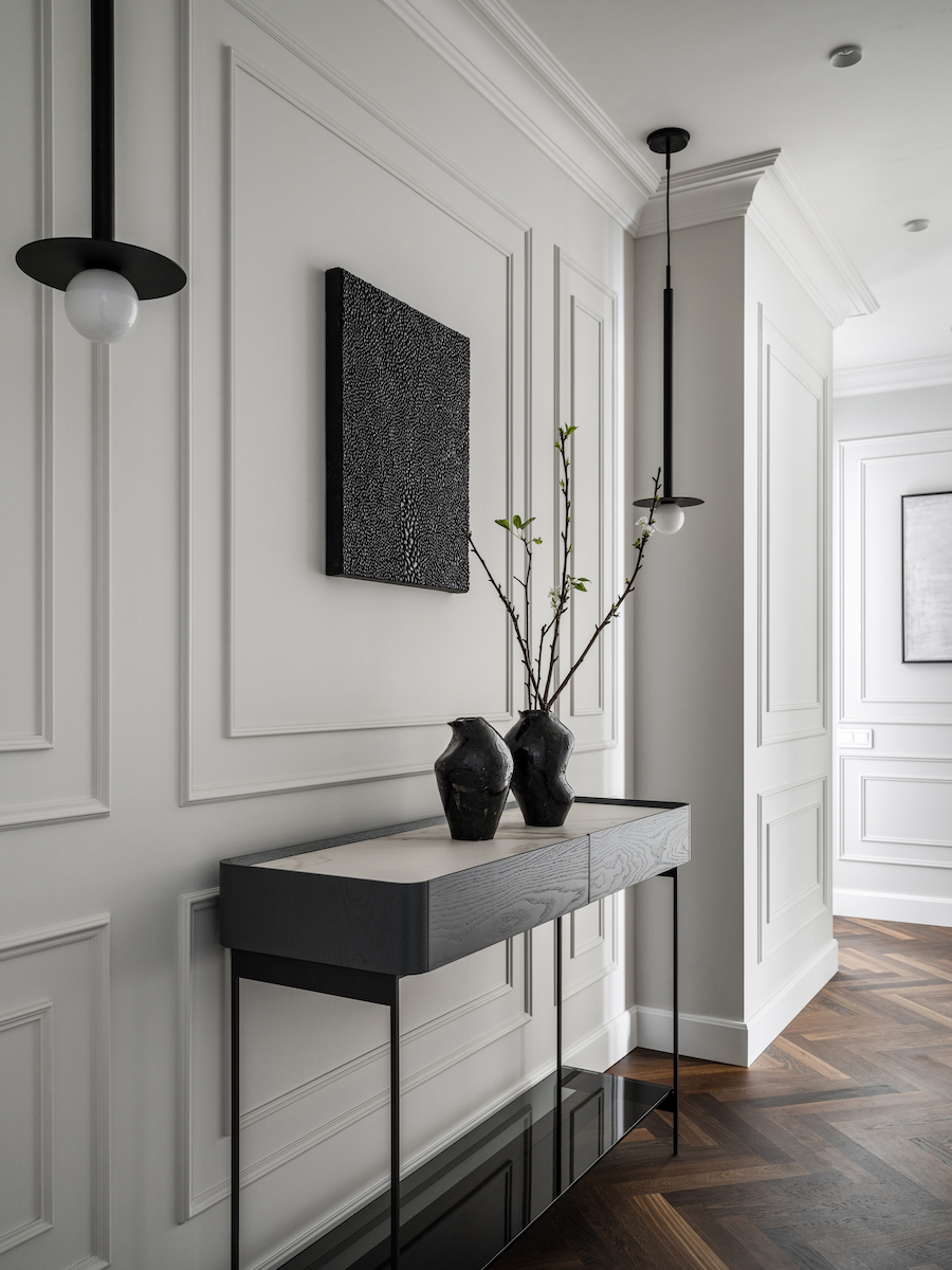 Воплощение элегантности и гармонии: Квартира в ЖК «Софийский». Современная классика с черными графическими акцентами, классическими элементами и мебелью в современном стиле. Особое внимание к каждой детали — интерьер, отражающий утонченность и комфорт.
