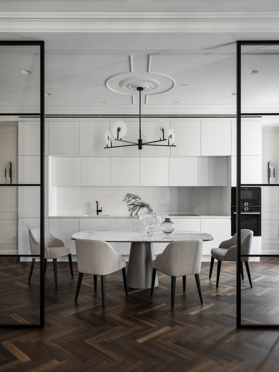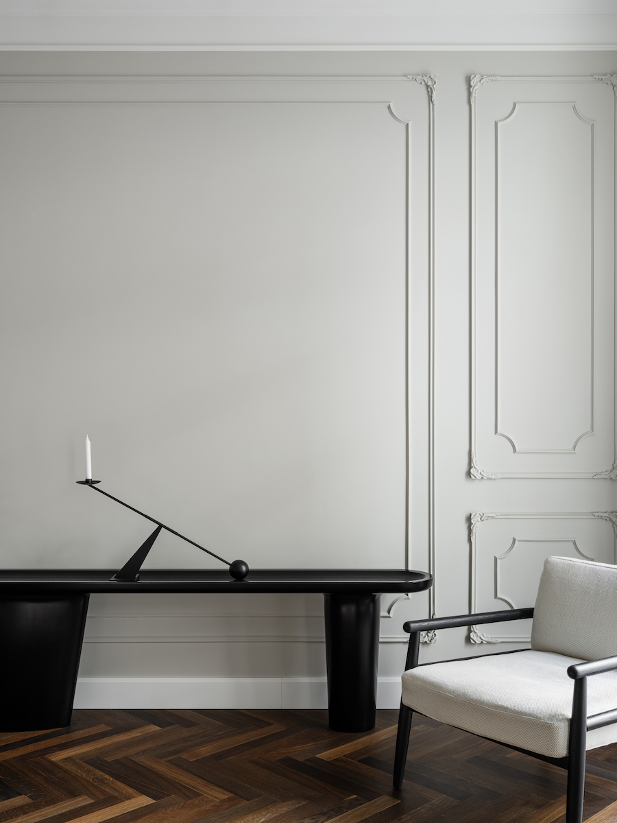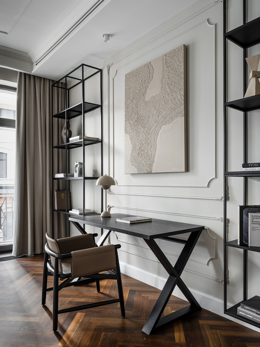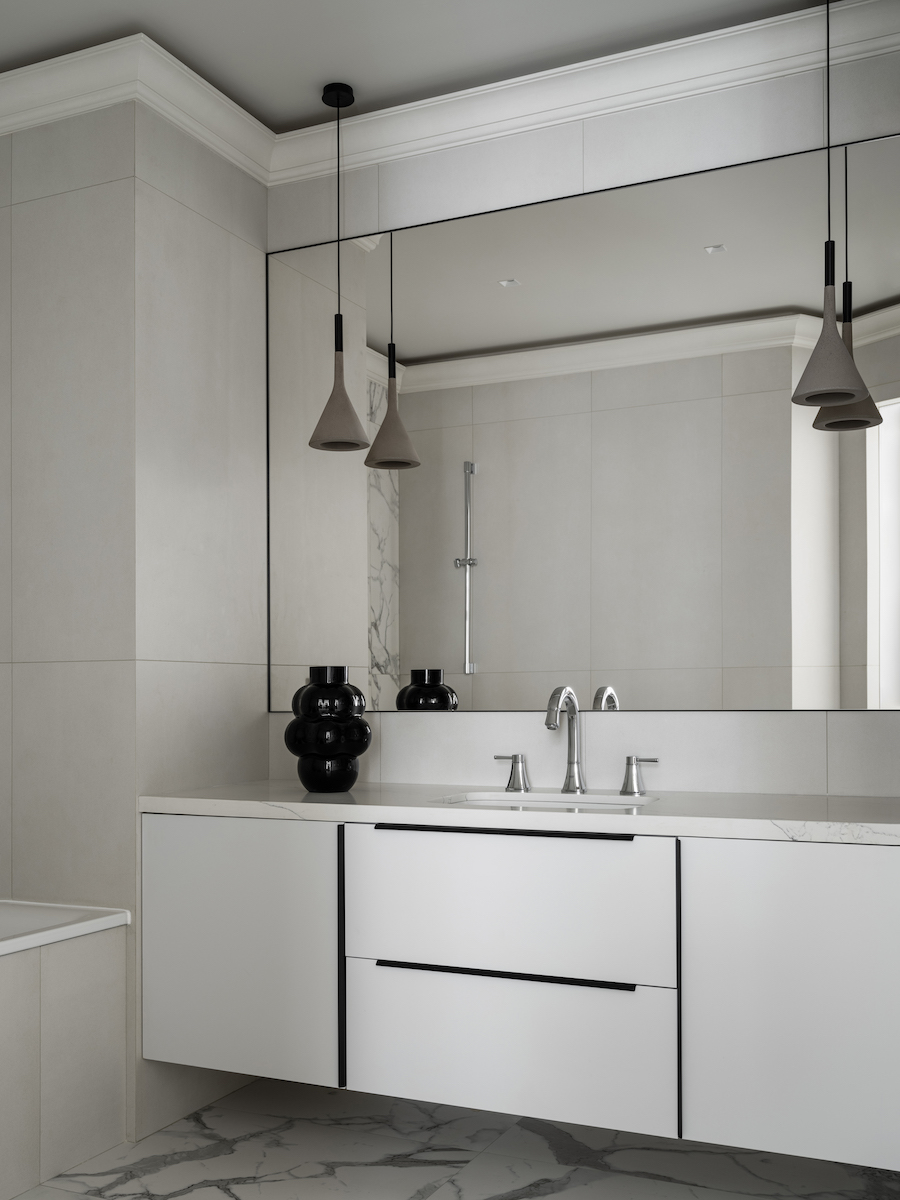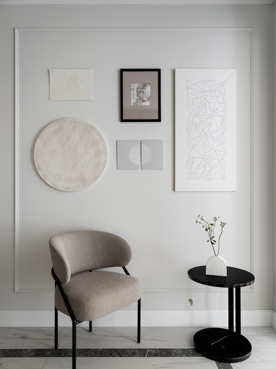Воплощение элегантности и гармонии: Квартира в ЖК «Софийский». Современная классика с черными графическими акцентами, классическими элементами и мебелью в современном стиле. Особое внимание к каждой детали — интерьер, отражающий утонченность и комфорт.