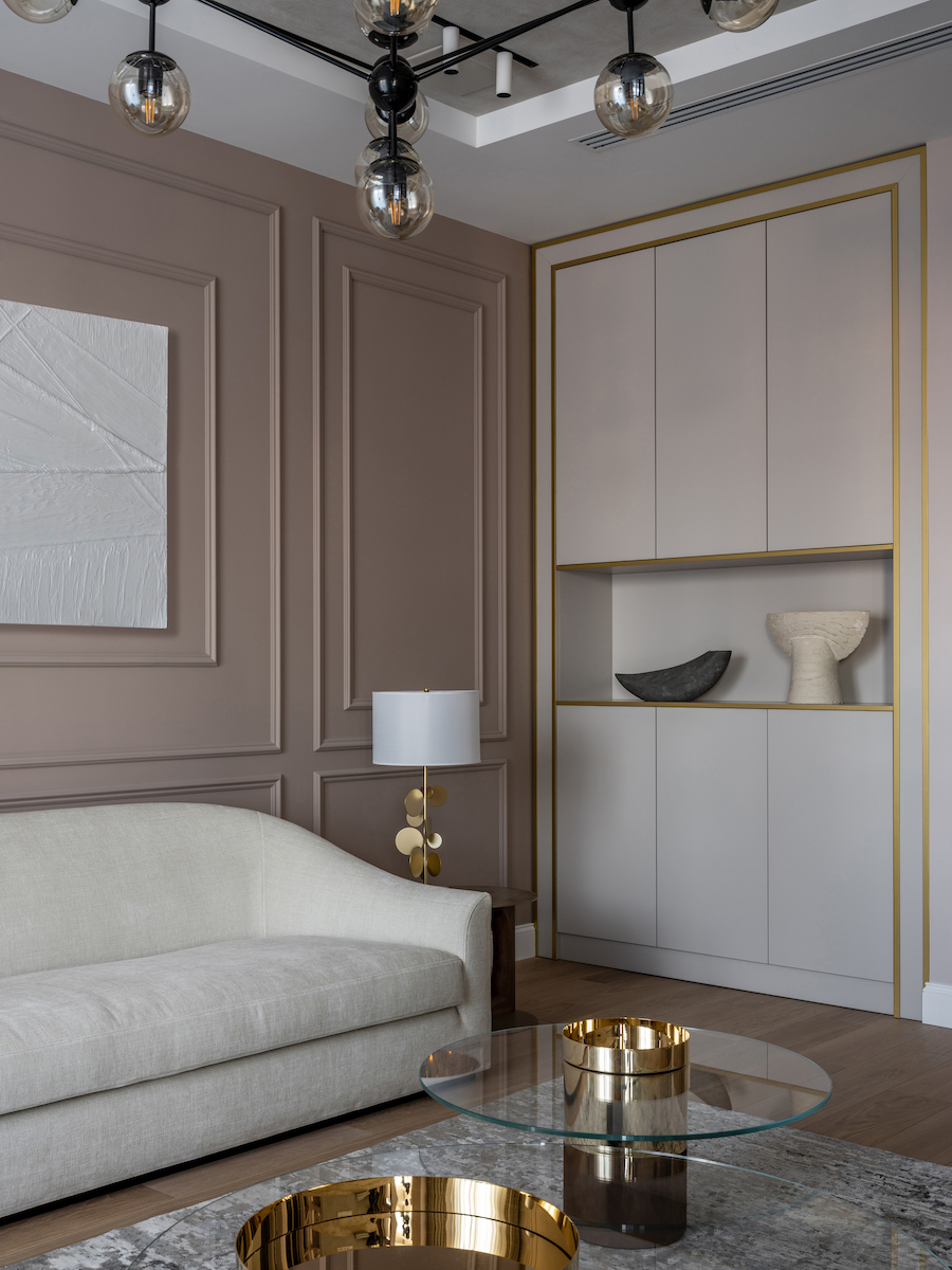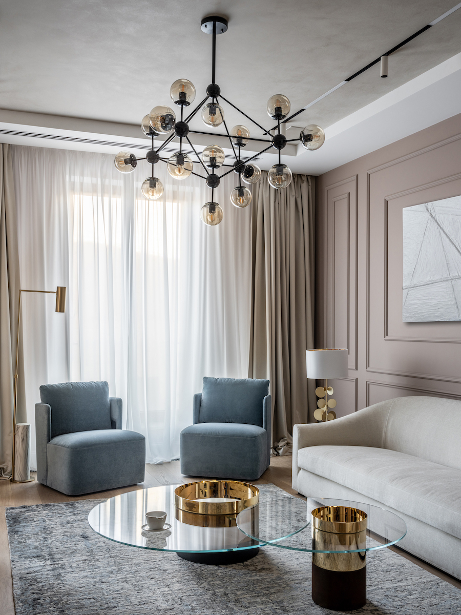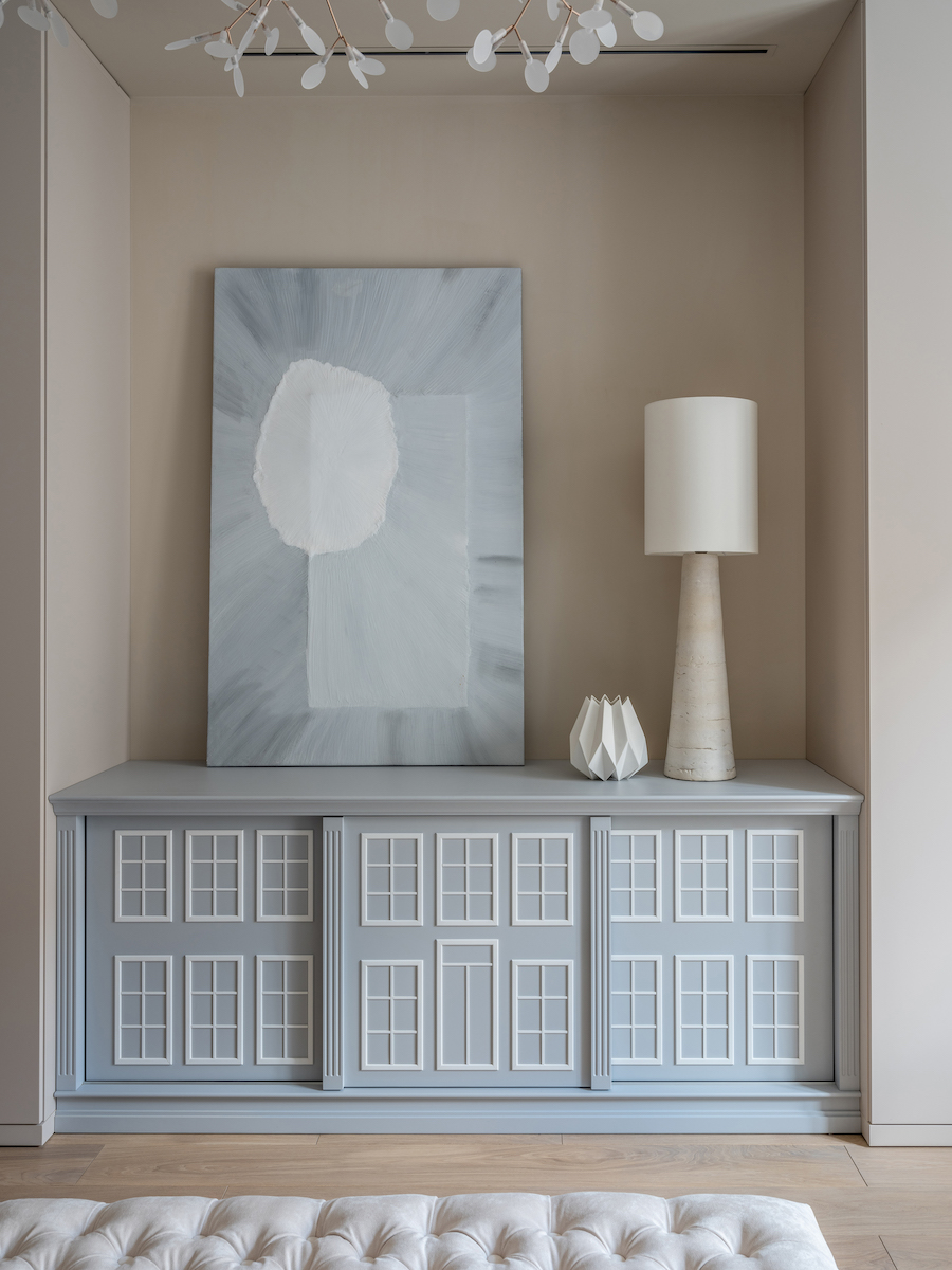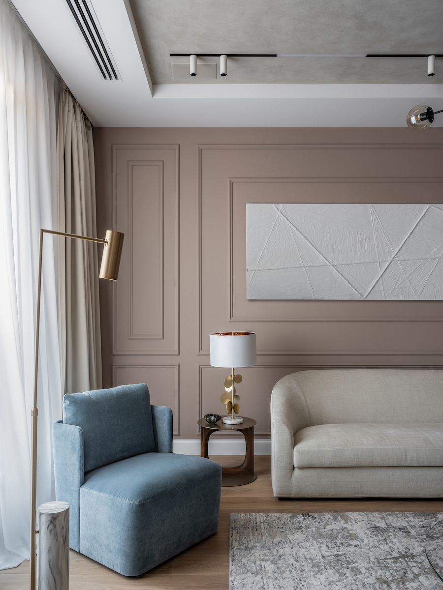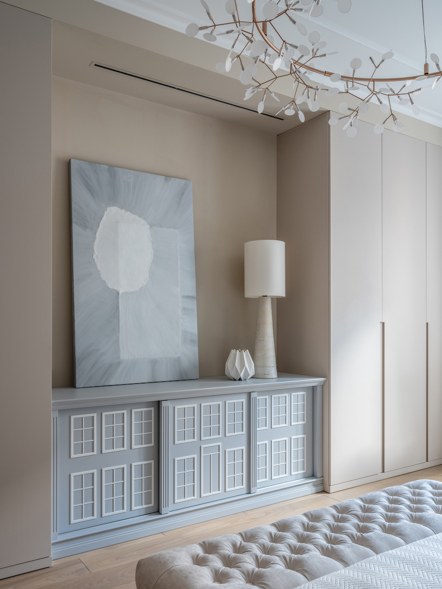 Мы создали в 210-метровой квартире на Котельнической набережной пространство, в котором сочетание стиля фьюжн с элементами классики и современным mid-century смягчается нежными приглушенными оттенками, придающими интерьеру художественную чувственность импрессионизма.