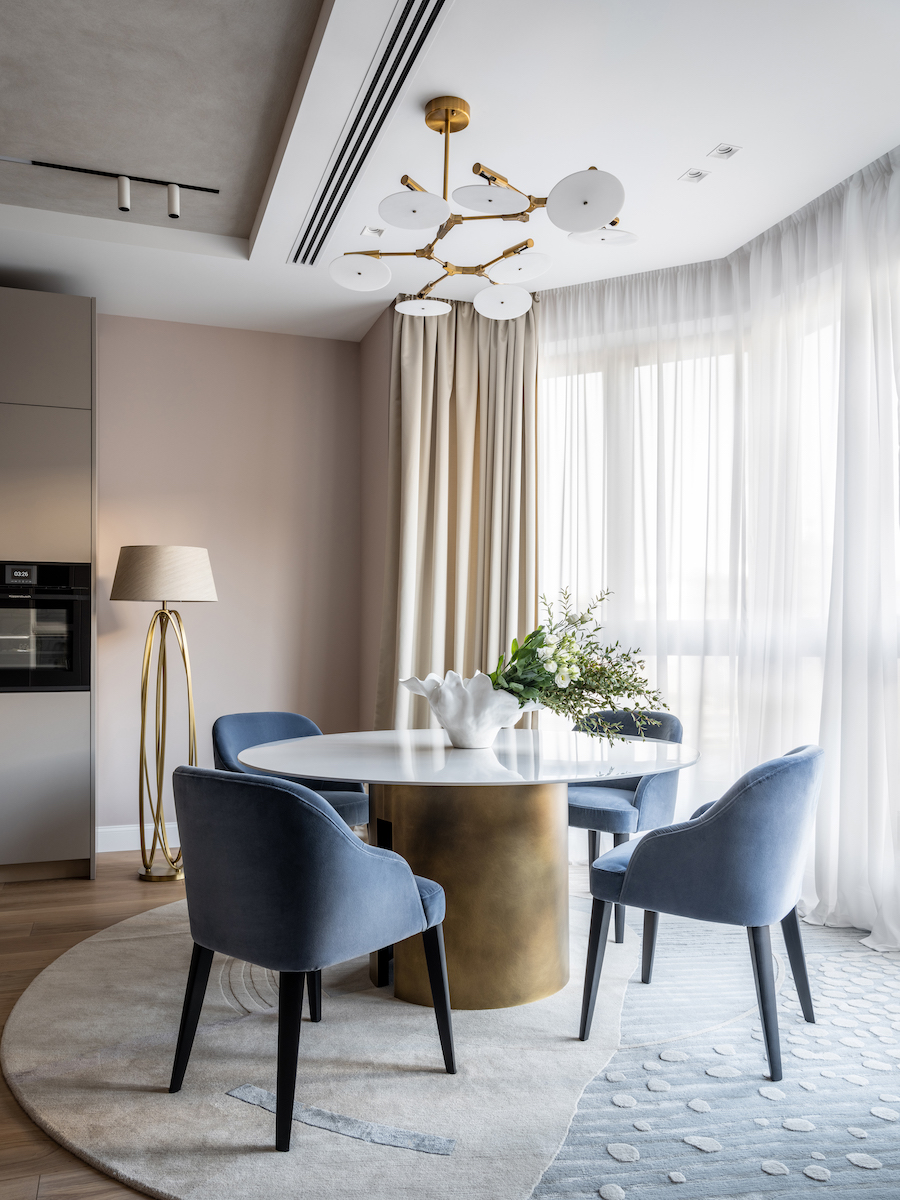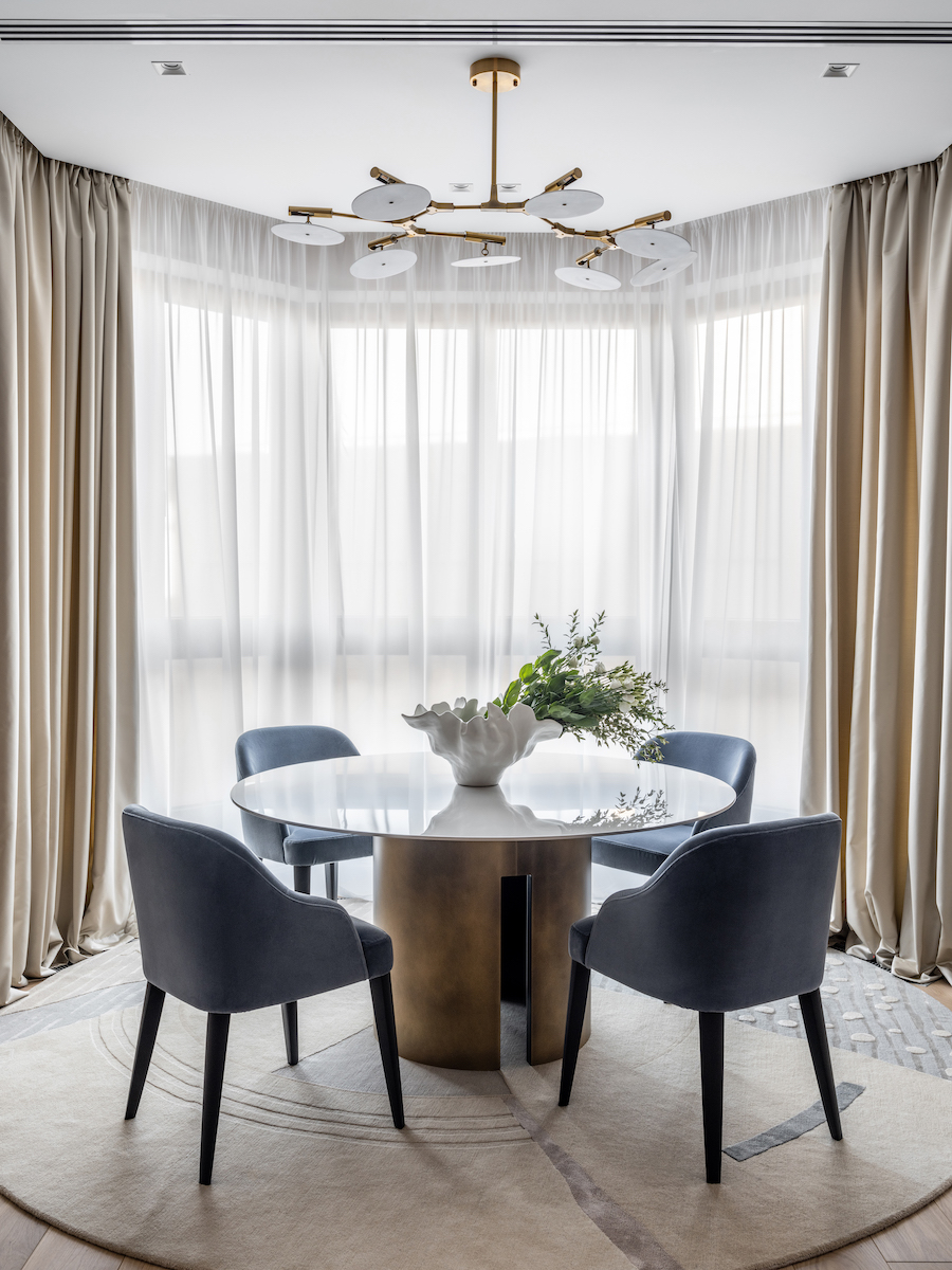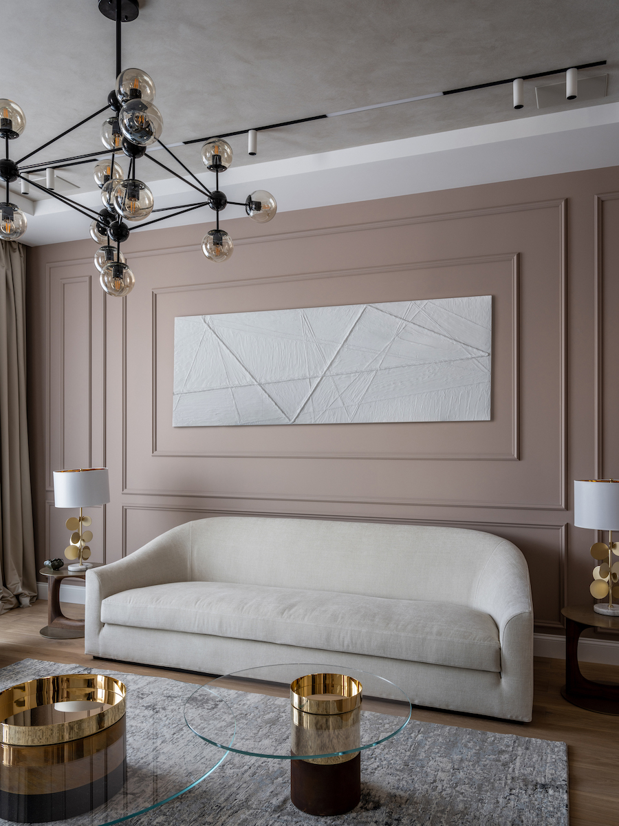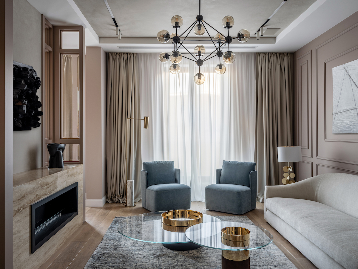 Мы создали в 210-метровой квартире на Котельнической набережной пространство, в котором сочетание стиля фьюжн с элементами классики и современным mid-century смягчается нежными приглушенными оттенками, придающими интерьеру художественную чувственность импрессионизма.