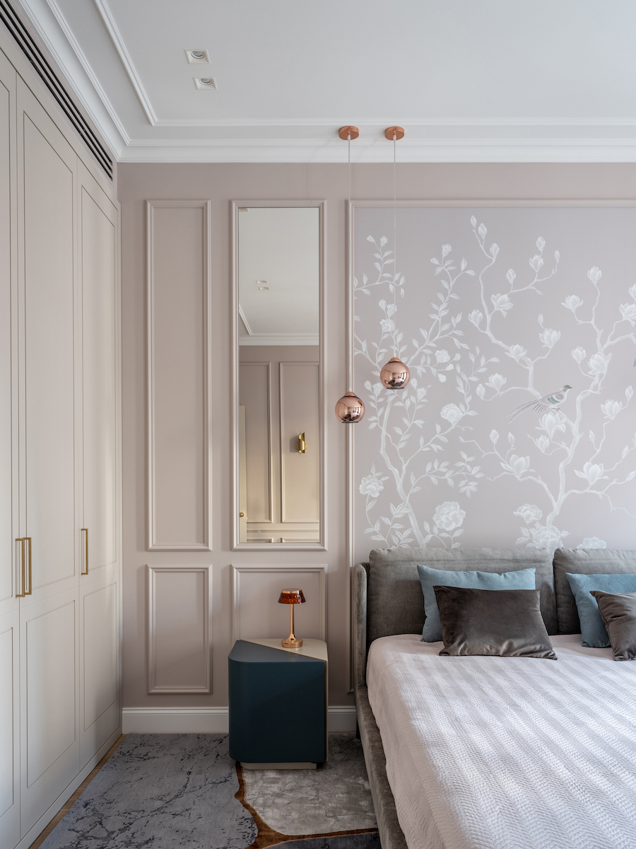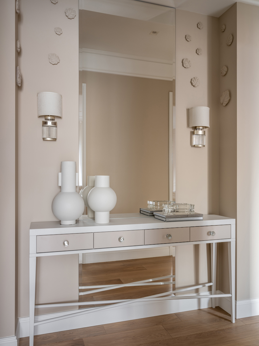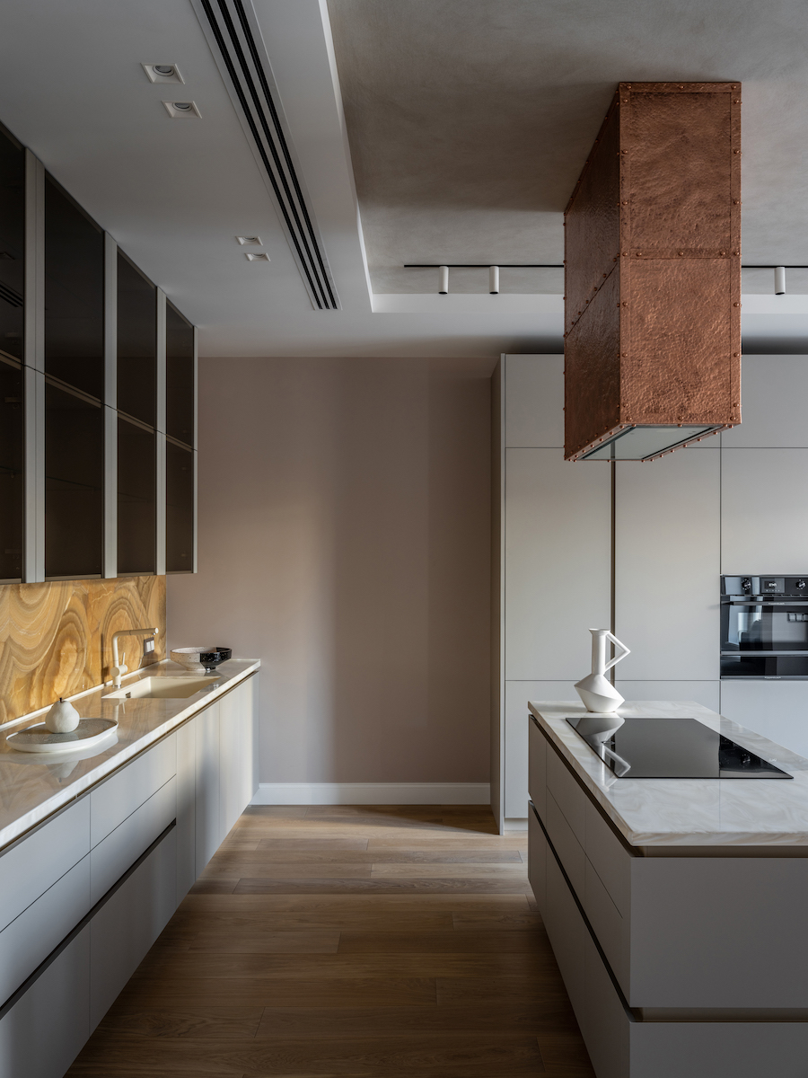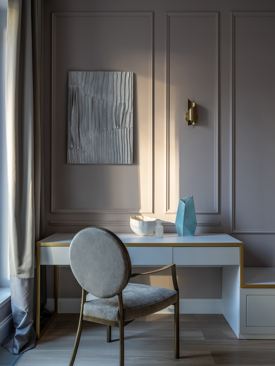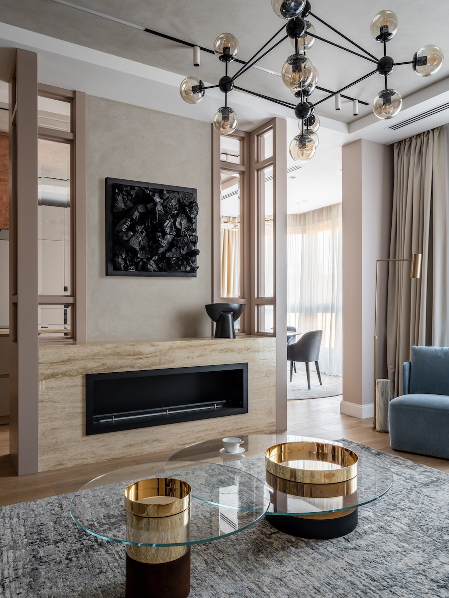 Мы создали в 210-метровой квартире на Котельнической набережной пространство, в котором сочетание стиля фьюжн с элементами классики и современным mid-century смягчается нежными приглушенными оттенками, придающими интерьеру художественную чувственность импрессионизма.