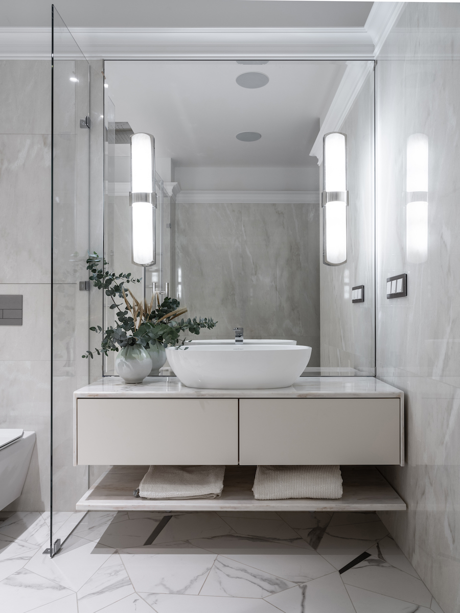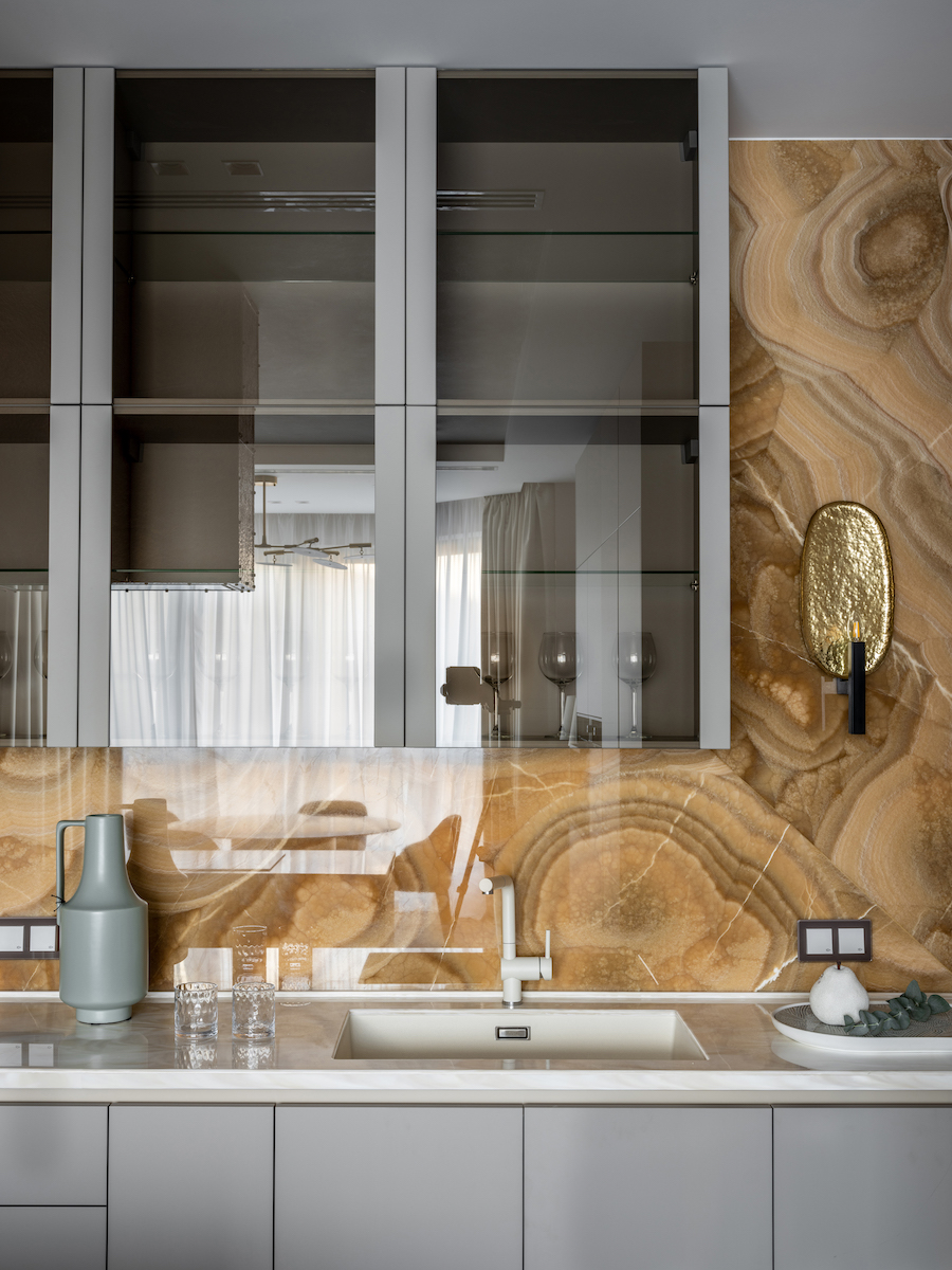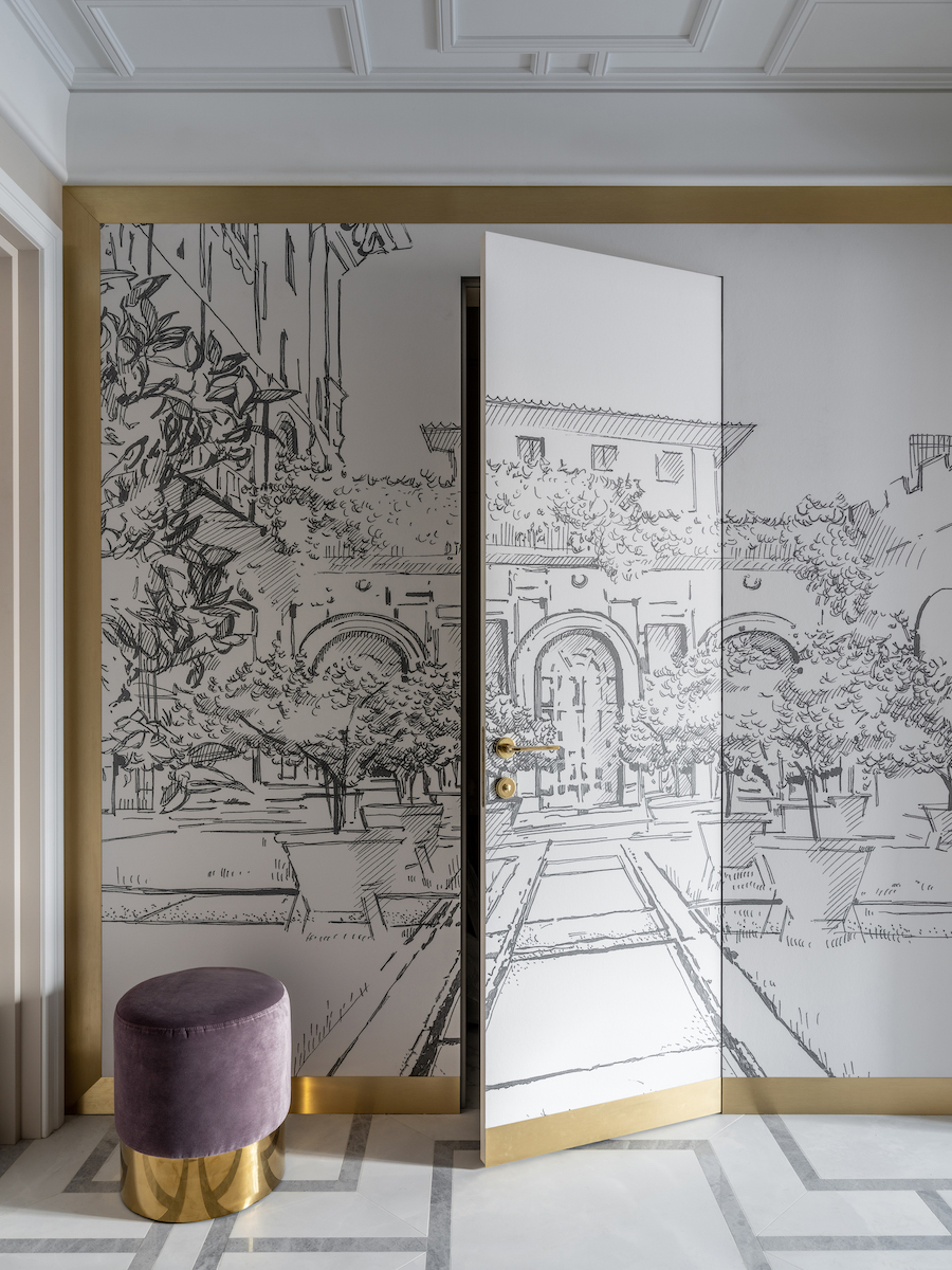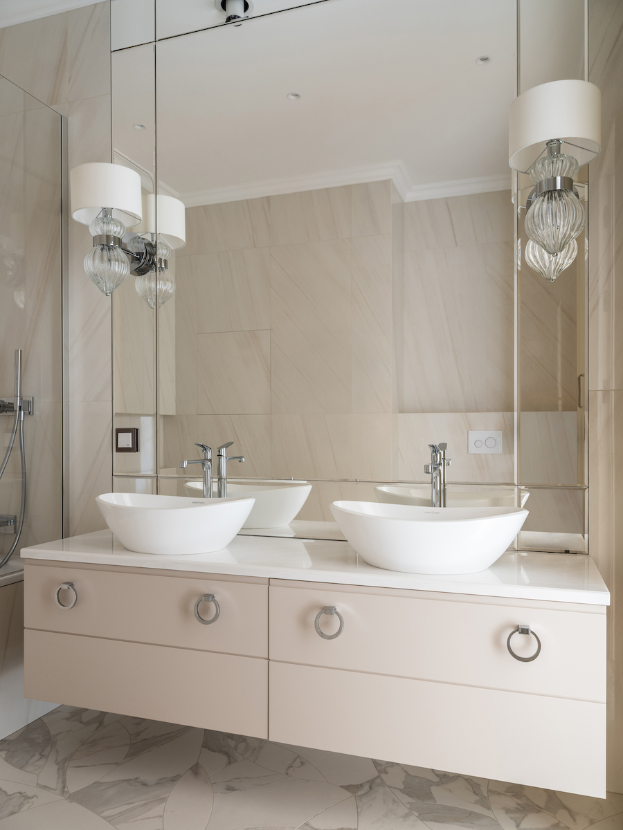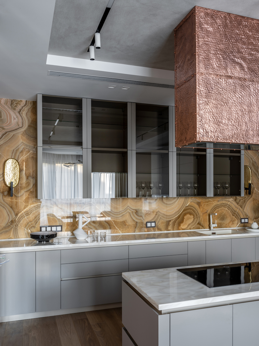 Мы создали в 210-метровой квартире на Котельнической набережной пространство, в котором сочетание стиля фьюжн с элементами классики и современным mid-century смягчается нежными приглушенными оттенками, придающими интерьеру художественную чувственность импрессионизма.