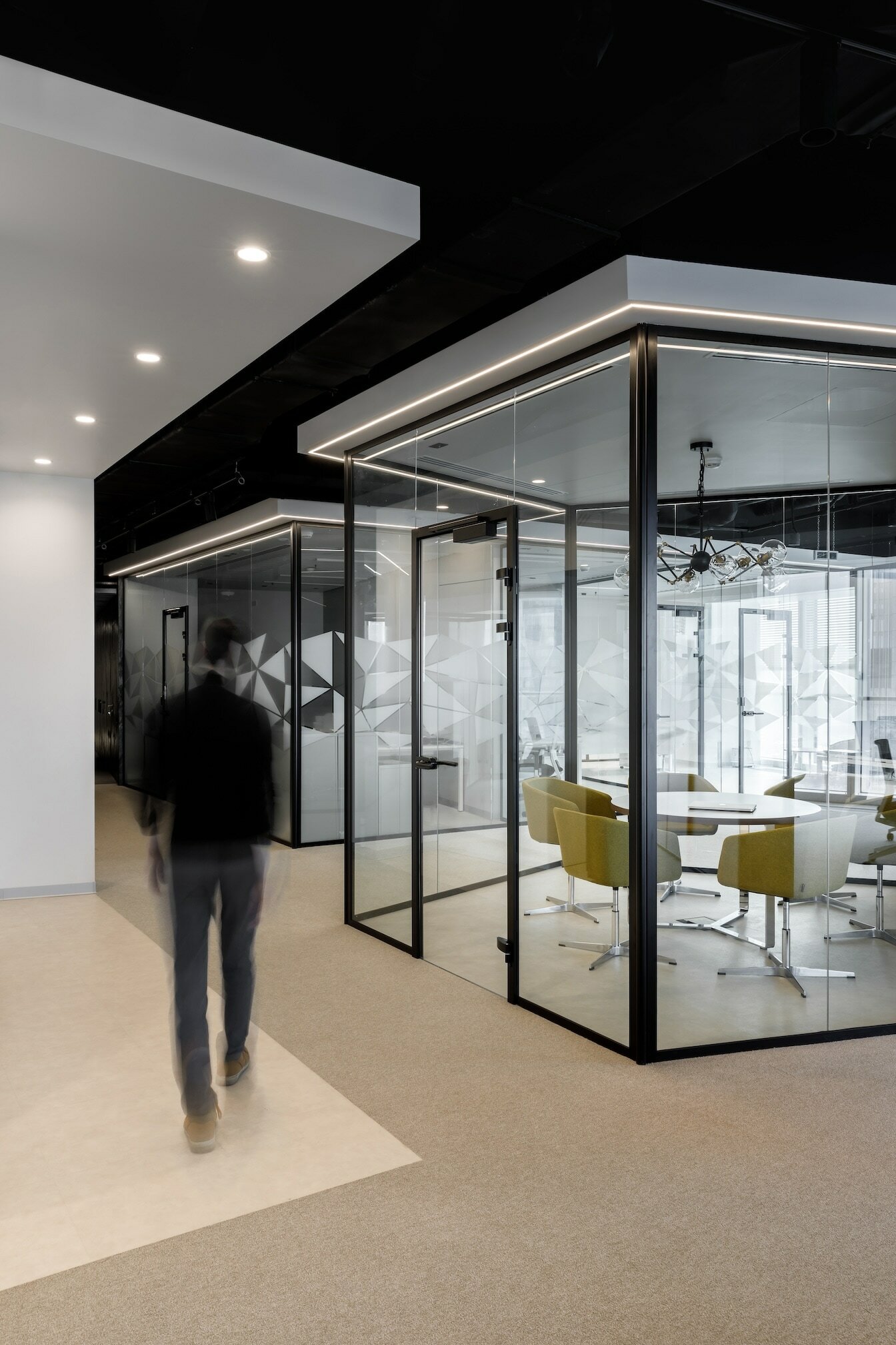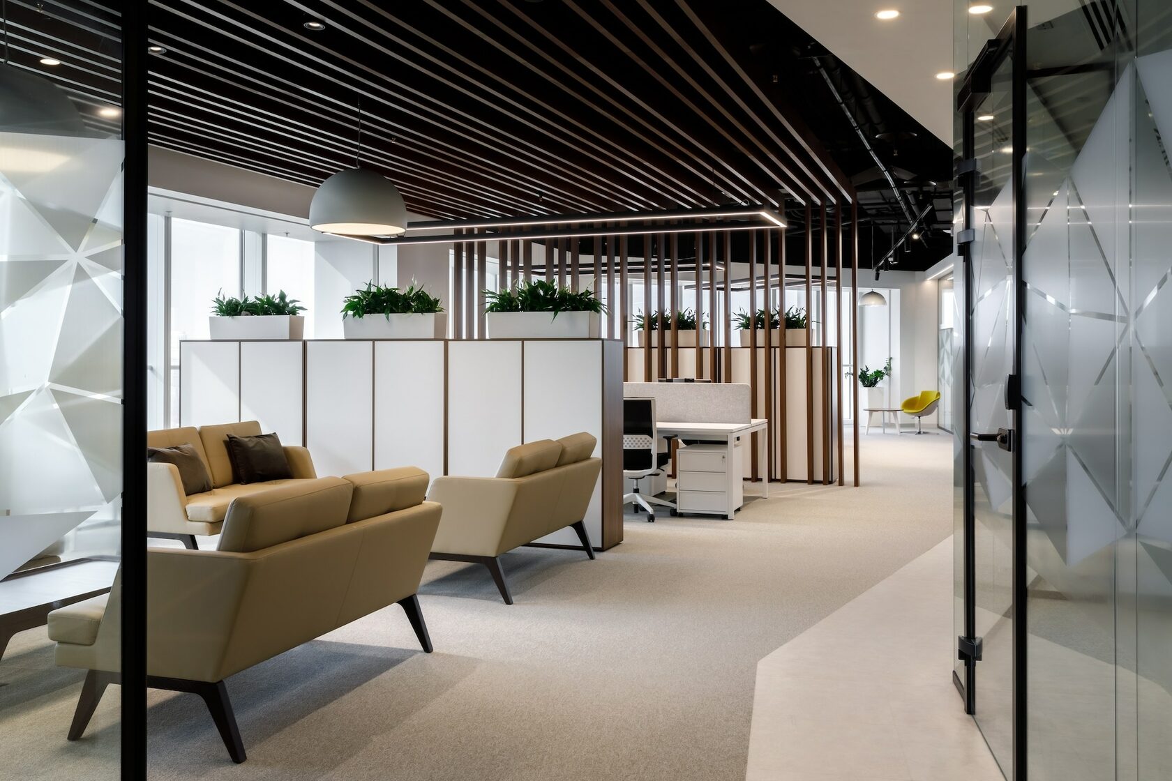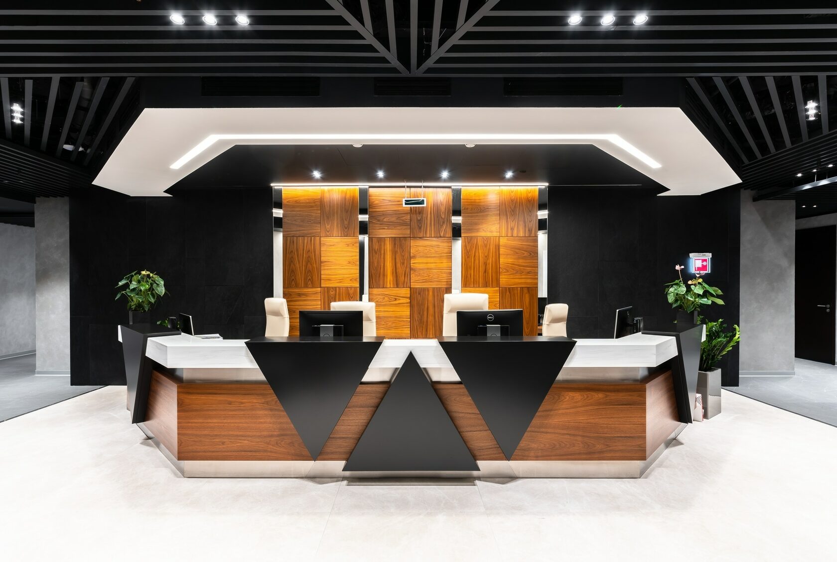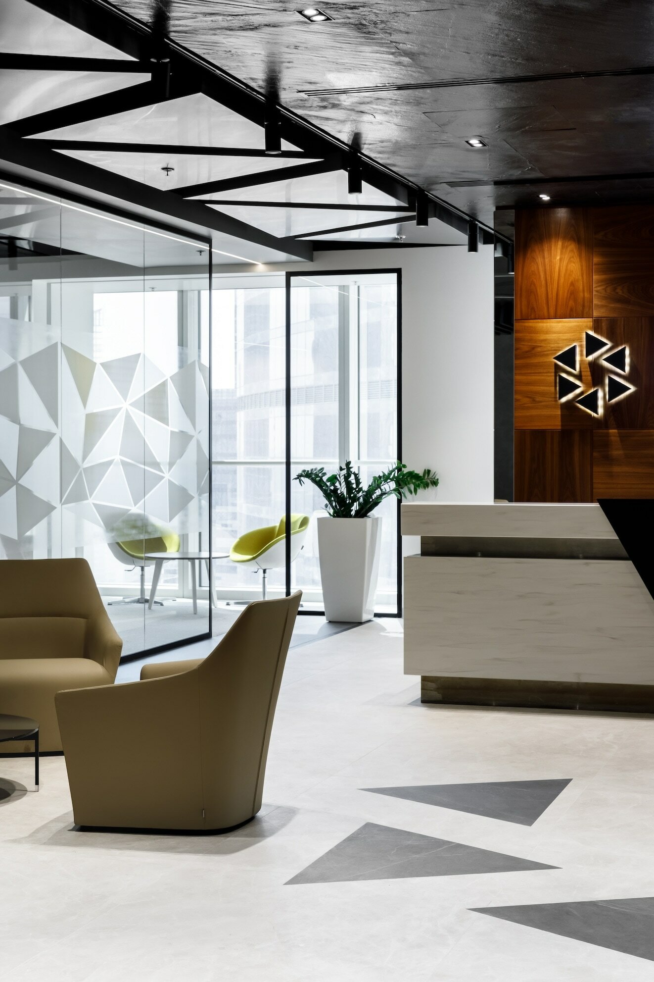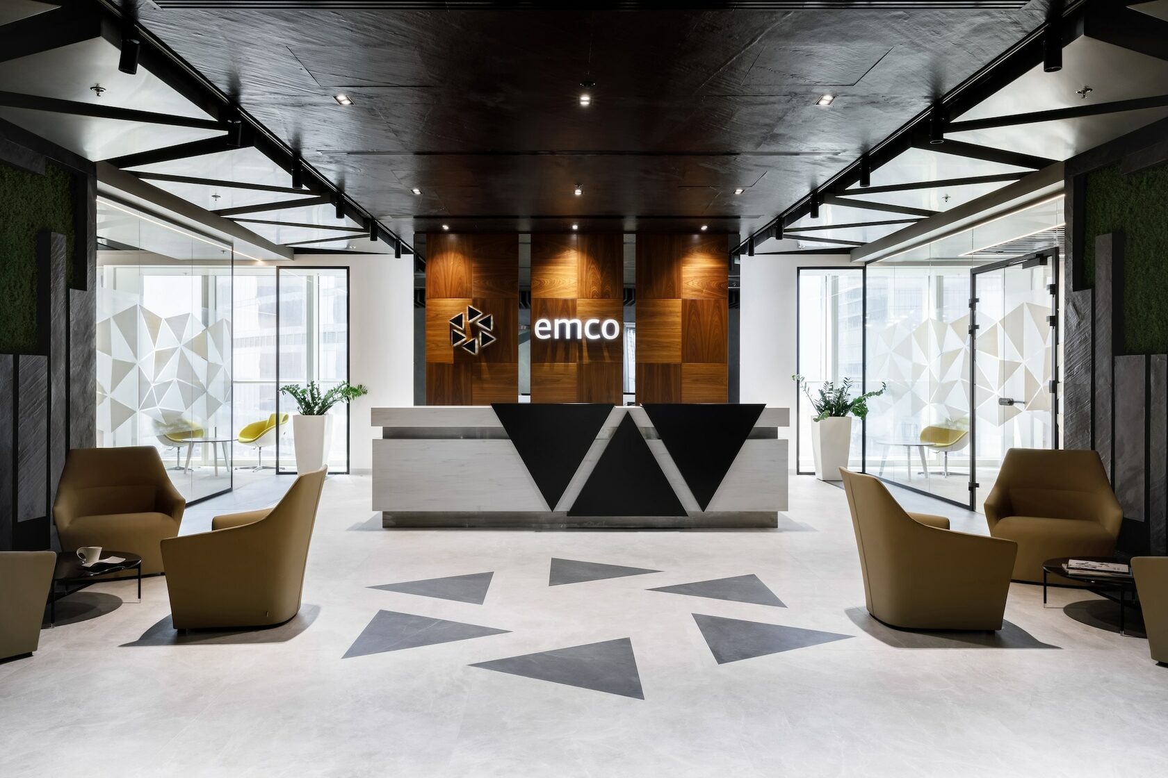 В реализованном проекте офиса для Восточной горнорудной компании (ЕМСО) на площади 1300 м² смешались черты минимализма, ар-деко и mid-century. Разрабатывая проект, мы обратились к специализации компании — добыче угля. Так в интерьере появился сланец, древесина охристого оттенка. За основу визуальных паттернов взяли треугольники, которые являются частью логотипа компании.