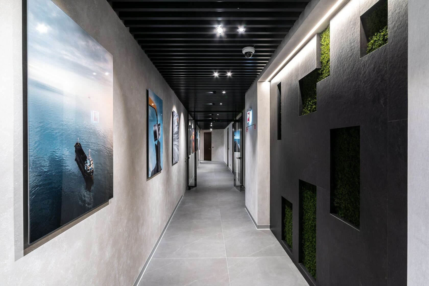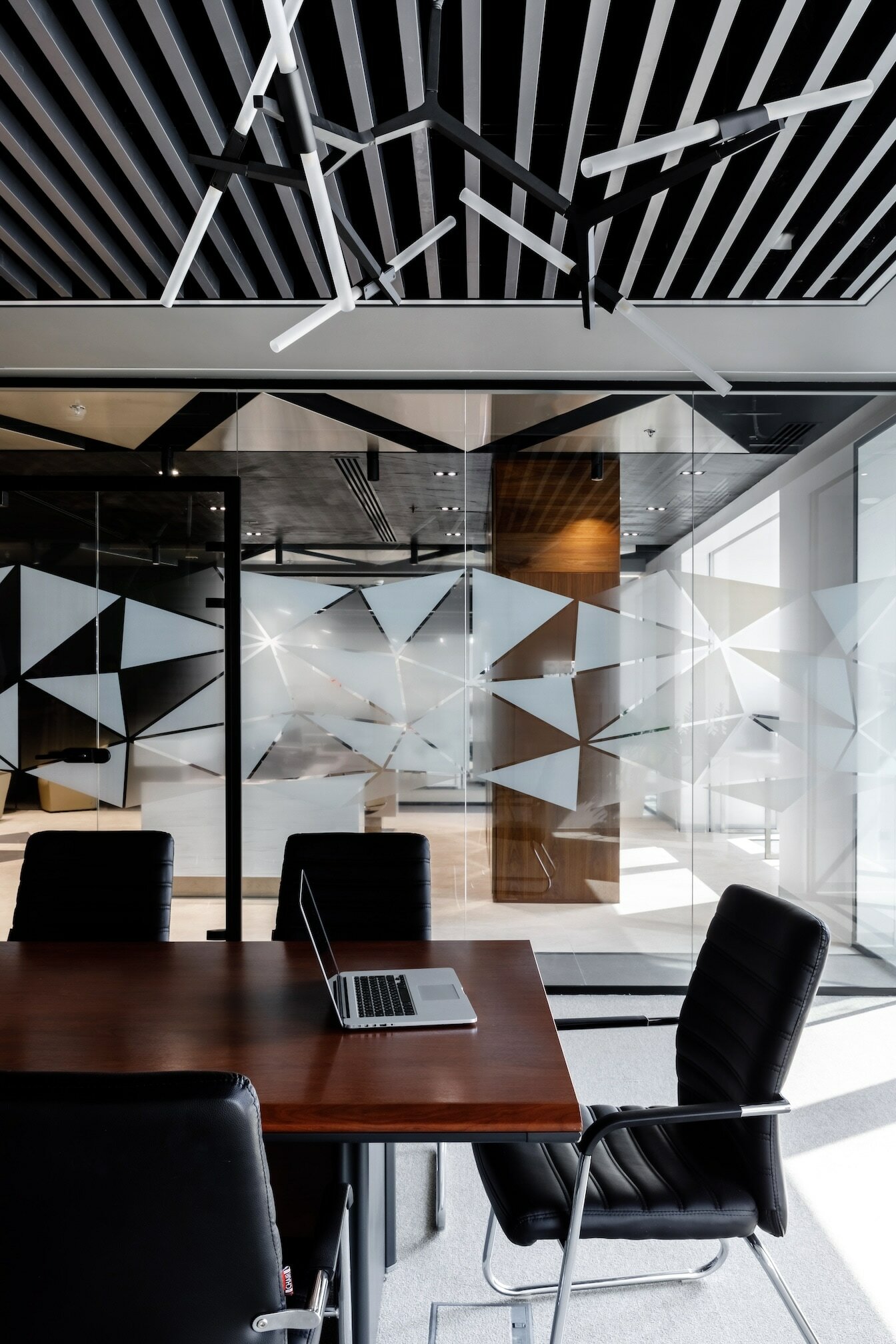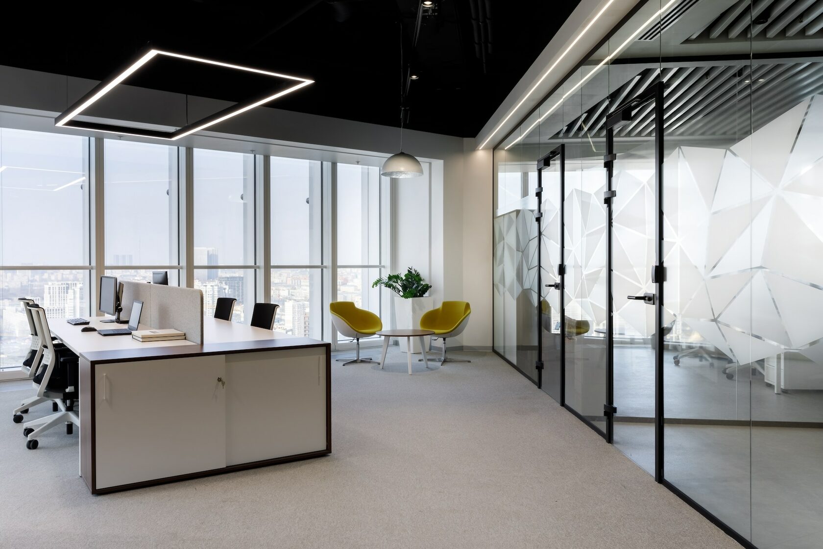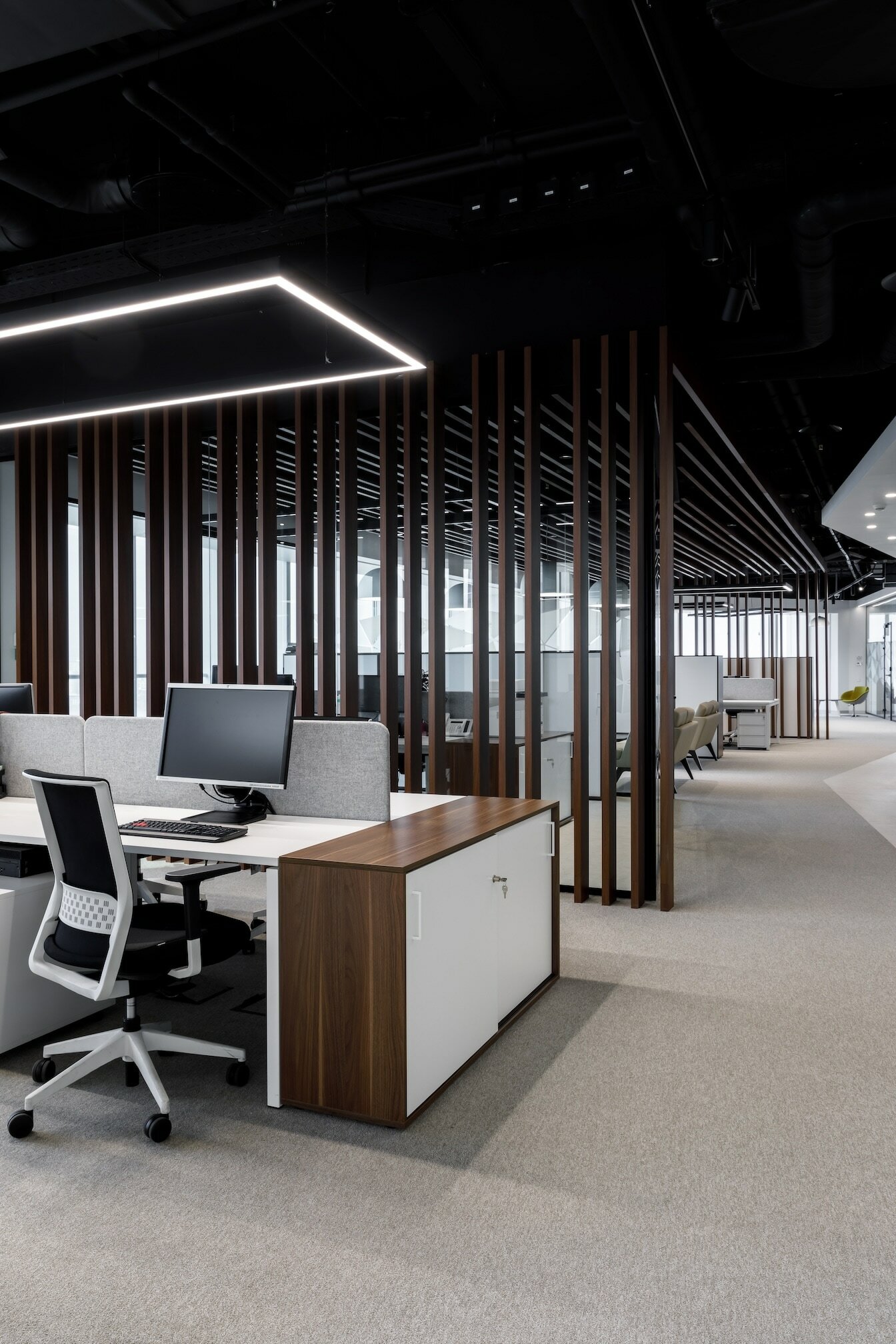 В реализованном проекте офиса для Восточной горнорудной компании (ЕМСО) на площади 1300 м² смешались черты минимализма, ар-деко и mid-century. Разрабатывая проект, мы обратились к специализации компании — добыче угля. Так в интерьере появился сланец, древесина охристого оттенка. За основу визуальных паттернов взяли треугольники, которые являются частью логотипа компании.