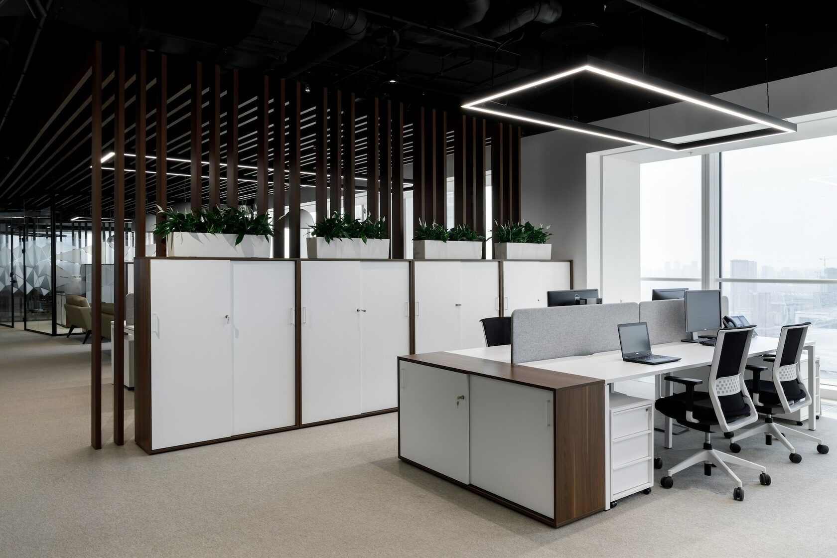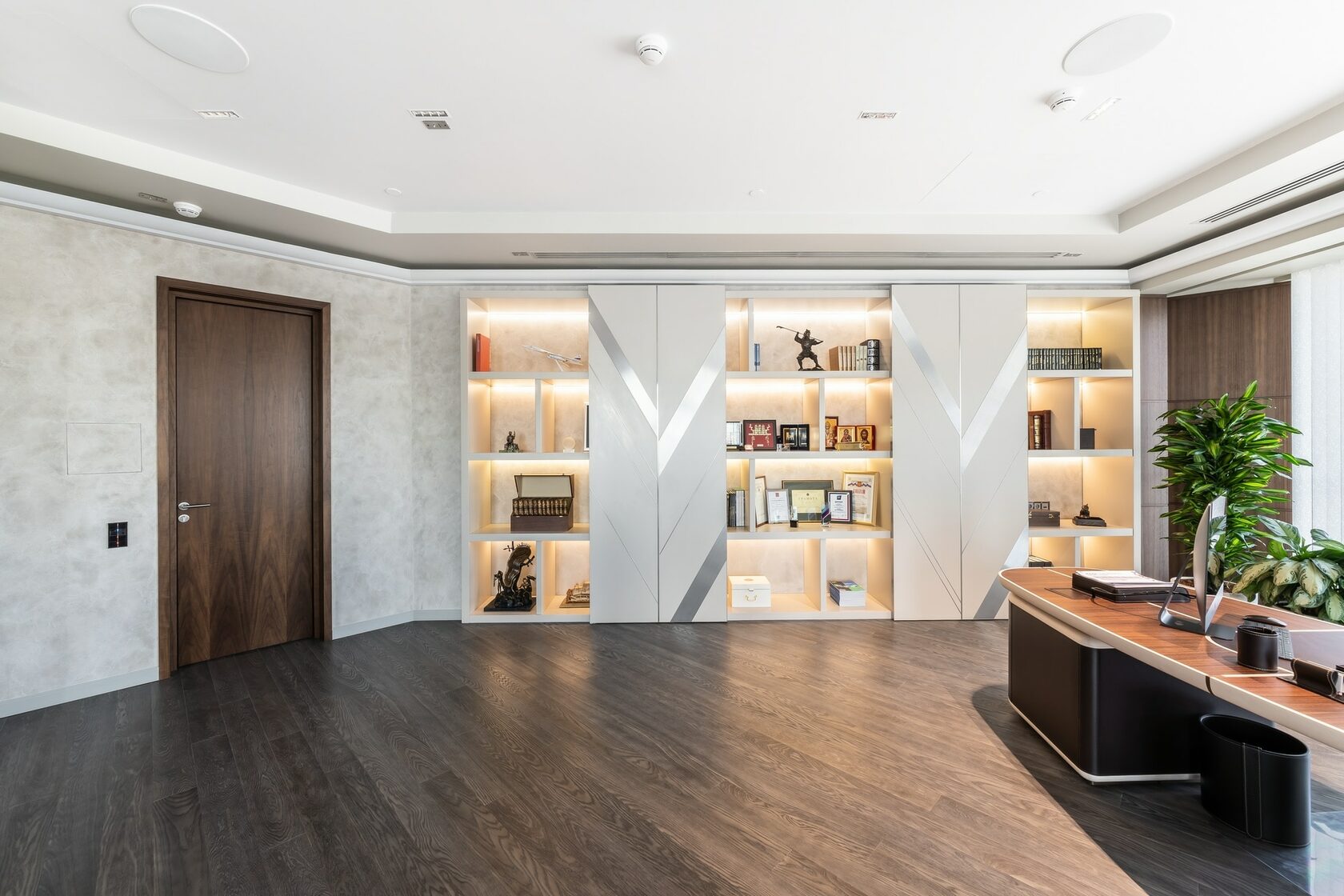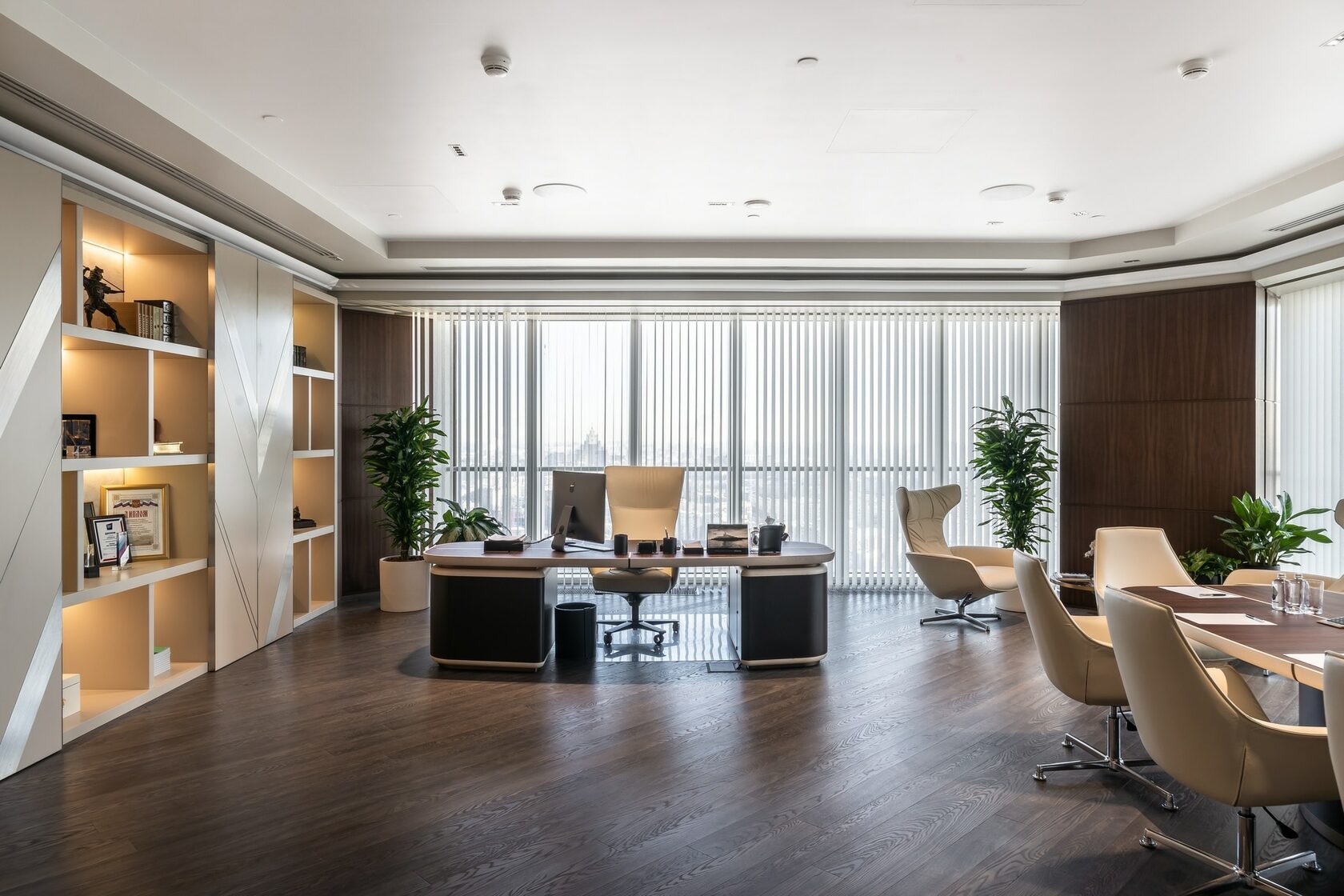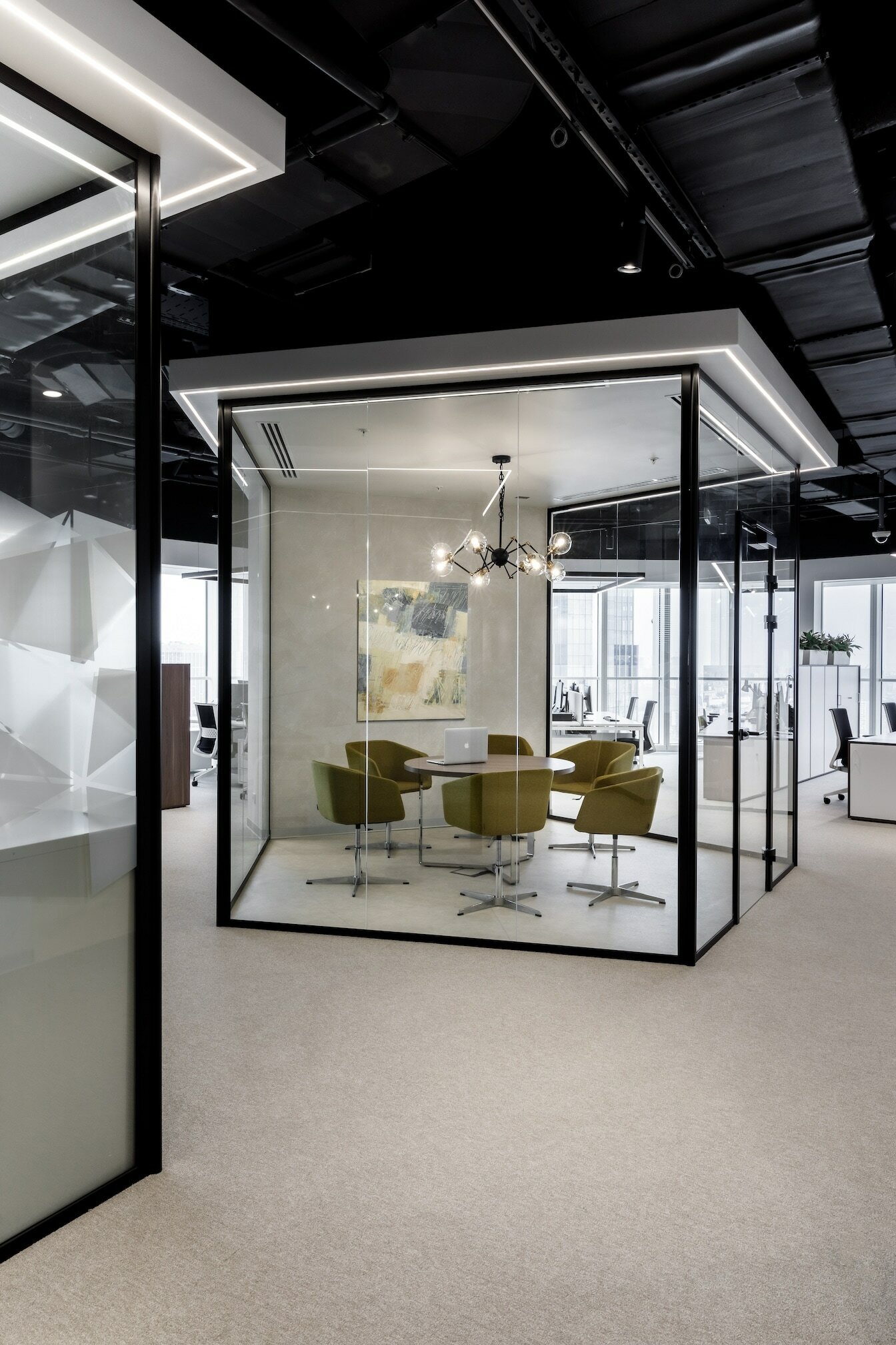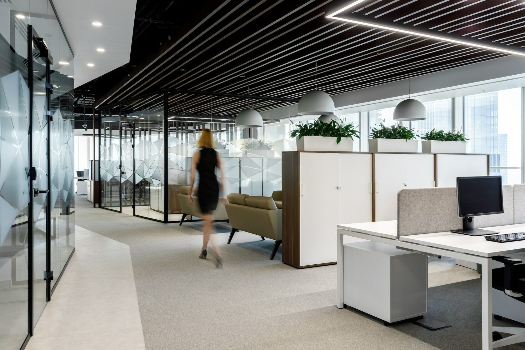 В реализованном проекте офиса для Восточной горнорудной компании (ЕМСО) на площади 1300 м² смешались черты минимализма, ар-деко и mid-century. Разрабатывая проект, мы обратились к специализации компании — добыче угля. Так в интерьере появился сланец, древесина охристого оттенка. За основу визуальных паттернов взяли треугольники, которые являются частью логотипа компании.