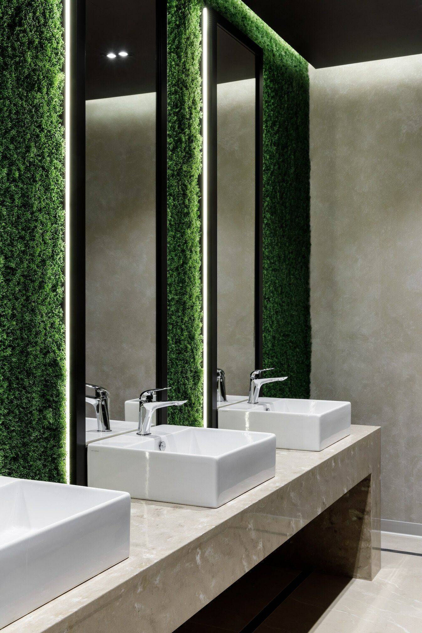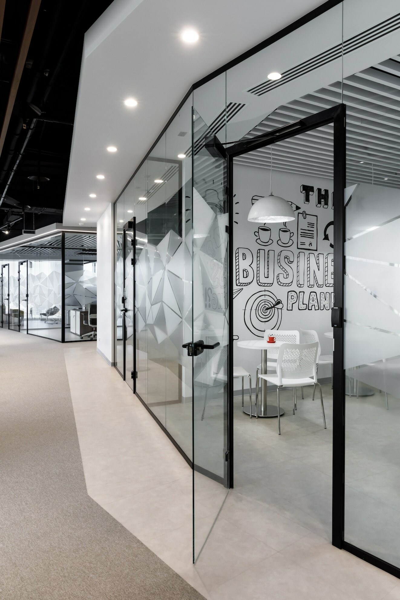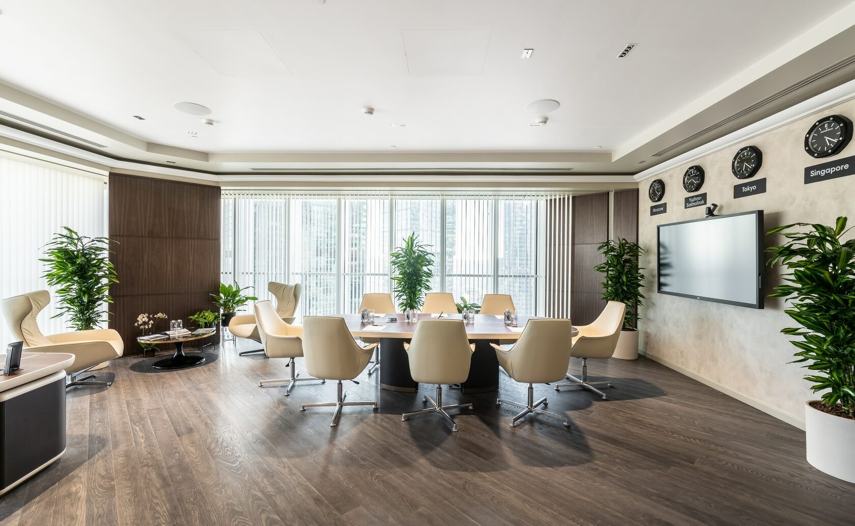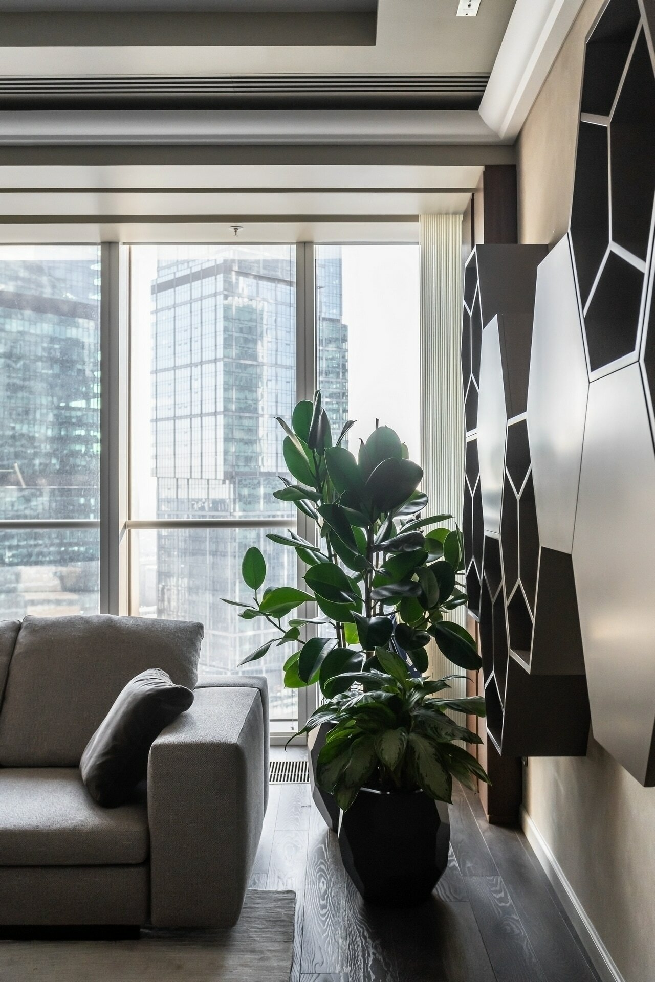 В реализованном проекте офиса для Восточной горнорудной компании (ЕМСО) на площади 1300 м² смешались черты минимализма, ар-деко и mid-century. Разрабатывая проект, мы обратились к специализации компании — добыче угля. Так в интерьере появился сланец, древесина охристого оттенка. За основу визуальных паттернов взяли треугольники, которые являются частью логотипа компании.