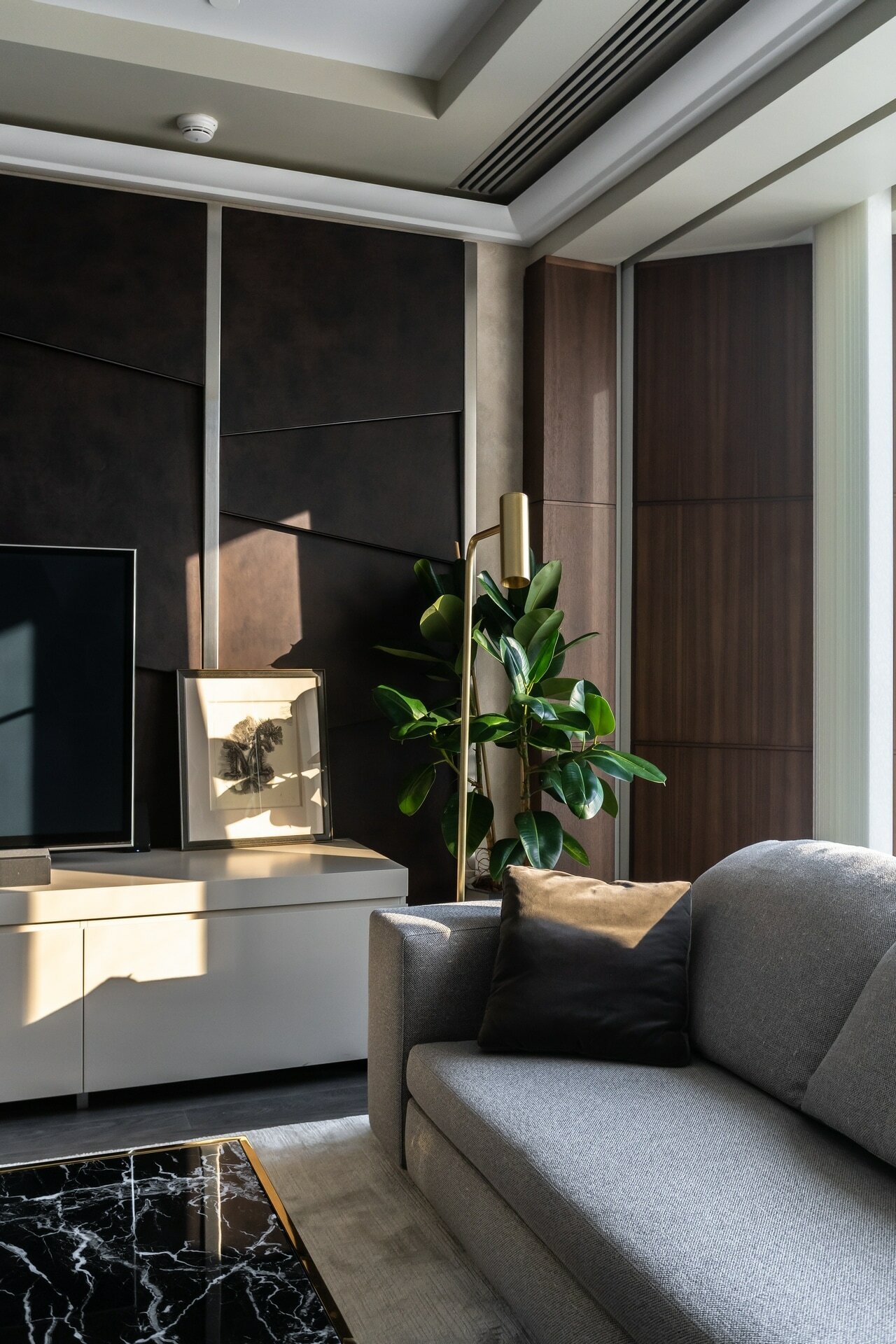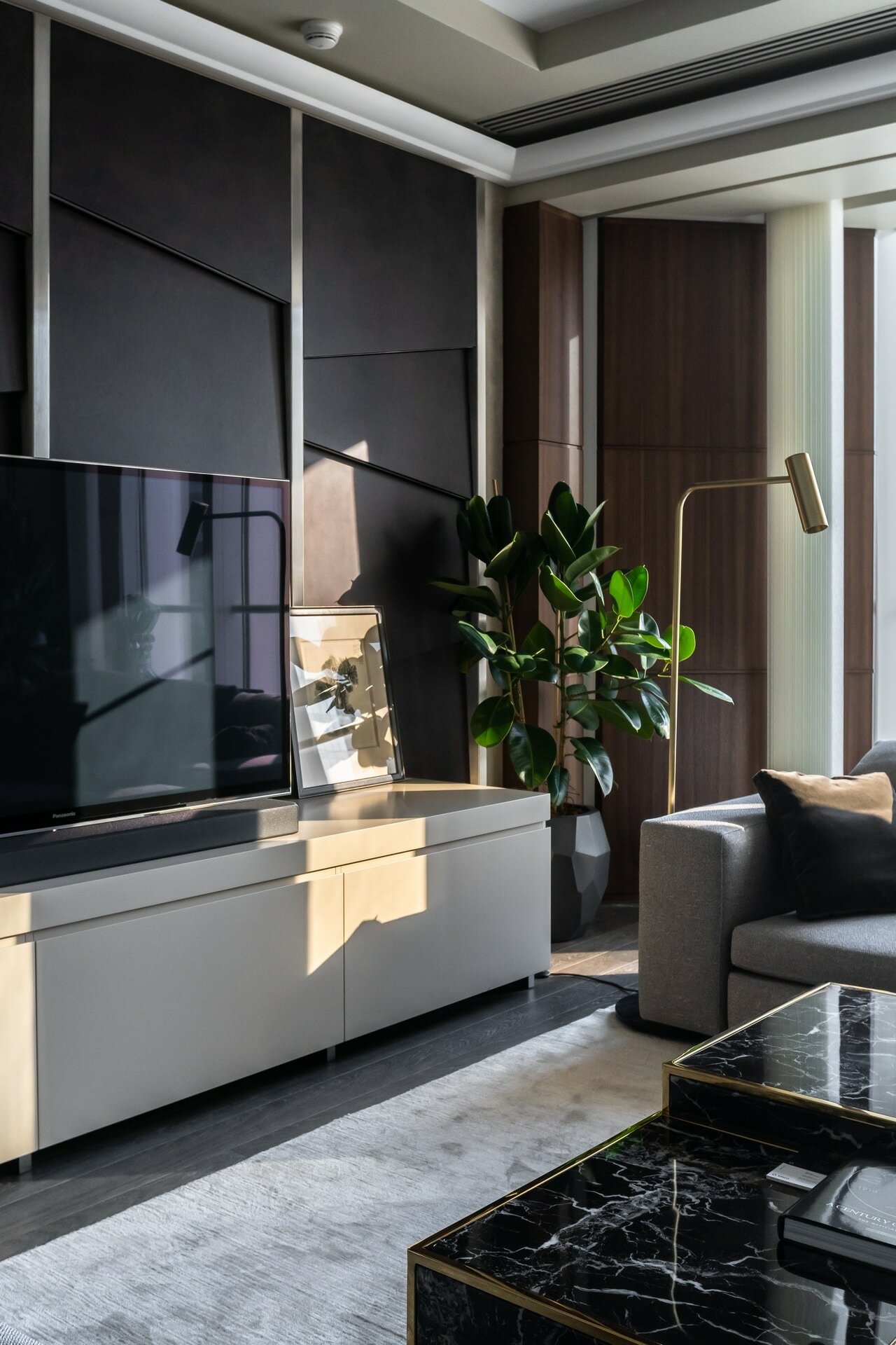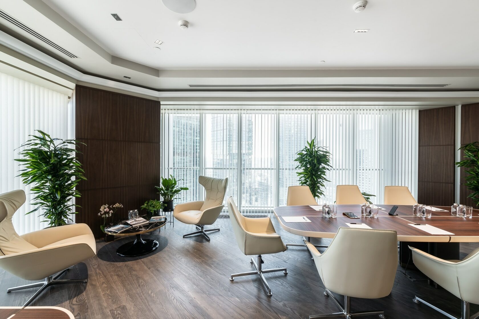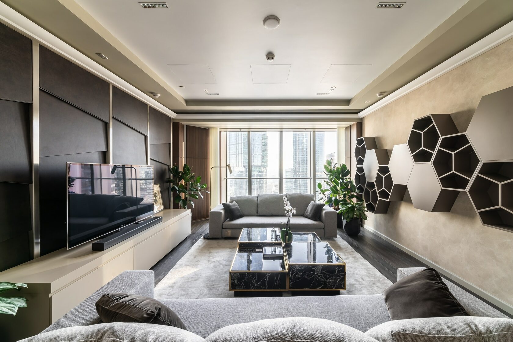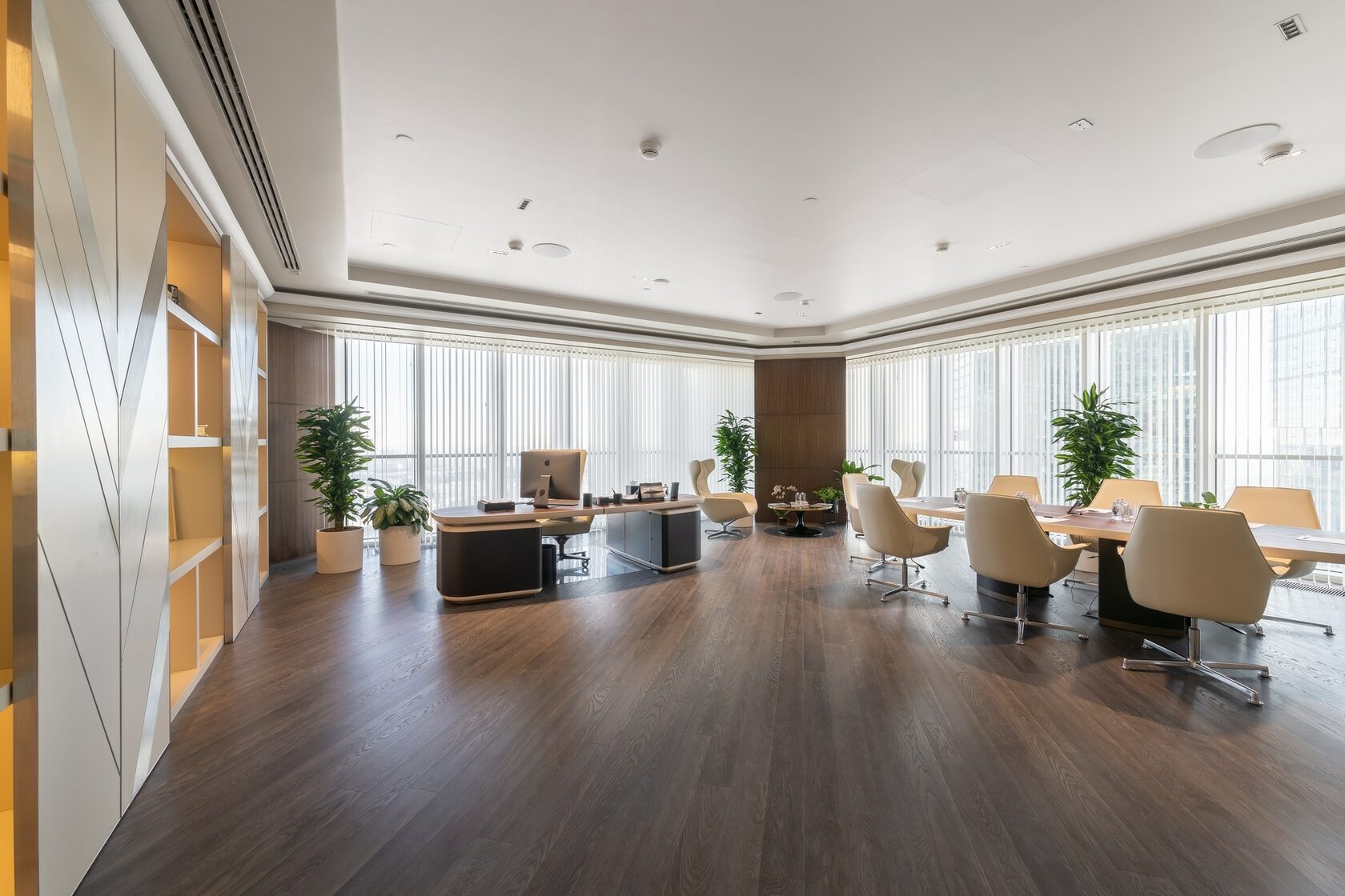 В реализованном проекте офиса для Восточной горнорудной компании (ЕМСО) на площади 1300 м² смешались черты минимализма, ар-деко и mid-century. Разрабатывая проект, мы обратились к специализации компании — добыче угля. Так в интерьере появился сланец, древесина охристого оттенка. За основу визуальных паттернов взяли треугольники, которые являются частью логотипа компании.