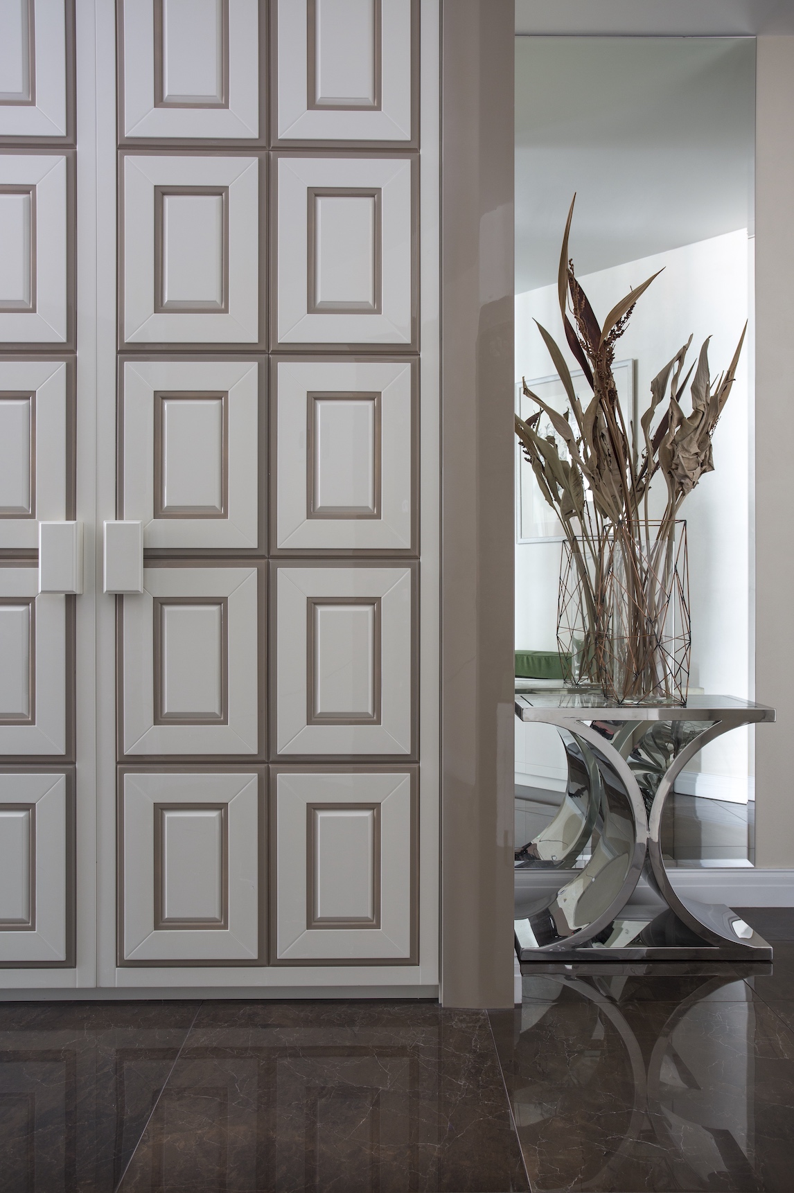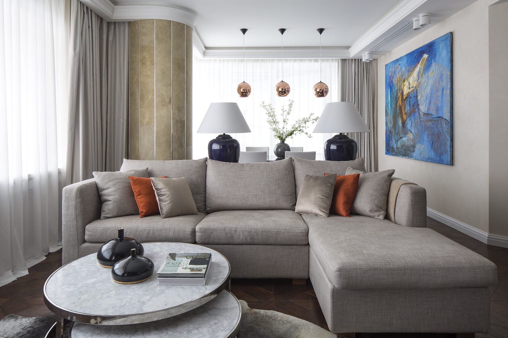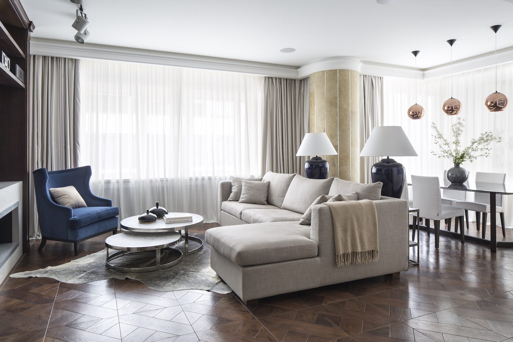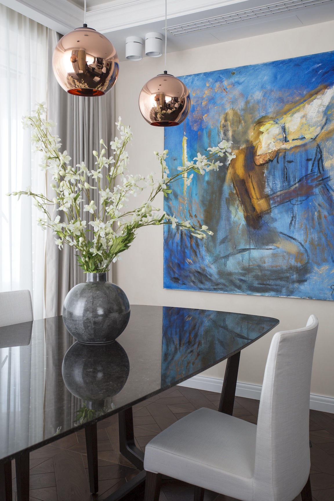 Эта 185-метровая квартира на Озерковской набережной стала результатом увлекательного сотрудничества молодой творческой пары с дизайнерами из «Мастерской интерьеров Варвары Зеленецкой». Желание объединить стили фьюжн, современной классики и нью ар-деко, а также воплотить сложные планировочные решения требовали креативности и аккуратности.