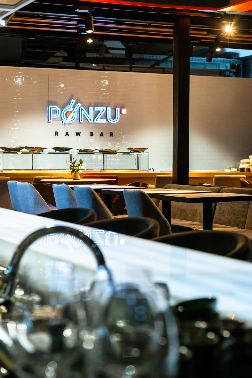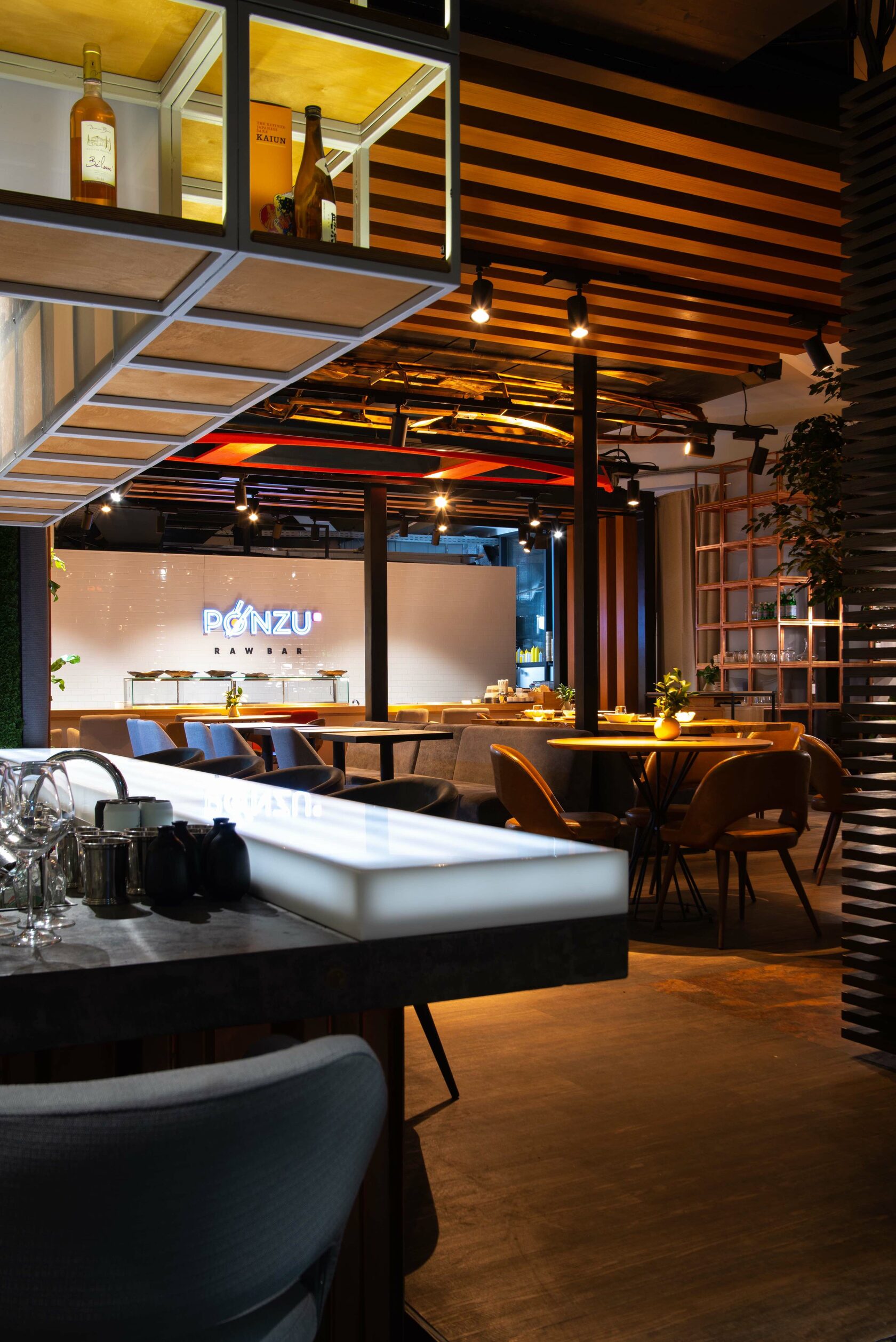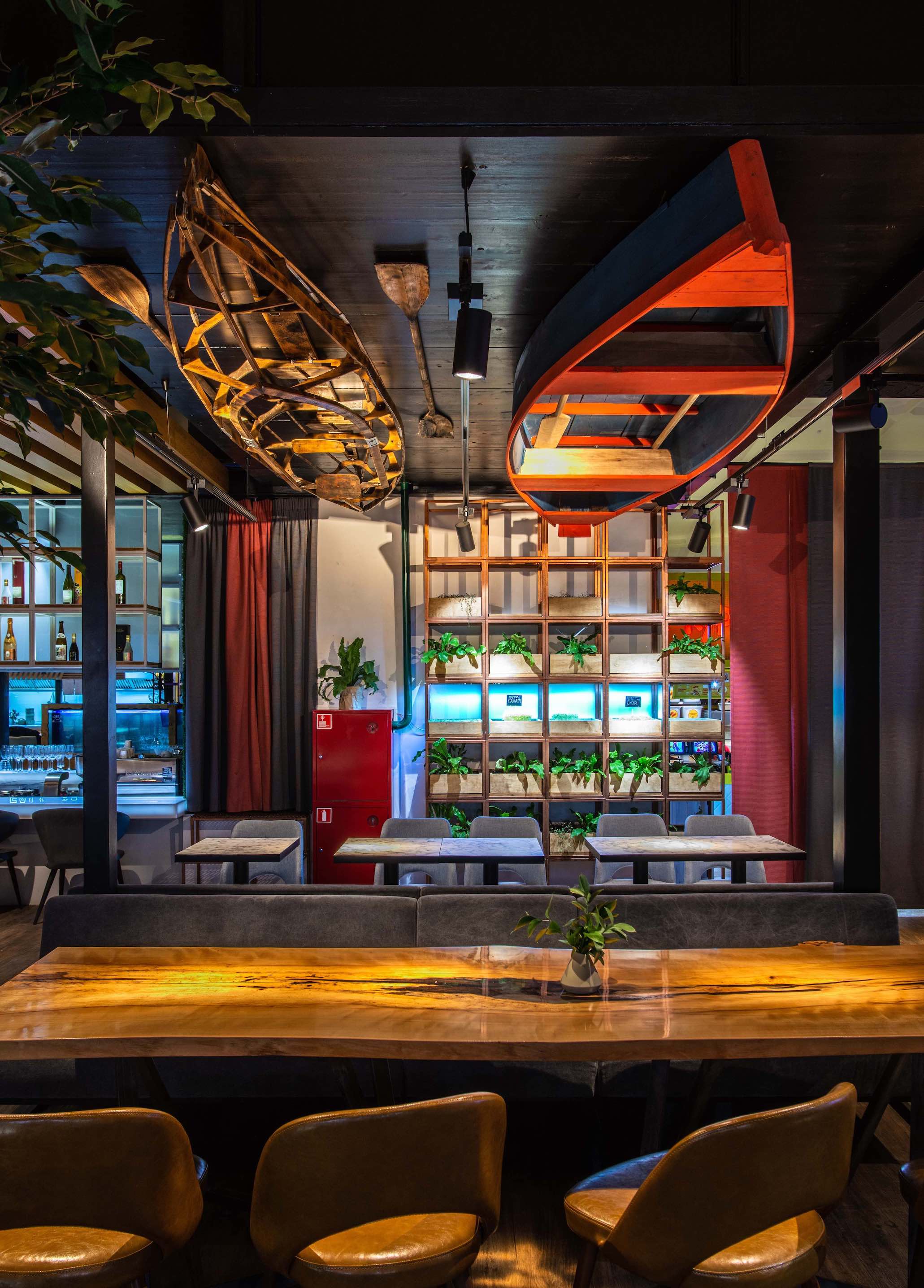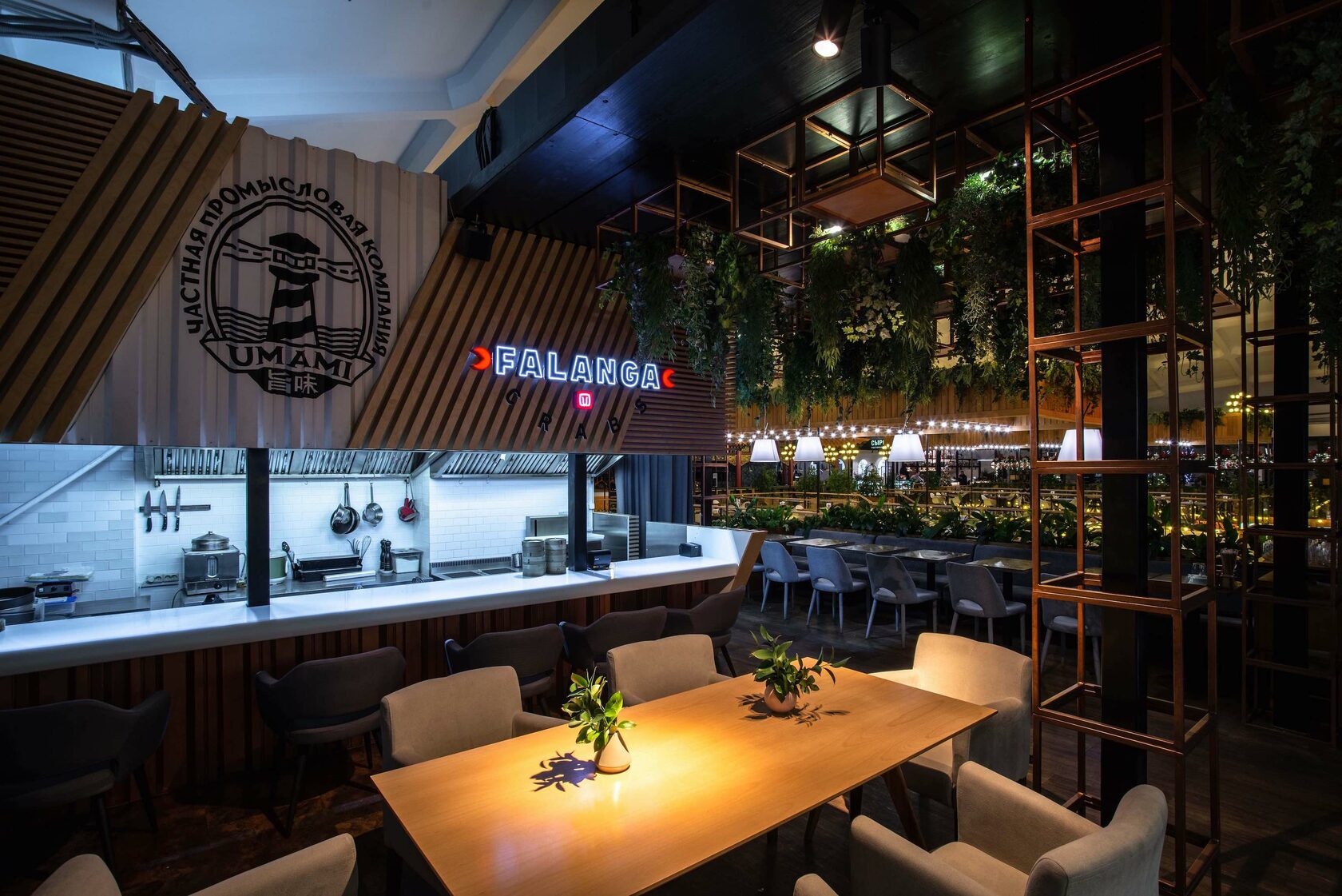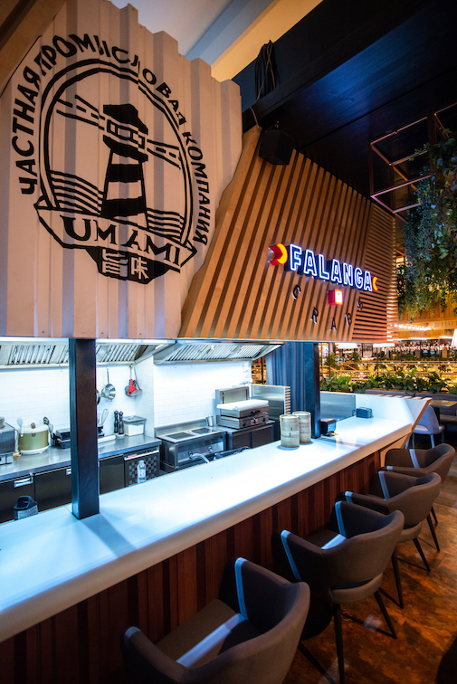 Концепция ресторана UMAMI заключалась в создании антуража улицы с паназиатской кухней во всем ее разнообразии от суши-баров до лапшичных.