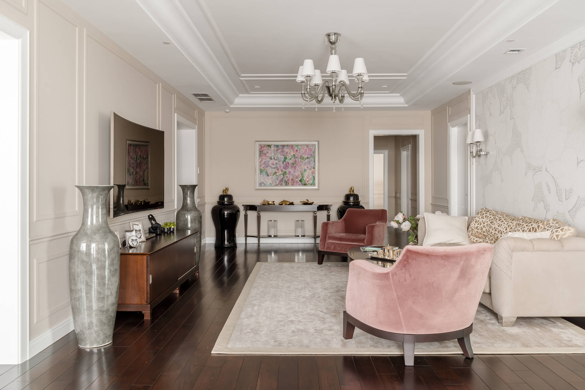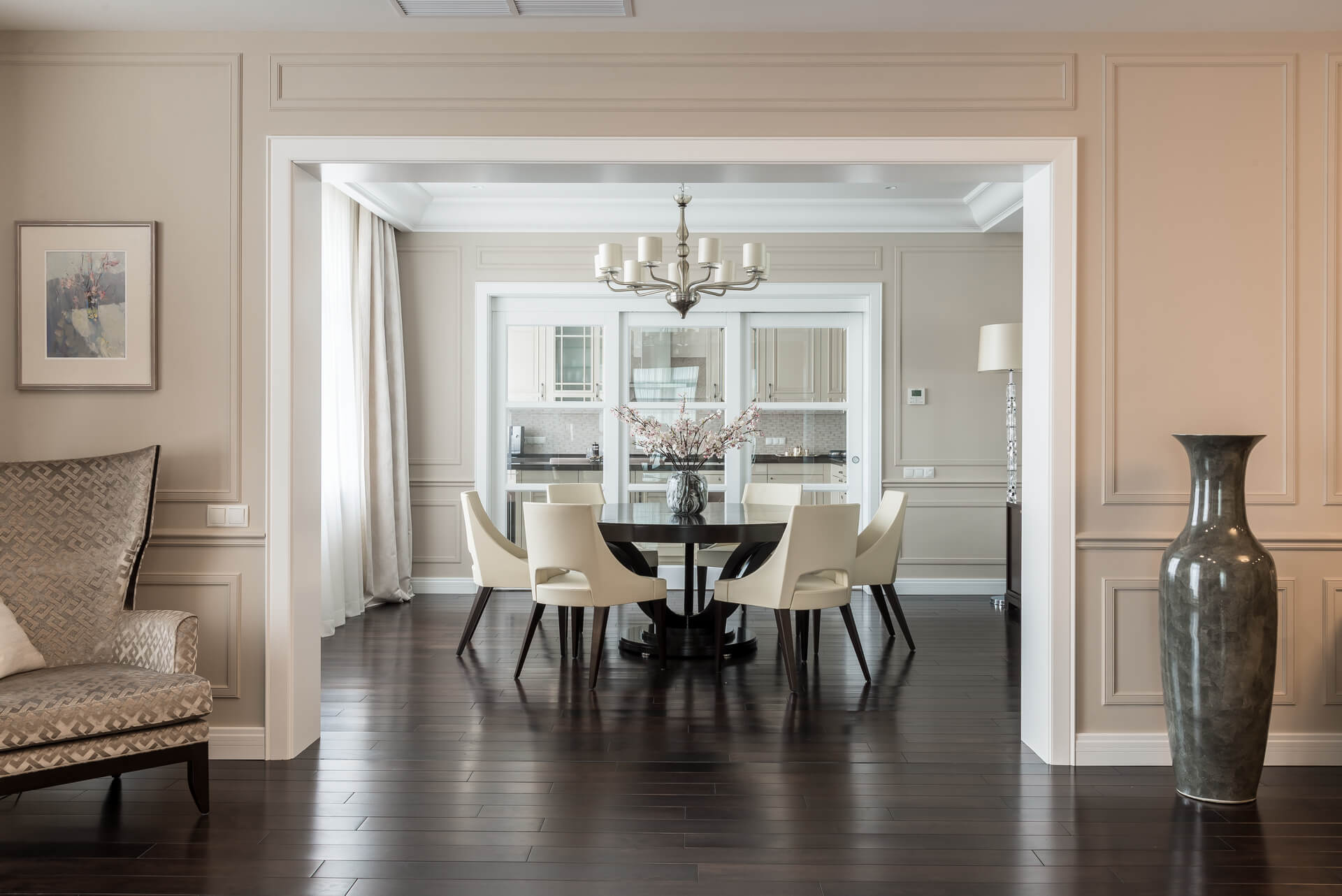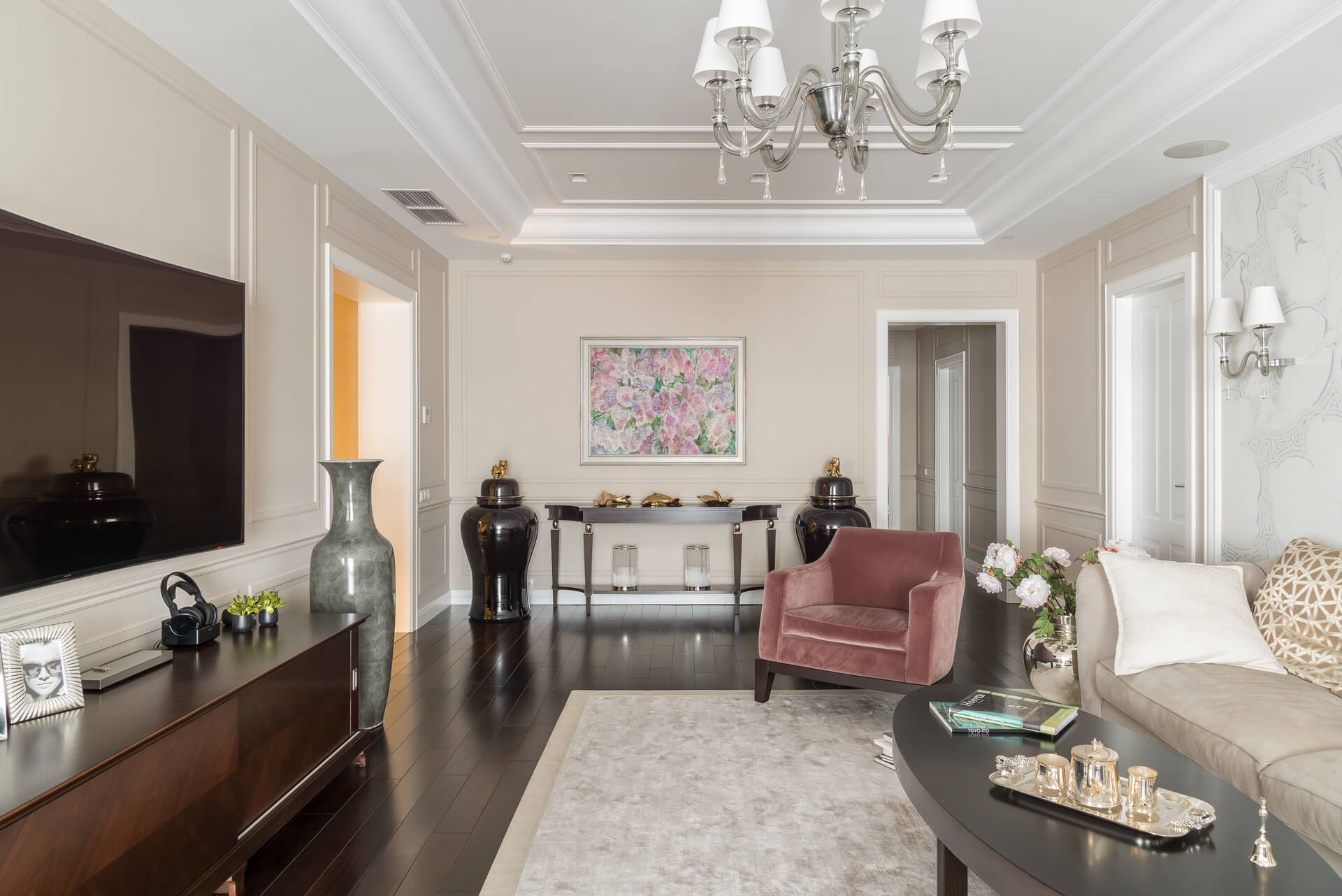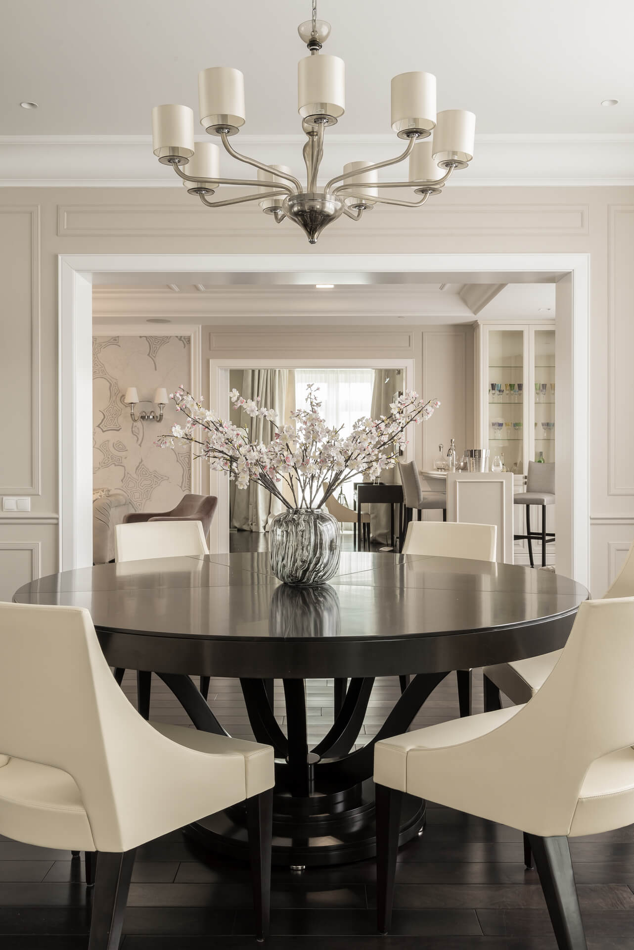 Интерьер квартиры выдержан в светлых тонах, сочетая классическую элегантность с современными акцентами. Мягкая мебель и ровные линии создают чувство простора и комфорта, а декоративные элементы добавляют утонченности. Кухня, отделенная от обеденной зоной стеклянными дверьми, делает пространство идеальным для приема гостей и семейных вечеров.