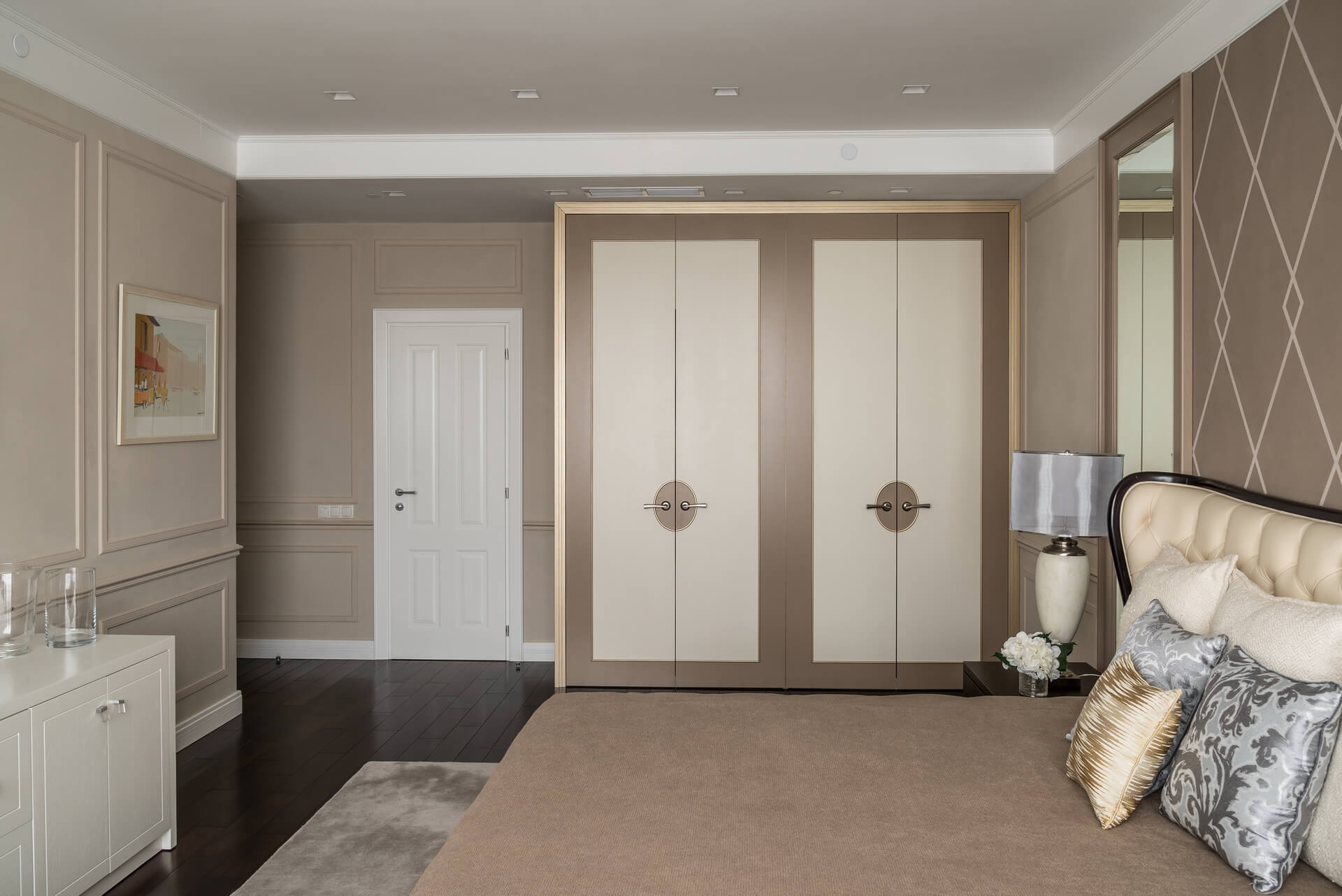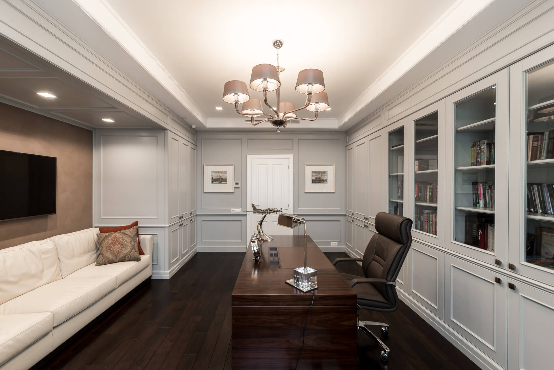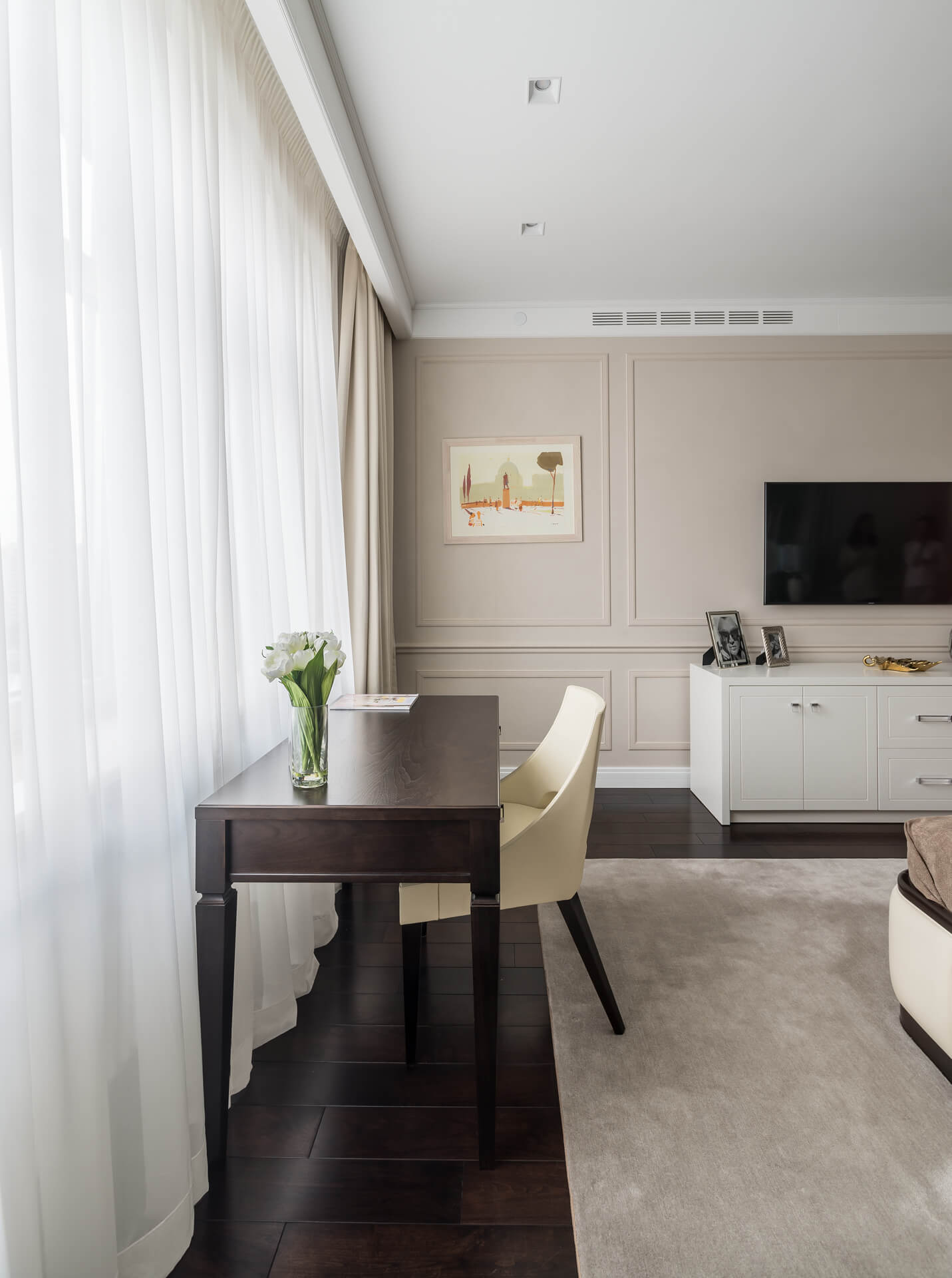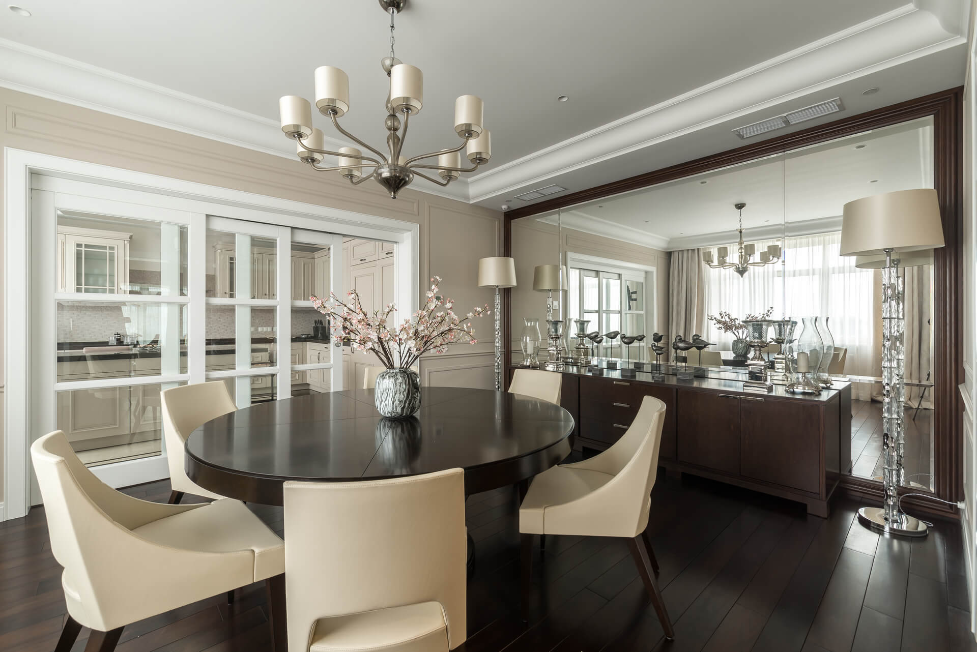 Интерьер квартиры выдержан в светлых тонах, сочетая классическую элегантность с современными акцентами. Мягкая мебель и ровные линии создают чувство простора и комфорта, а декоративные элементы добавляют утонченности. Кухня, отделенная от обеденной зоной стеклянными дверьми, делает пространство идеальным для приема гостей и семейных вечеров.