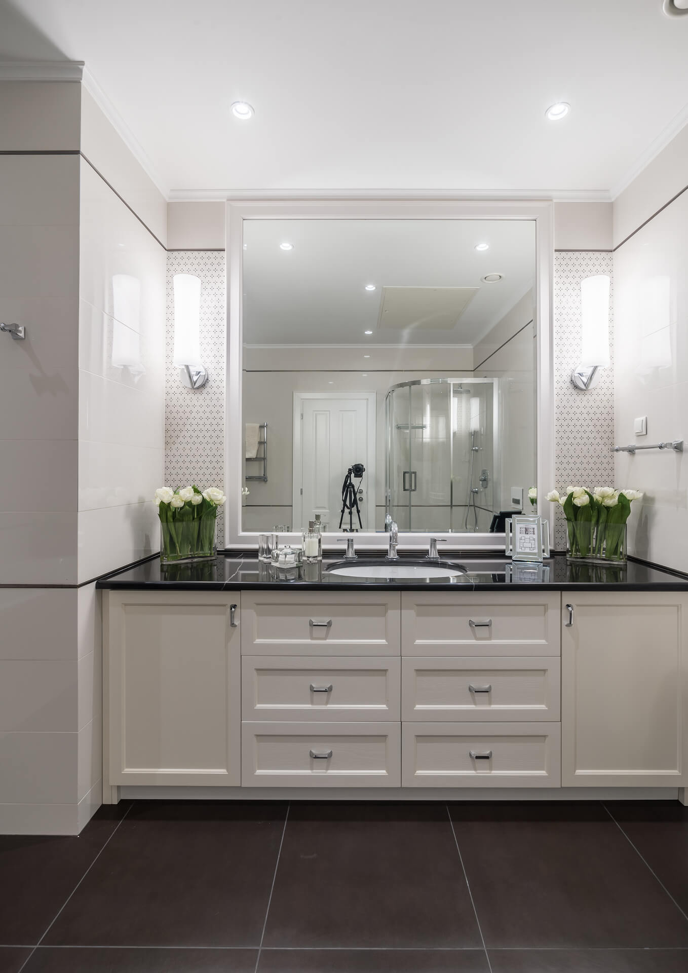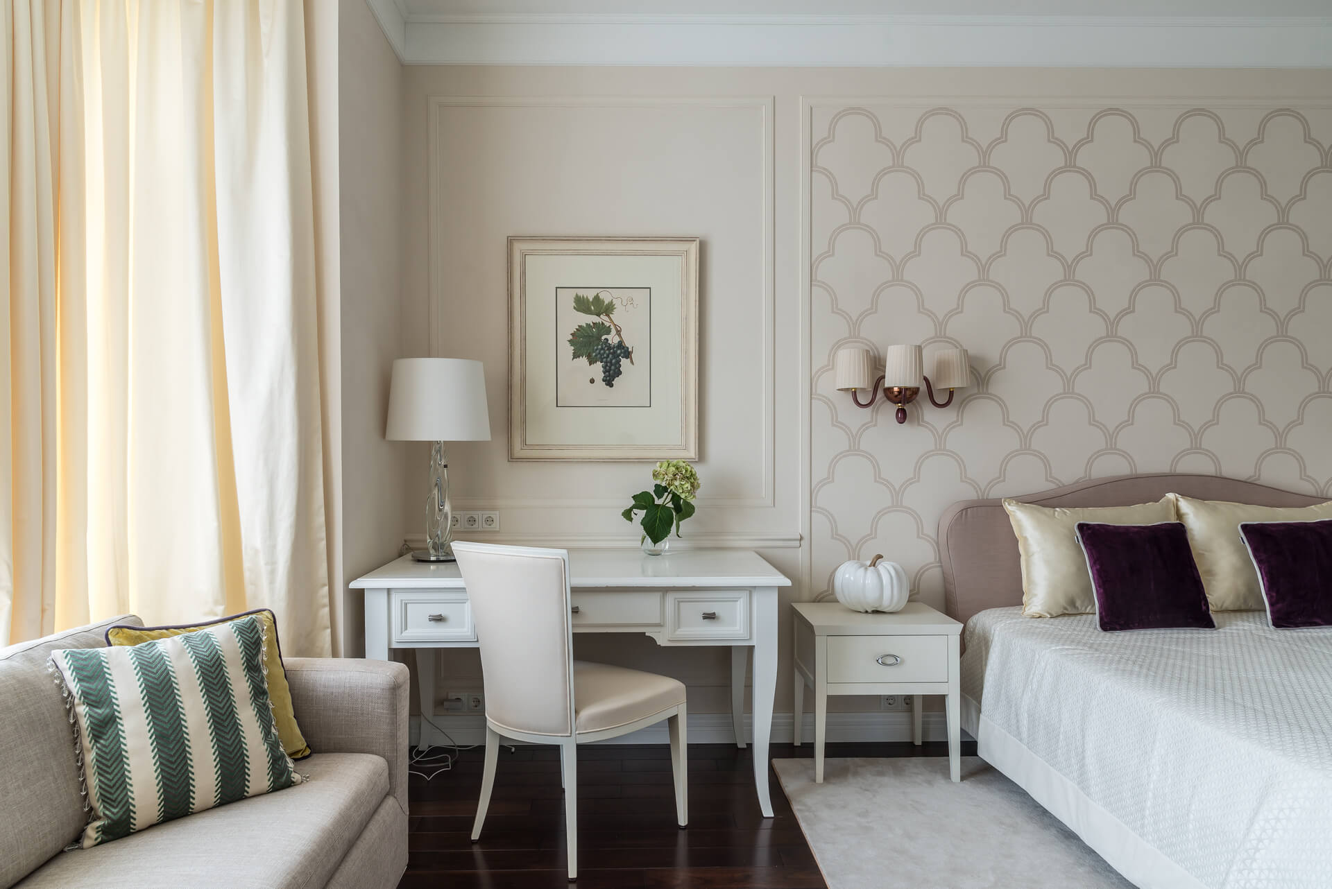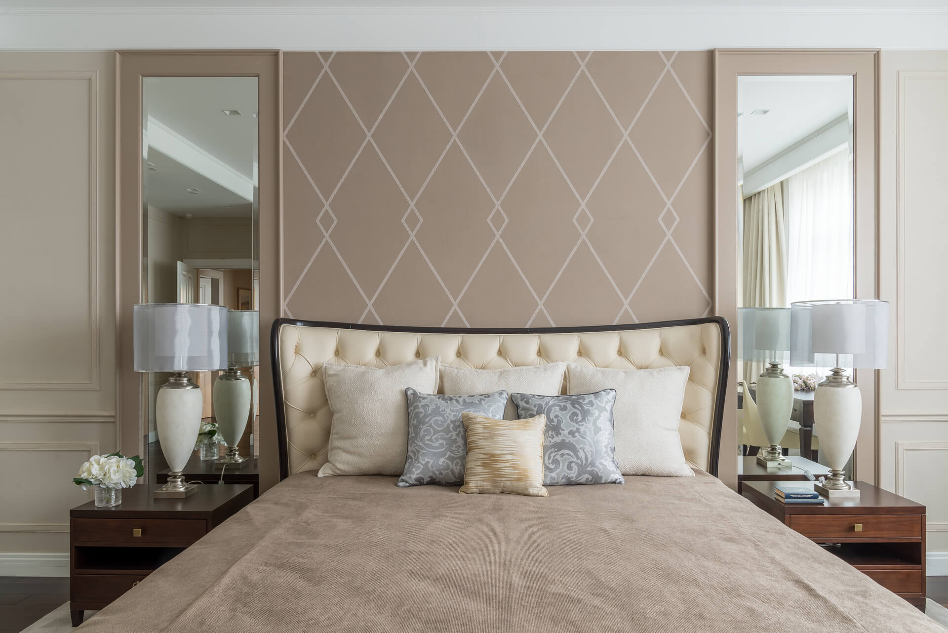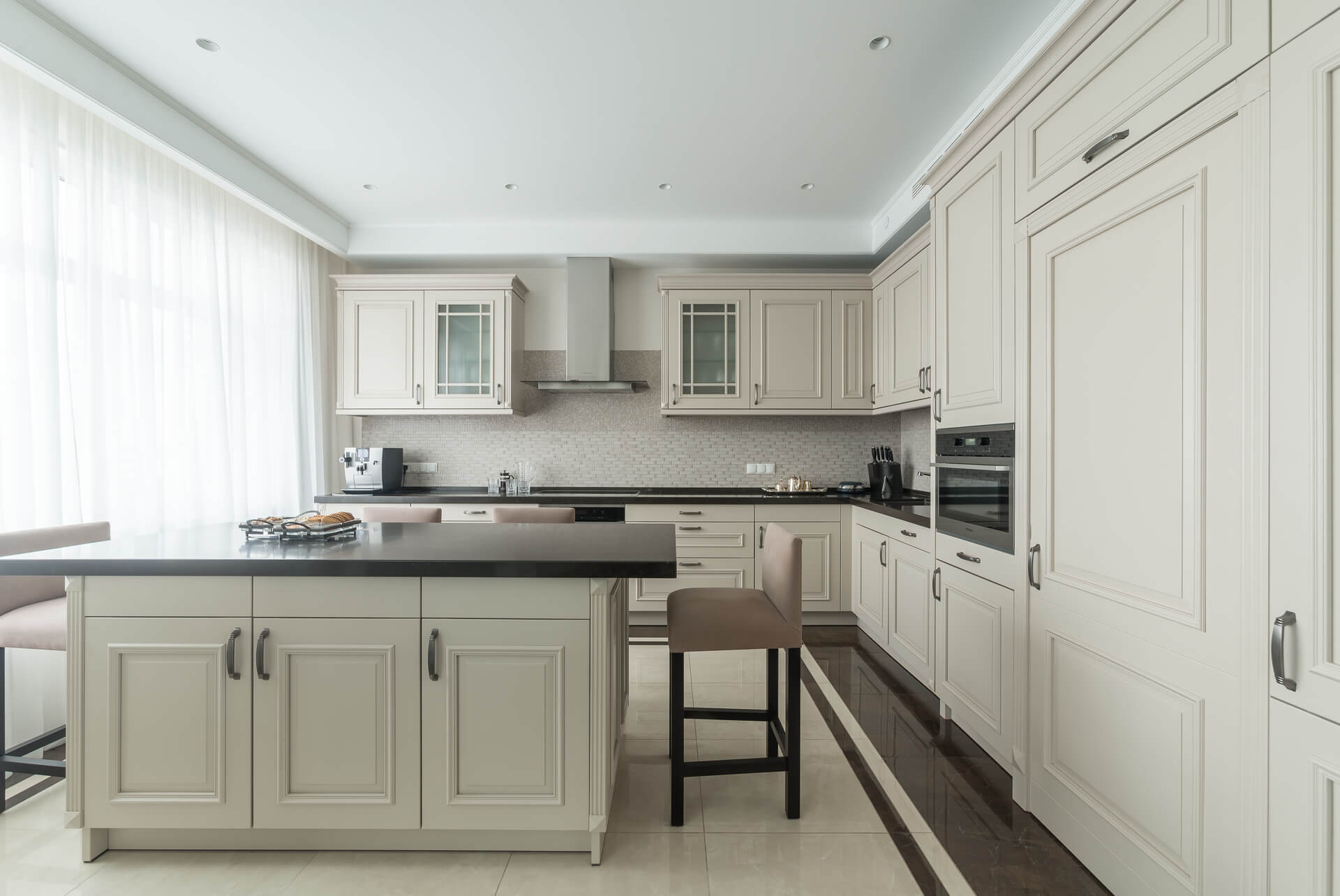 Интерьер квартиры выдержан в светлых тонах, сочетая классическую элегантность с современными акцентами. Мягкая мебель и ровные линии создают чувство простора и комфорта, а декоративные элементы добавляют утонченности. Кухня, отделенная от обеденной зоной стеклянными дверьми, делает пространство идеальным для приема гостей и семейных вечеров.